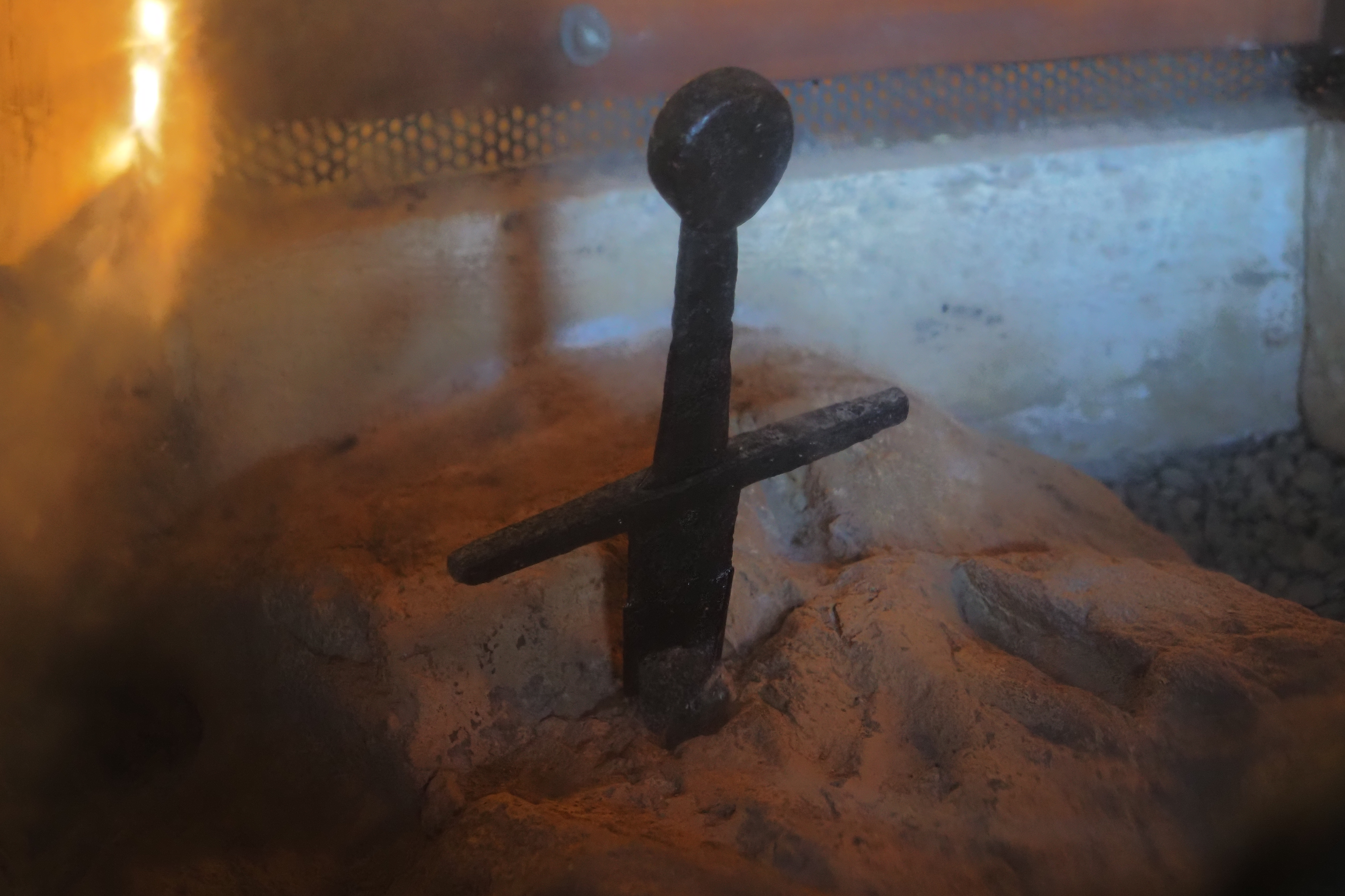 それにしても、いくら鋼の剣とはいえ 岩に突き立てたら岩が砕けるか、剣が折れるかのはずだけど、実際目の前に岩に突き刺さった12世紀の剣がある。こういうのを見ると、物質主義的な近現代になる以前は 本当に神の啓示とか奇跡みたいな事があったのかも、、、と思わせてくれてロマンがある。本当に奇跡が起きたのか、あるいは極めて稀な何らかの物理現象の産物なのか、、、、それは見る人の解釈次第・・・