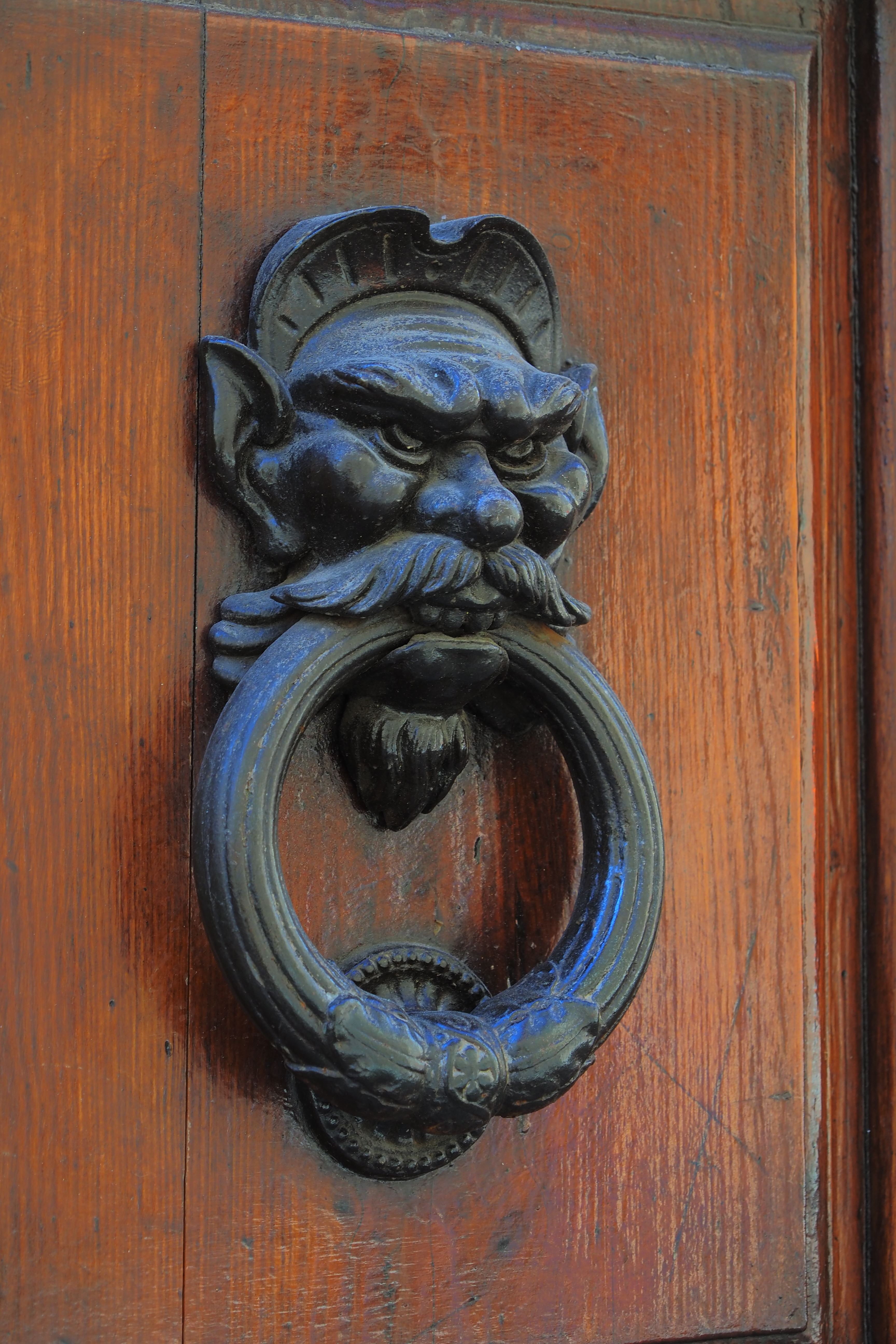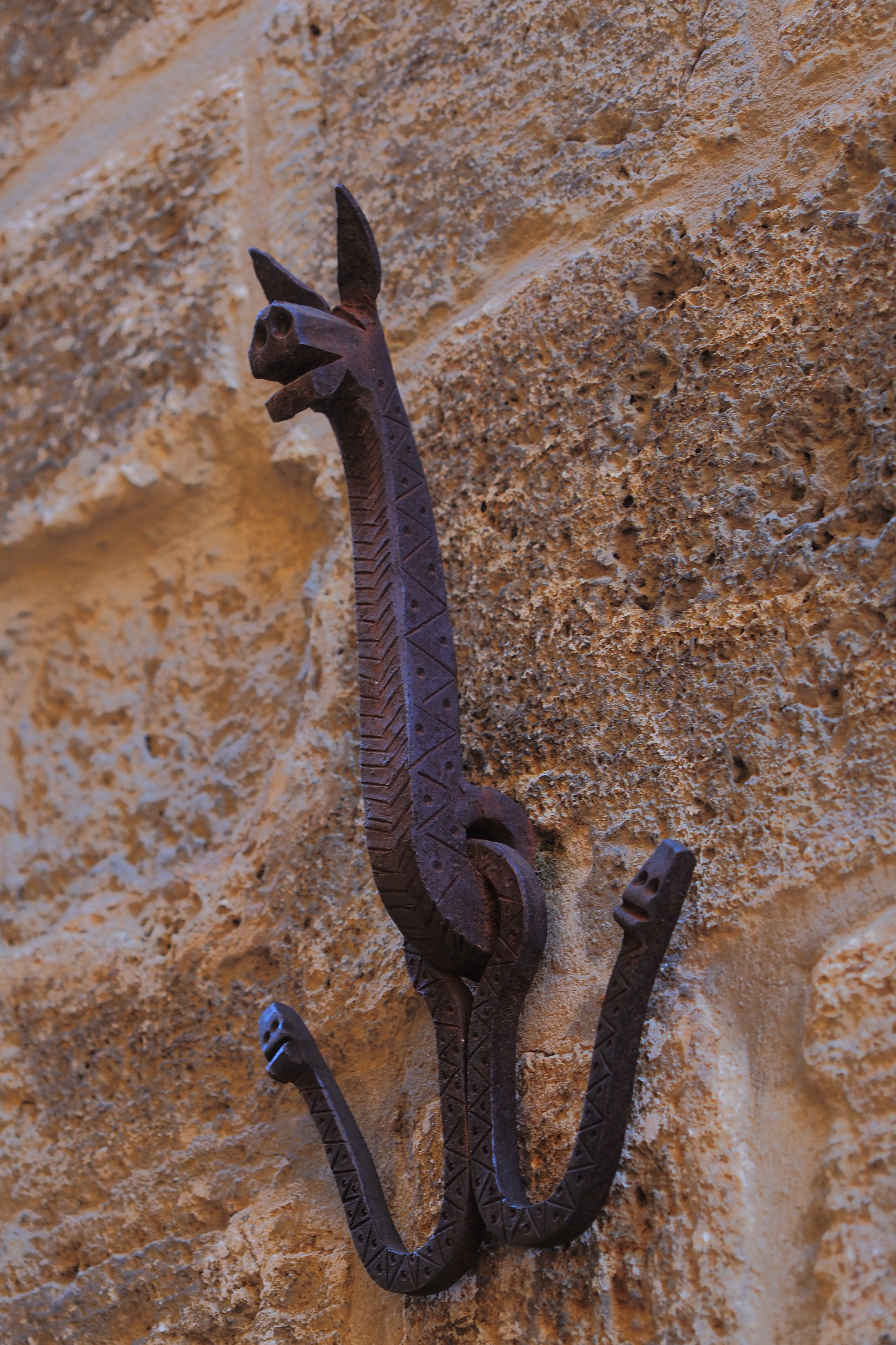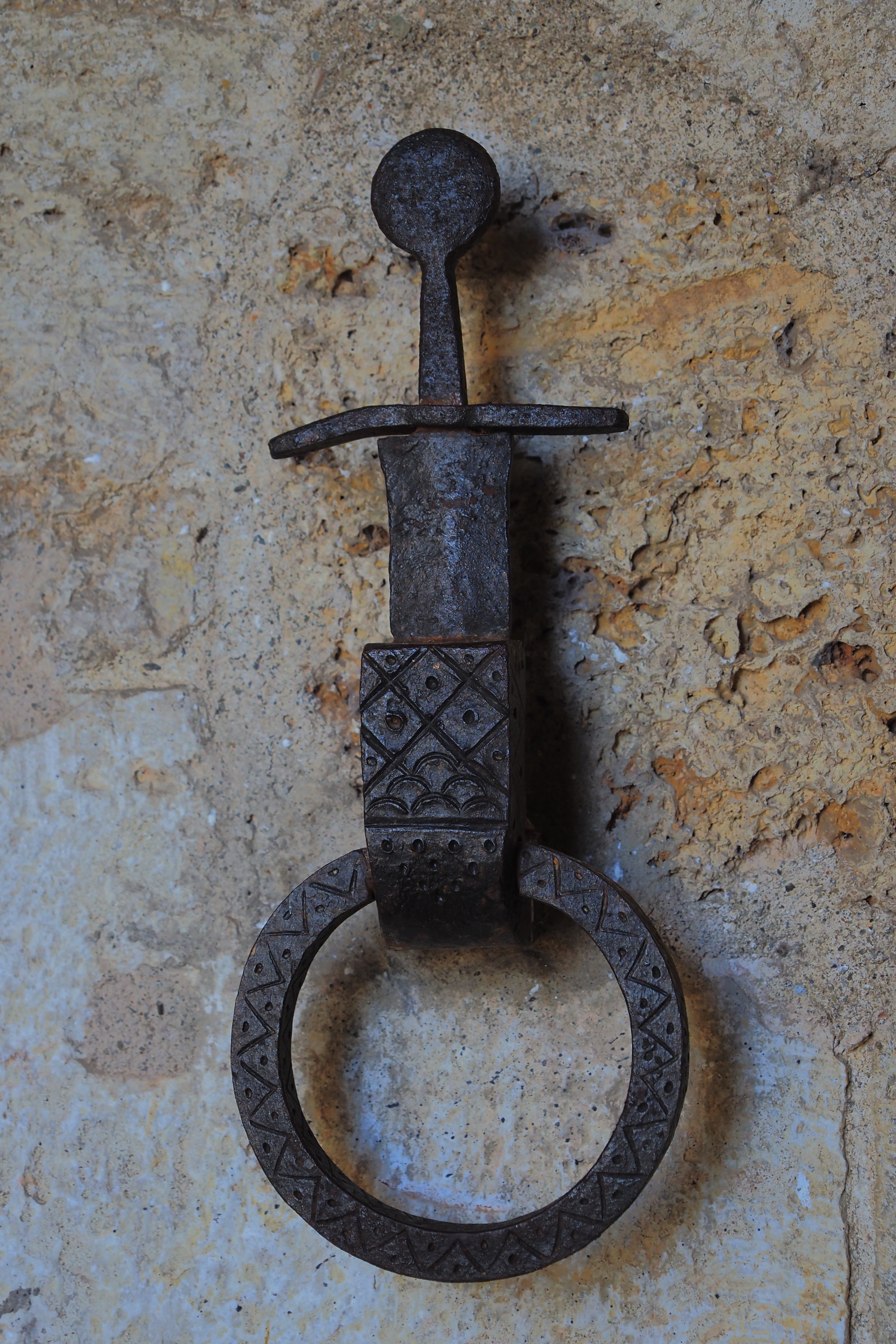 入口の脇には この礼拝堂にまつわる聖剣伝説を意匠にしたノッカーが。
