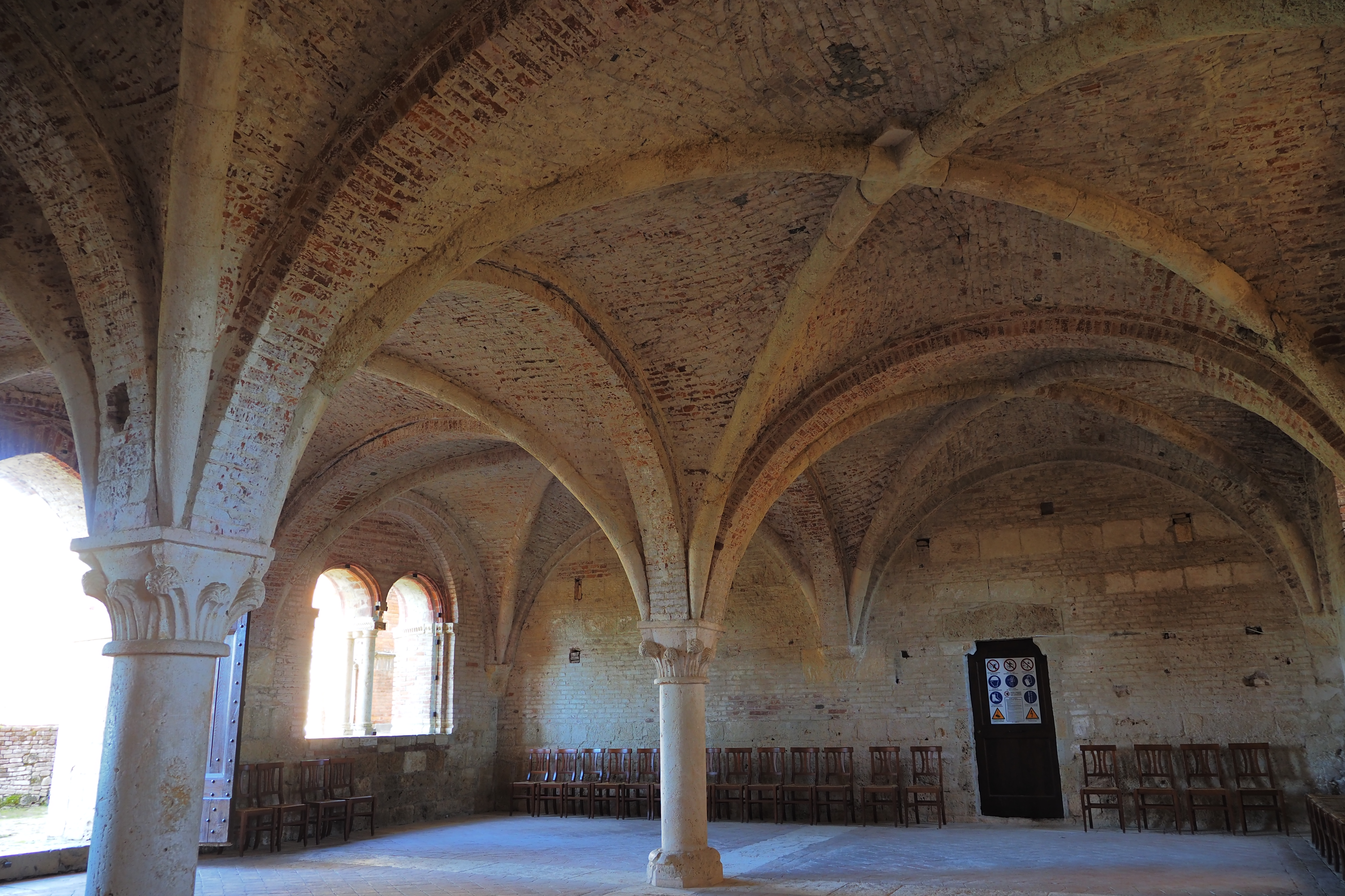 ベネディクト会に対する対抗 という眼目があったため、華美な装飾の類は極力排されて、シトー会の掲げた「清貧さ」が建築の細部に込められている。
