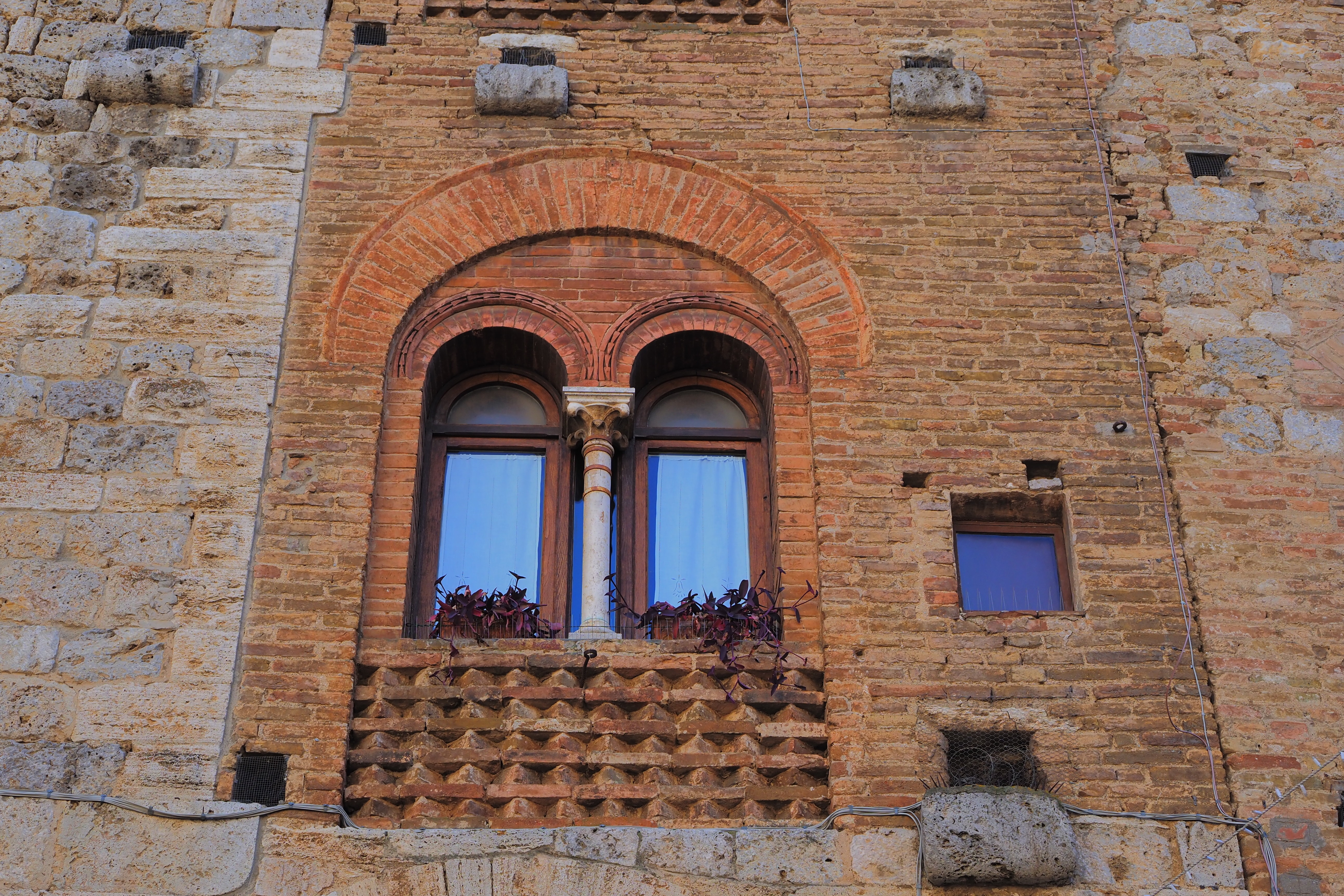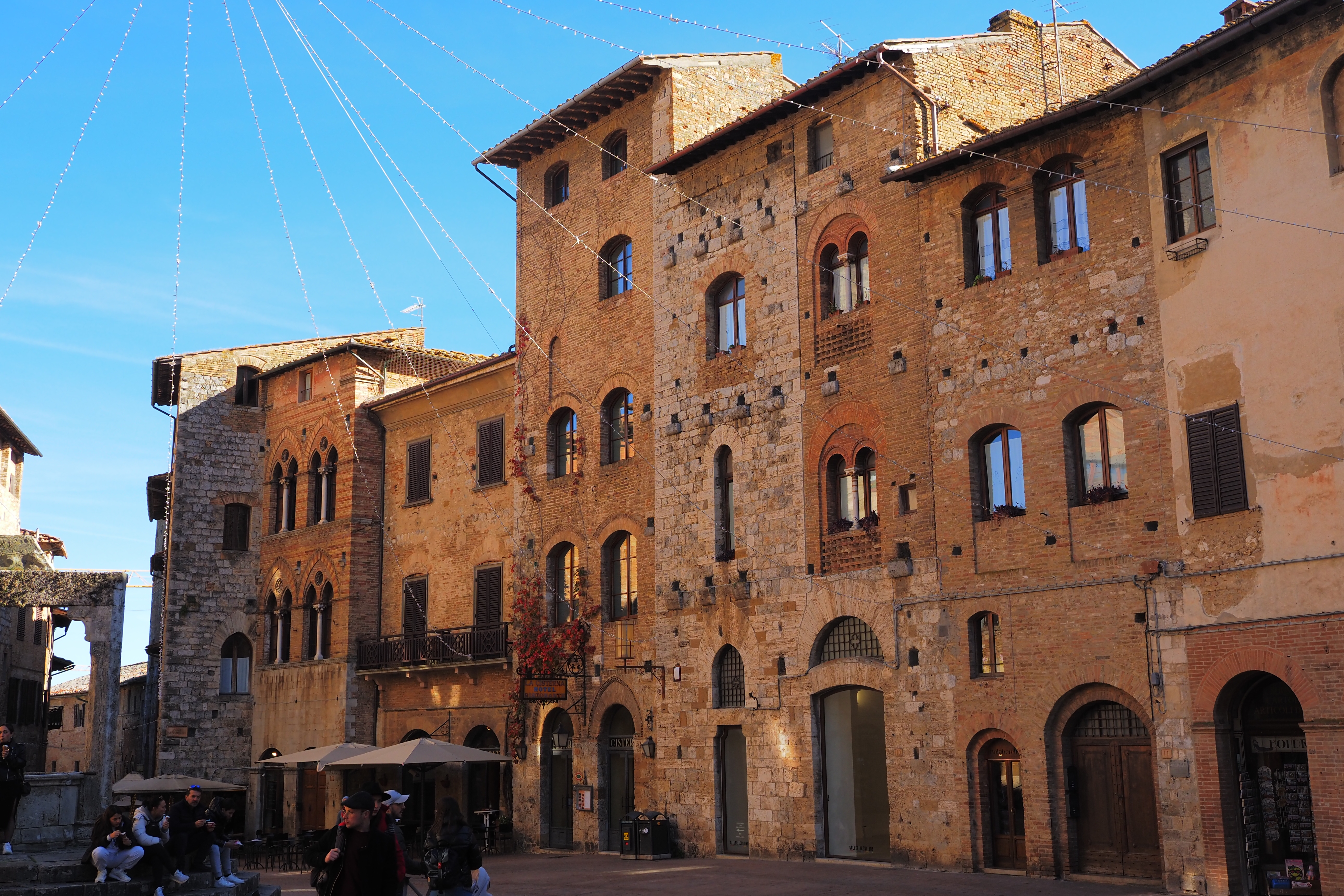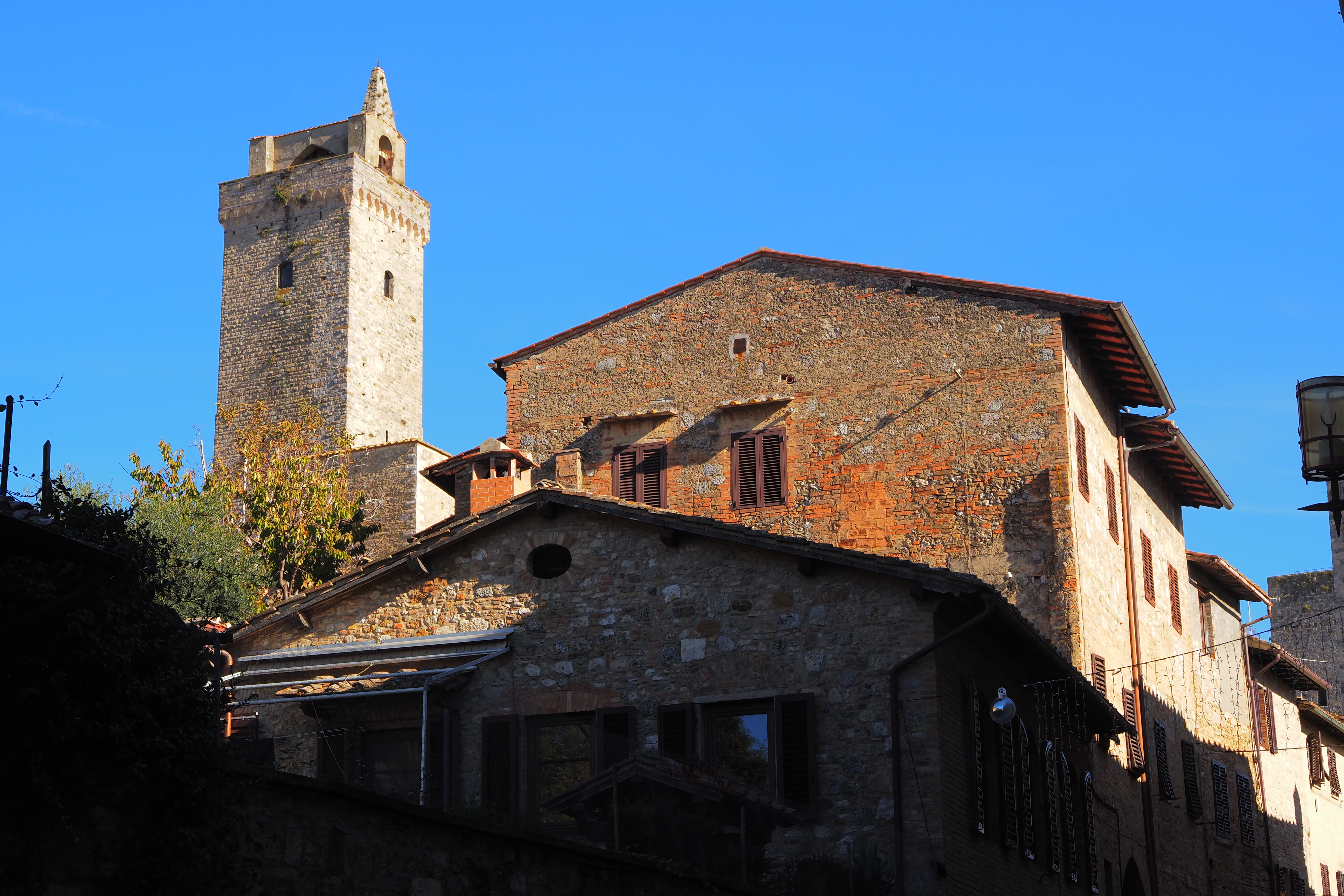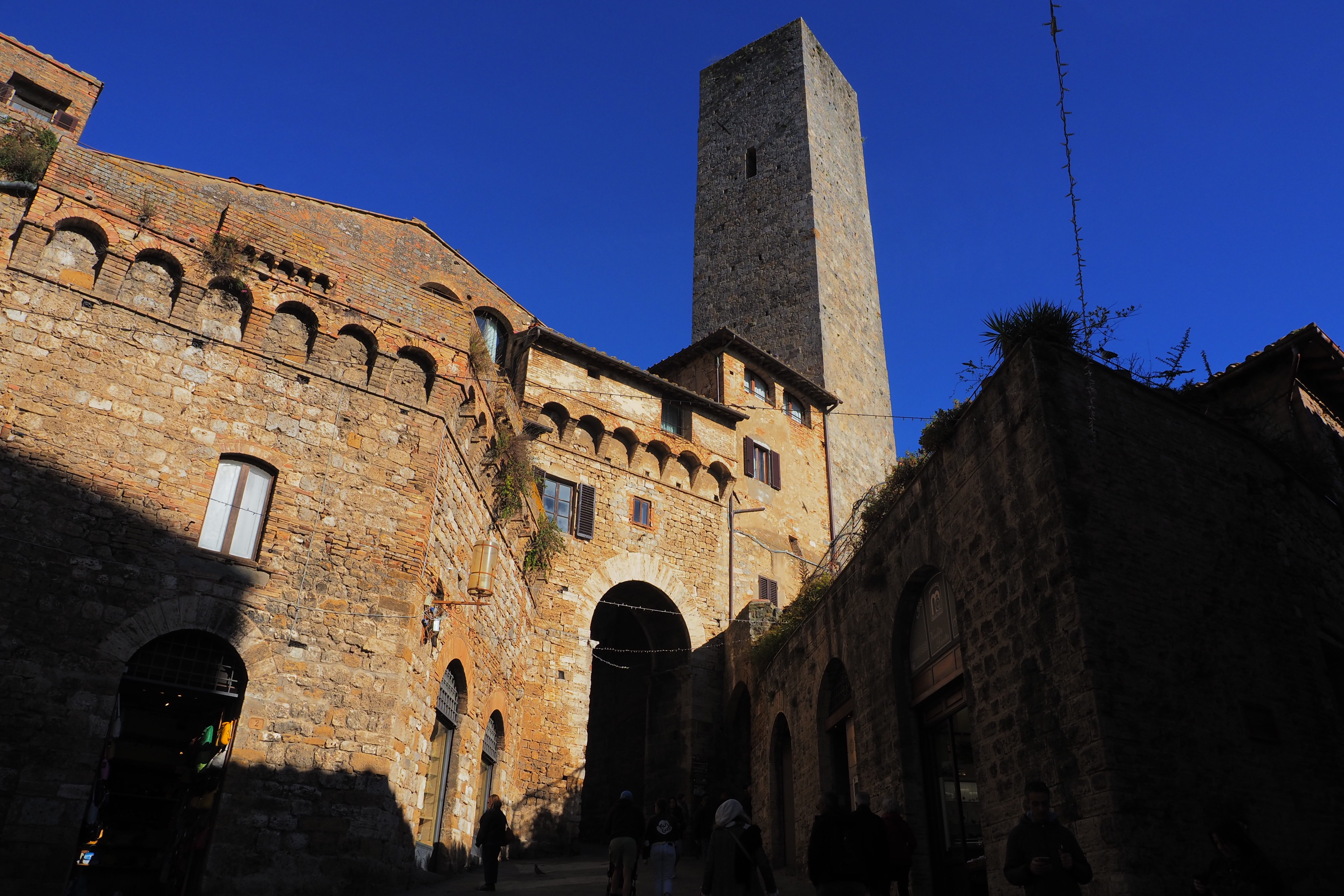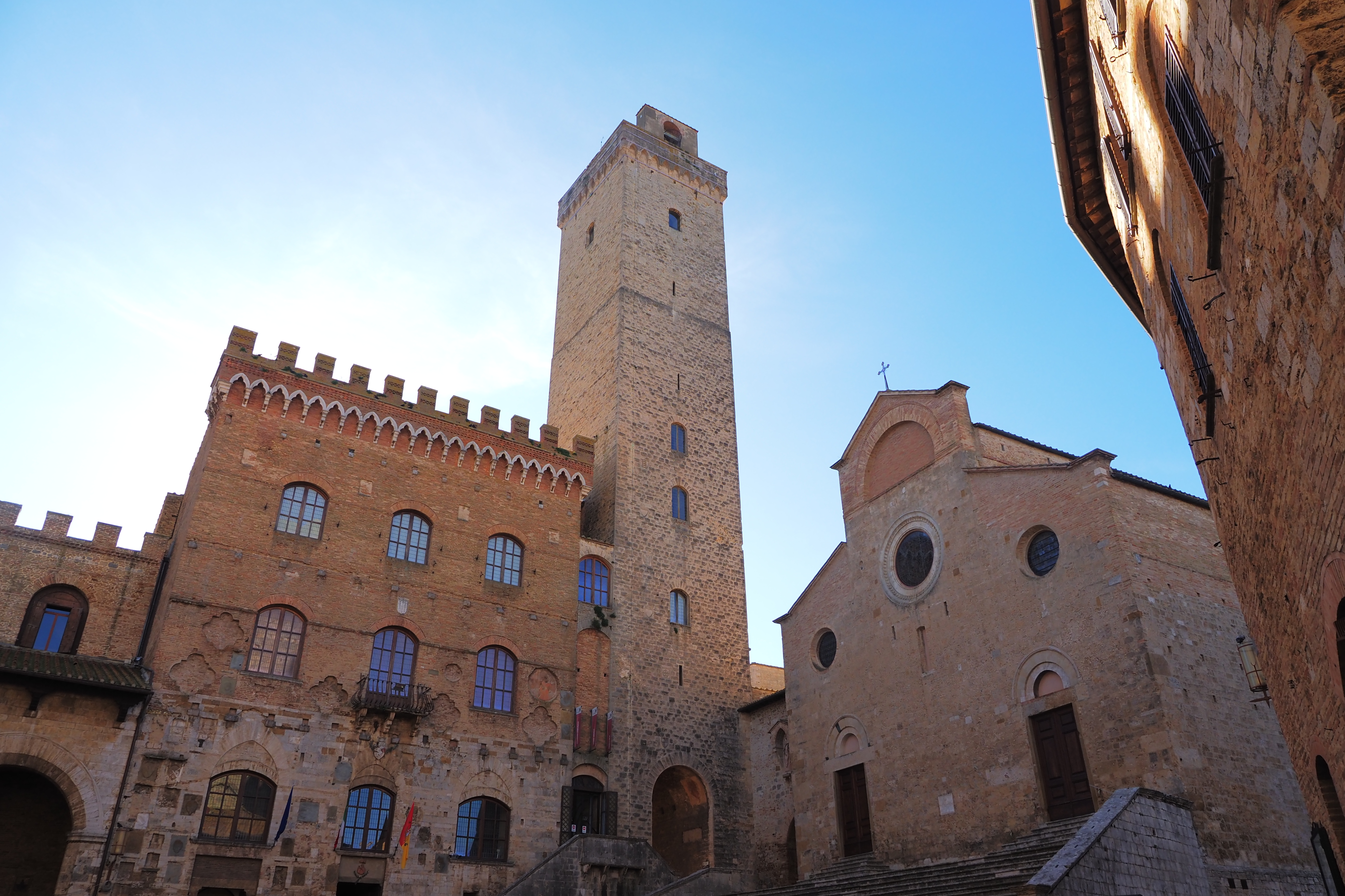 グロッサの塔の反対側が見えて、その脇には Palazzo del Popolo; ポポロ宮殿 とDuomo di San Gimignano;サン・ジミニャーノ教会が建つ。