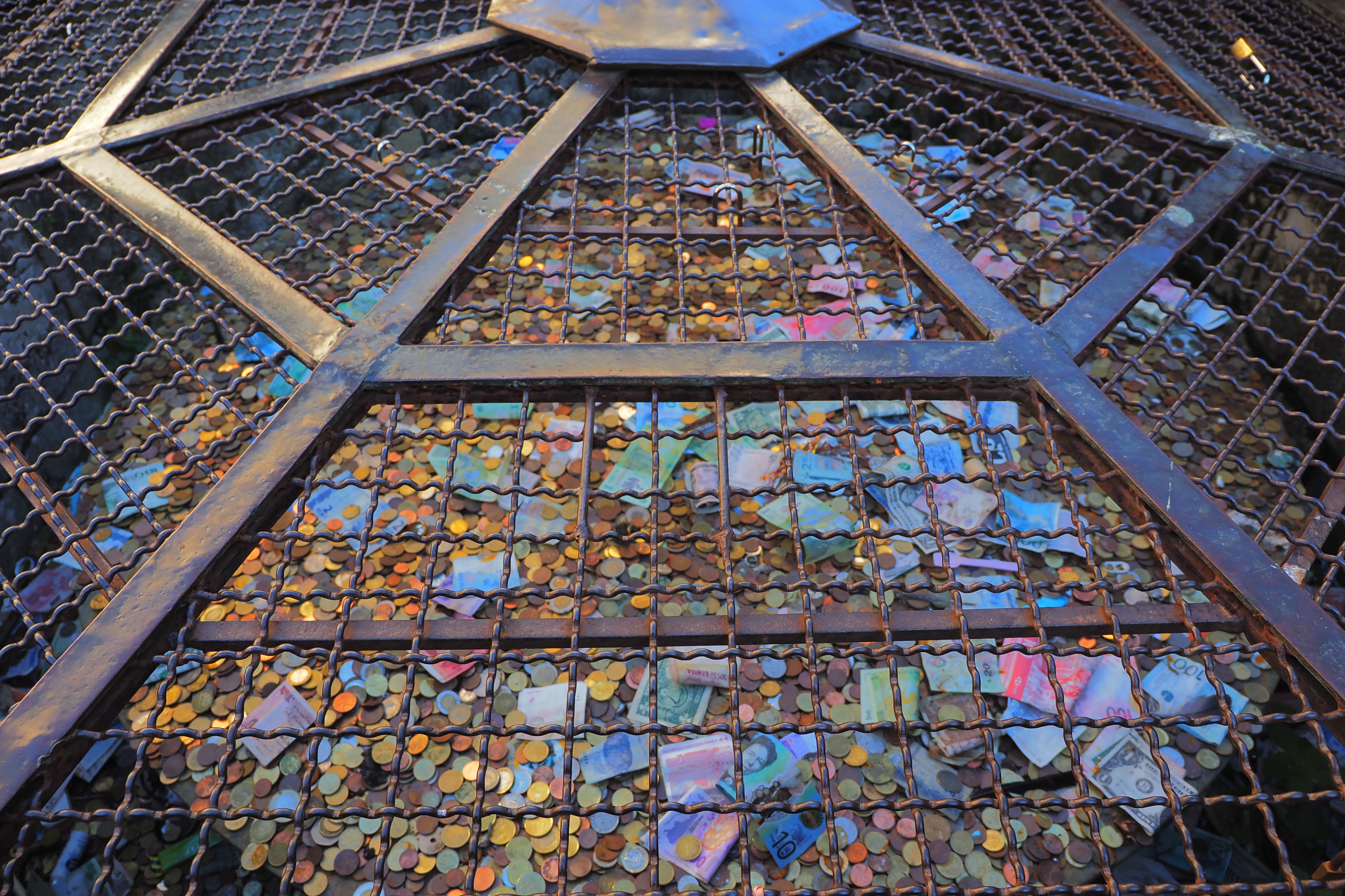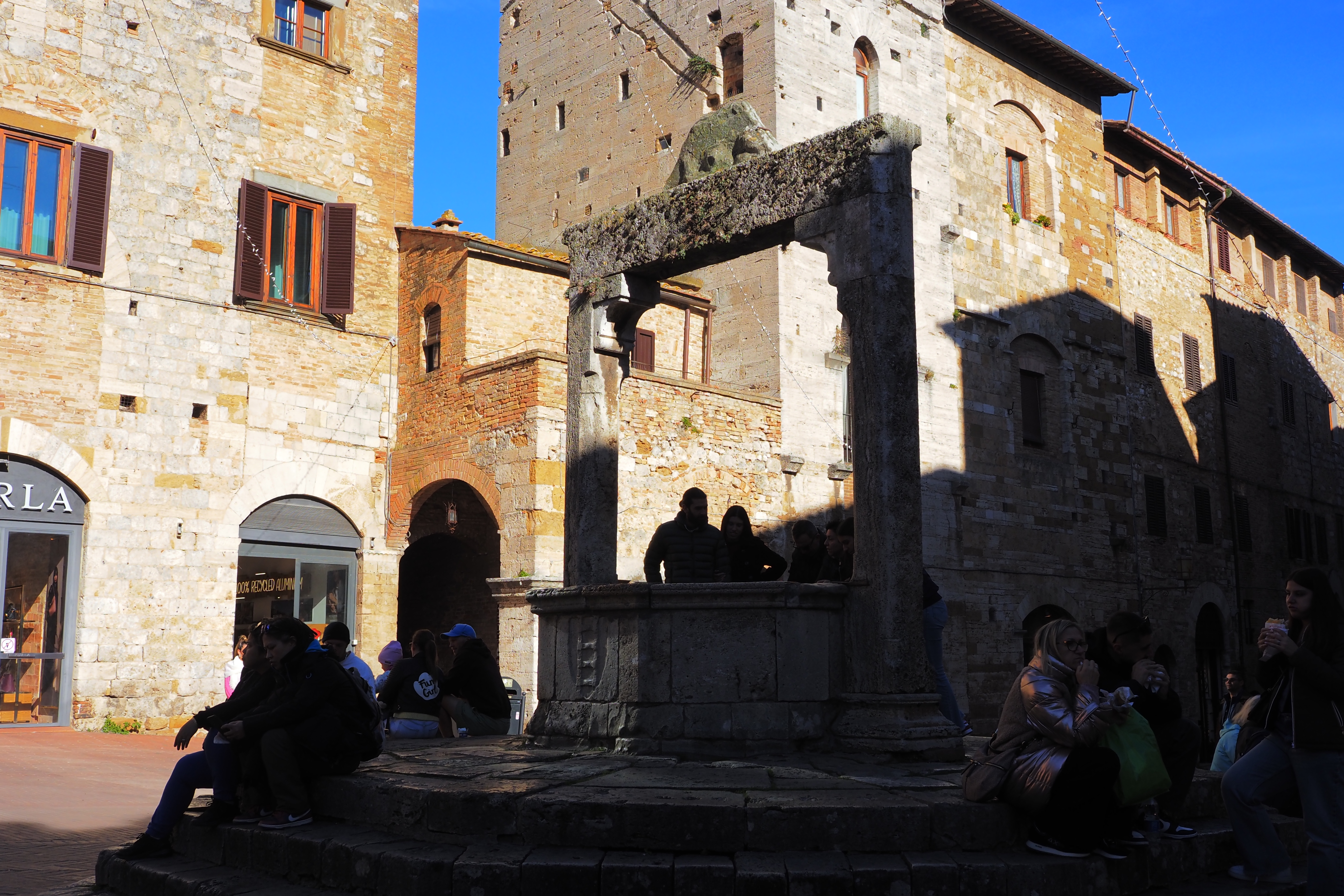 チステルナ広場の中央にある古い井戸は賽銭箱化していた。