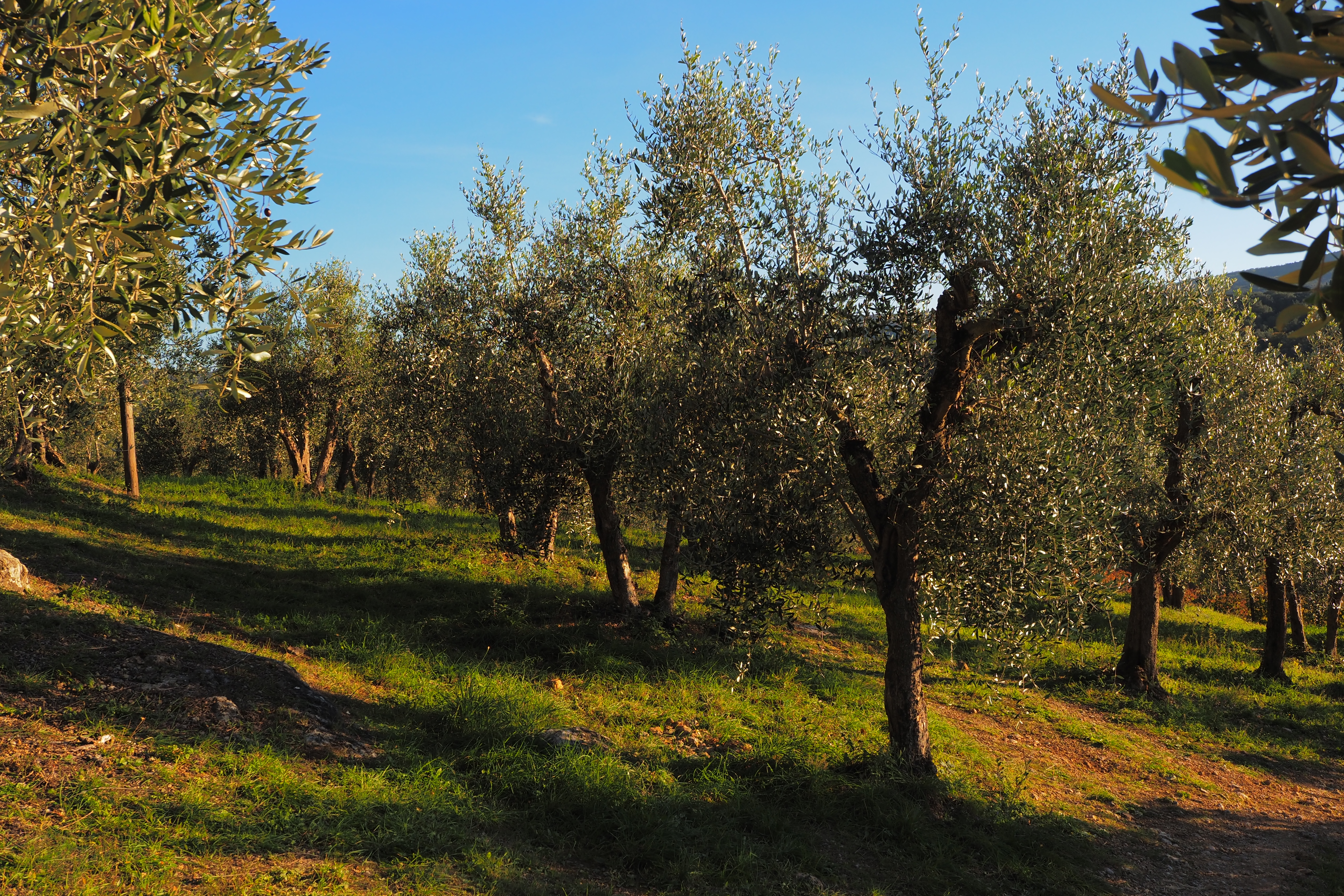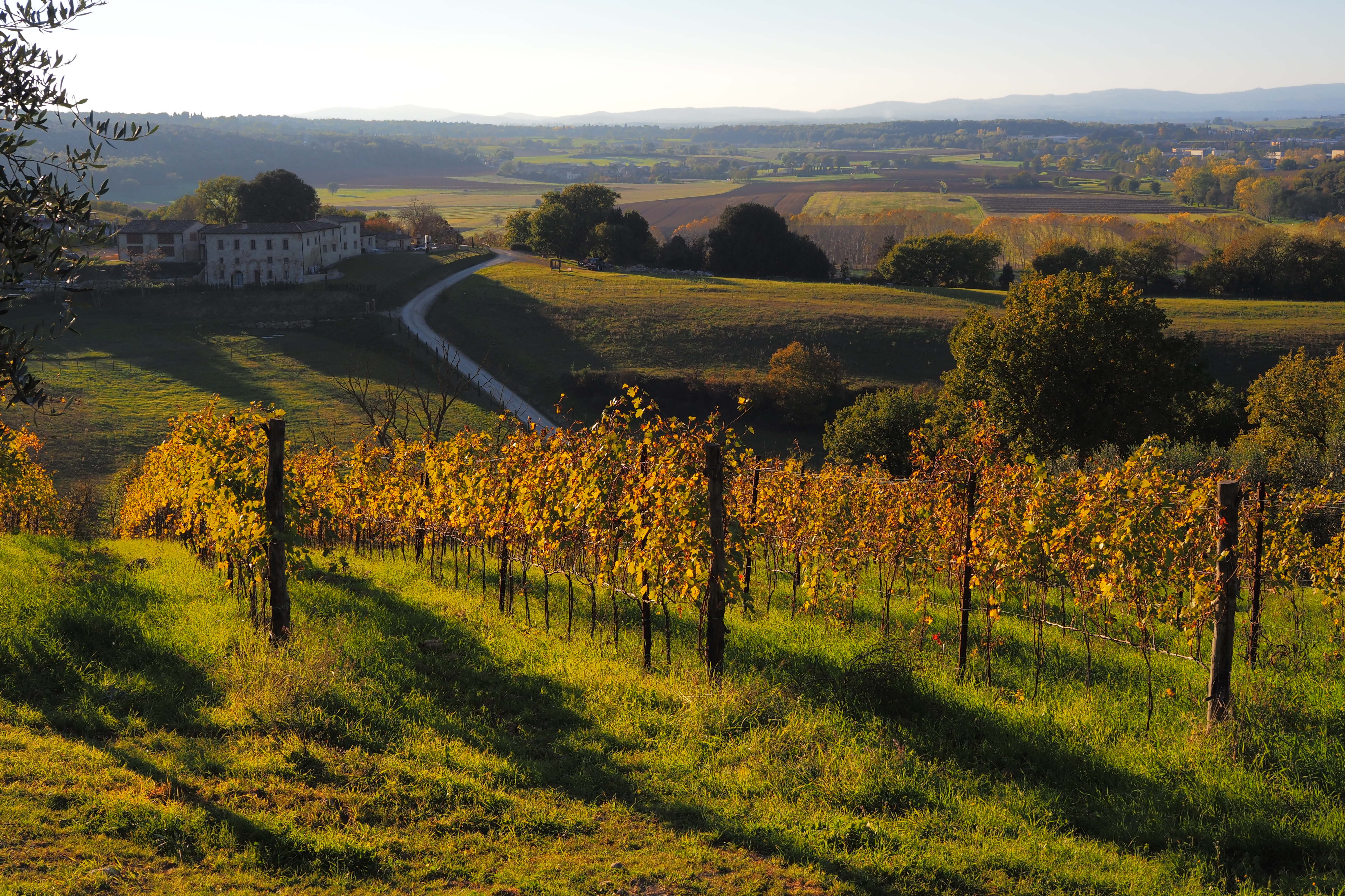 ブドウ畑とオリーブの木々が、西日を浴びて輝いている。