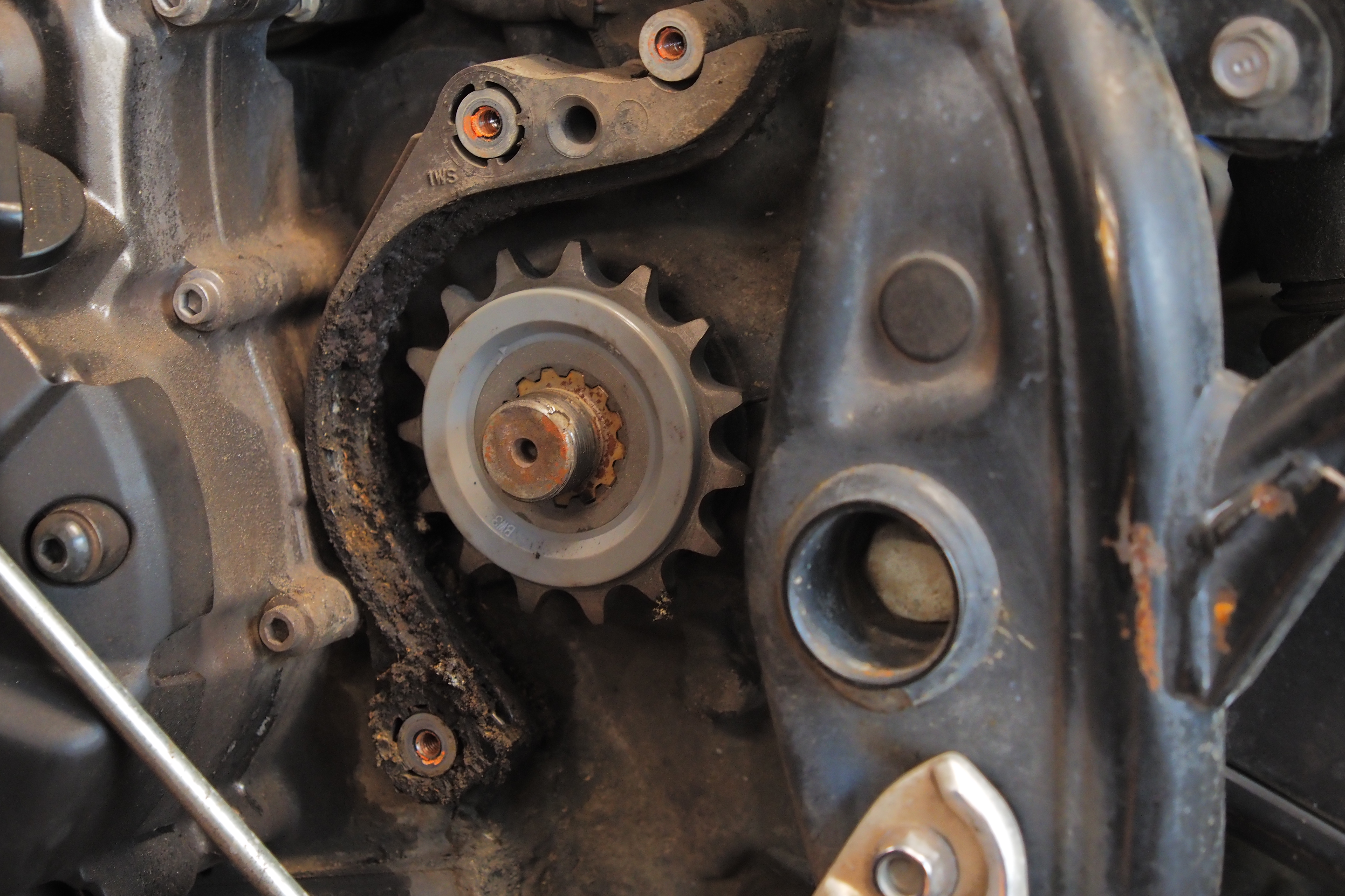 まずスプロケットカバーを外すと、、、ガイドの内側に