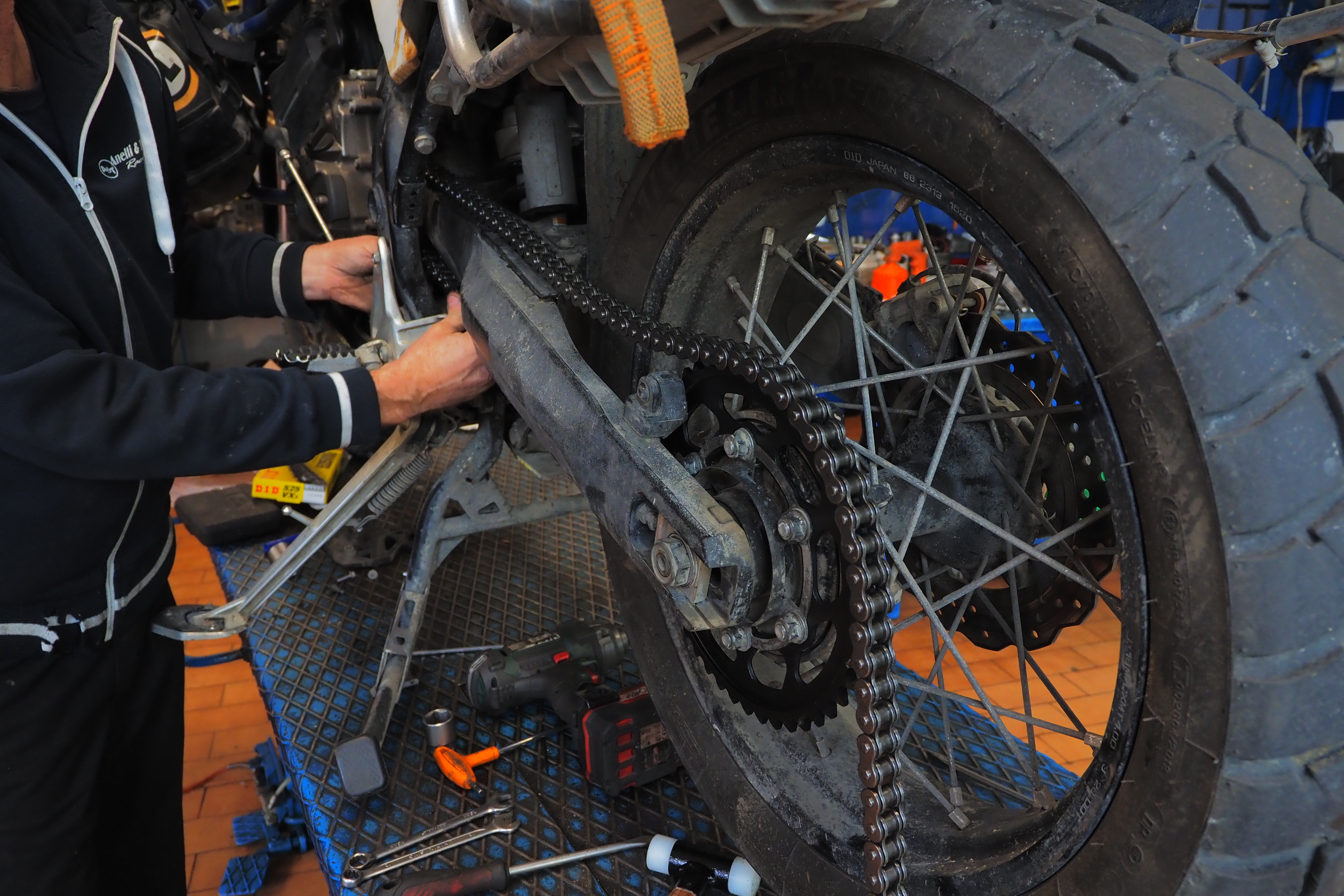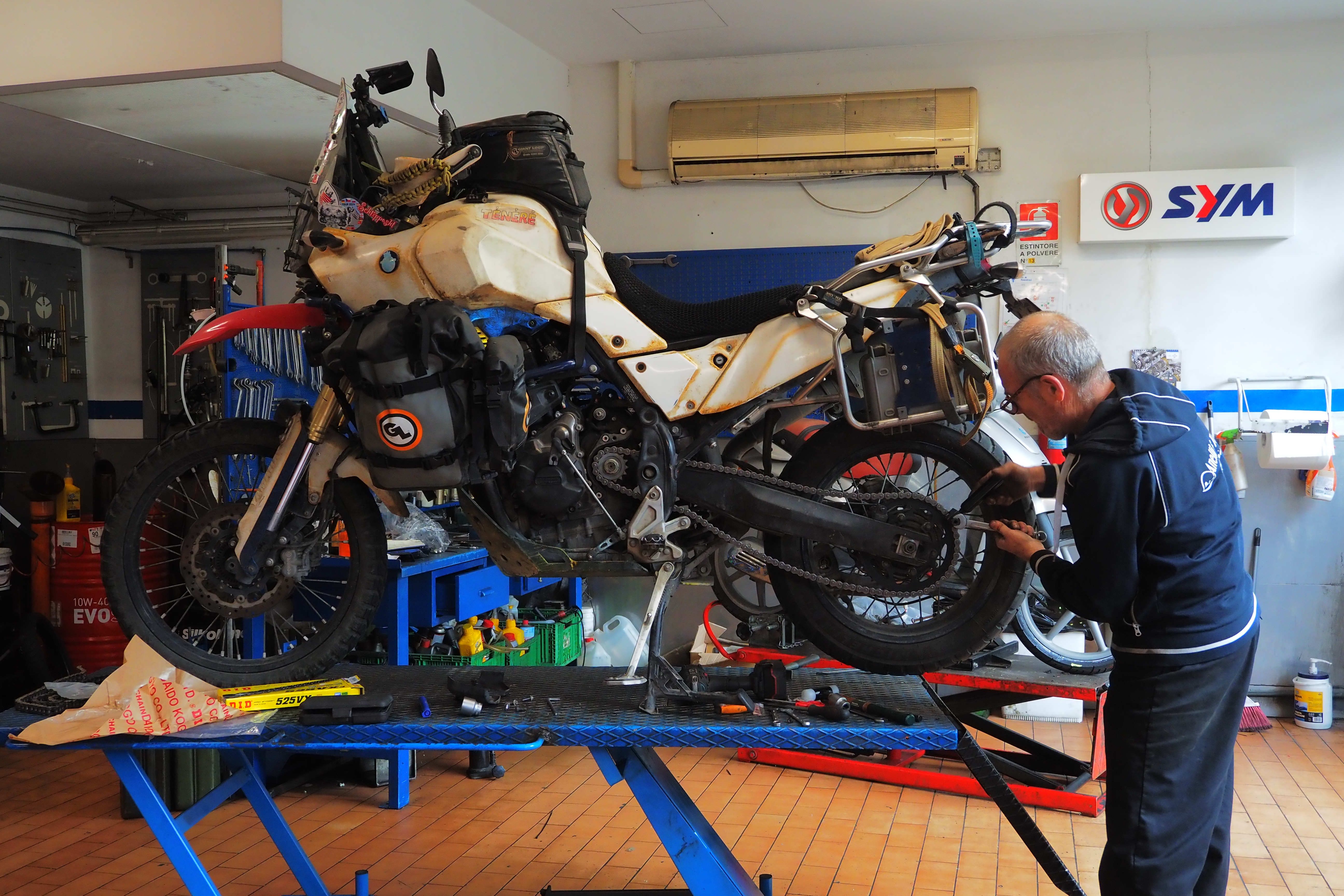 本来は、この後荷物を全部積んで なおかつライダーが跨った状態でチェンテンションを調整すべきなんだけど、荷物は外したまま来ちゃったので、少しルーズ目に調整してもらった。まぁ 3,000km くらい走ったところでまた自分でチェックしよう。