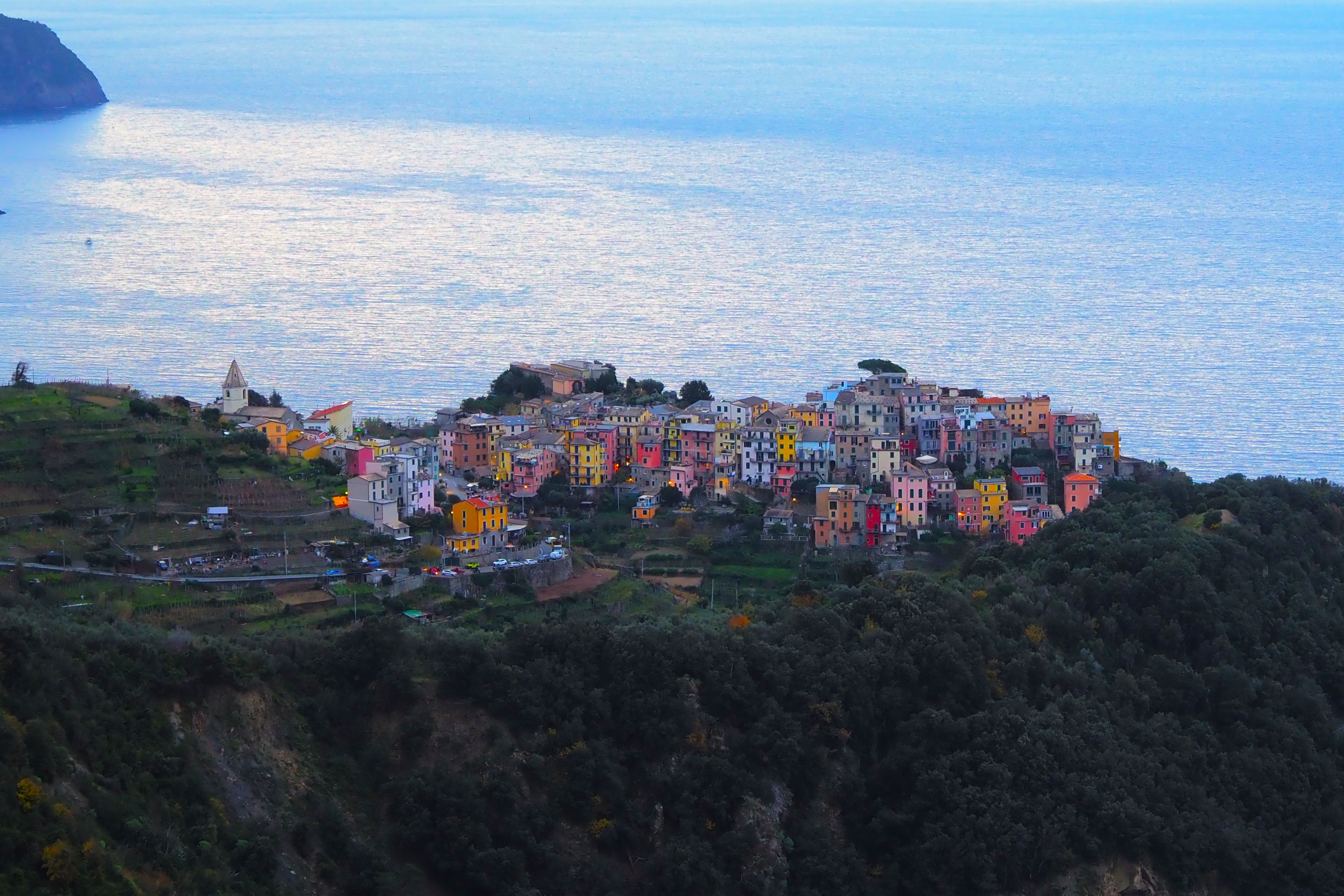 道をのぼったところからとらえたコルニリア。ポツポツと燈る街灯と、まるでミニチュアのような建物たち。