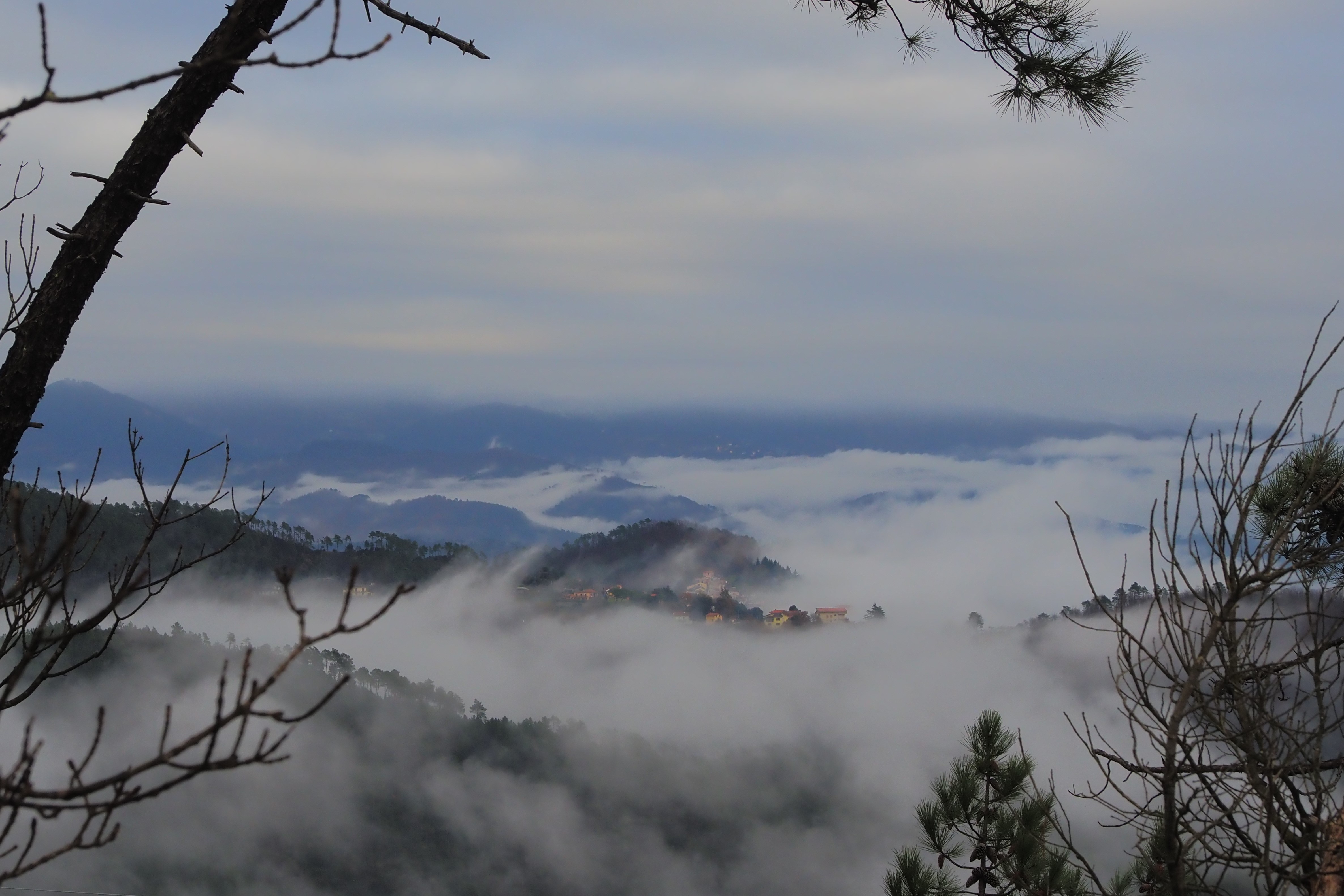 少し晴れかかった空、そしてゆらりゆらりと浮遊する濃霧、その間からちらりと除く稜線上の村・・・