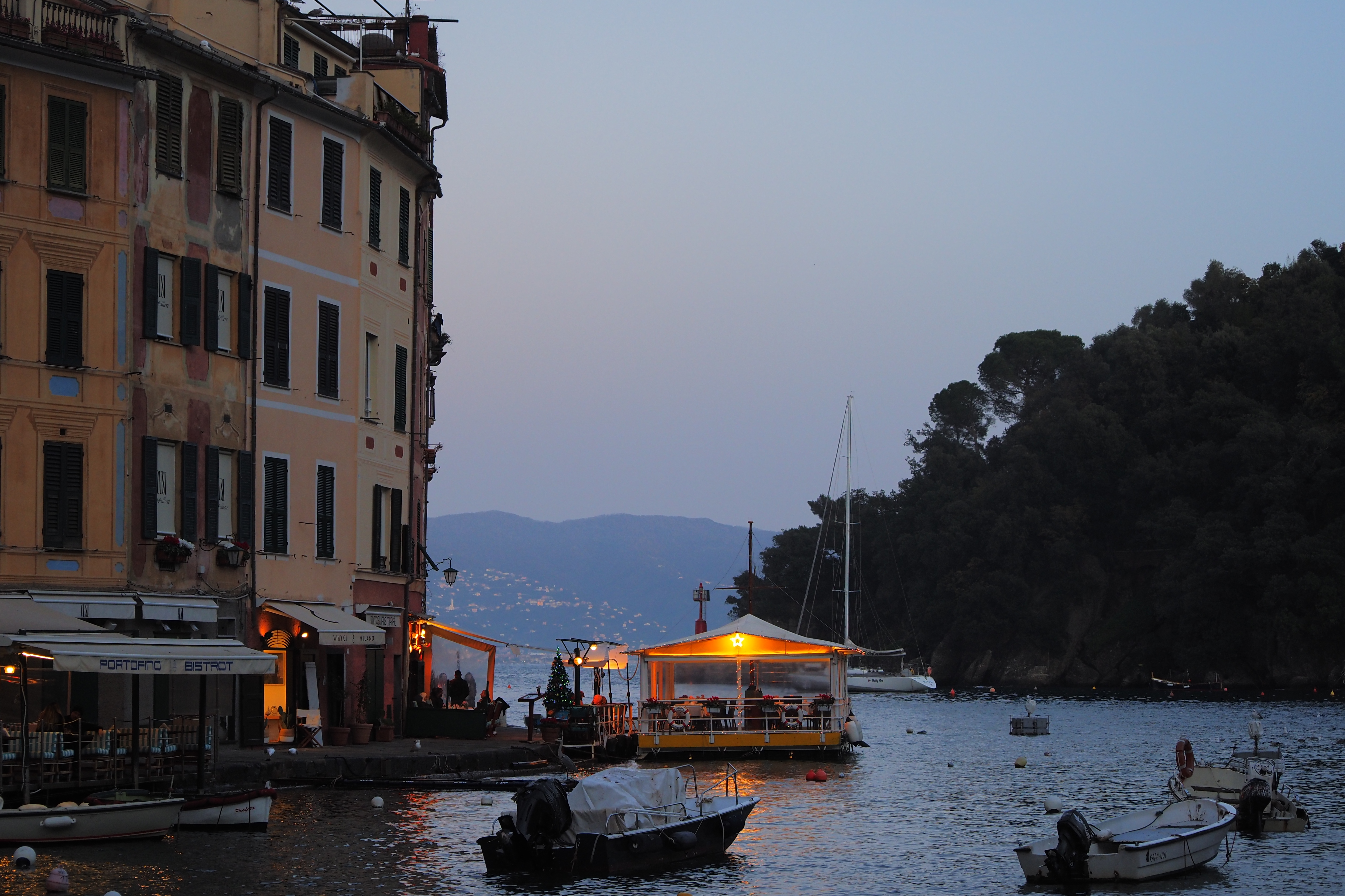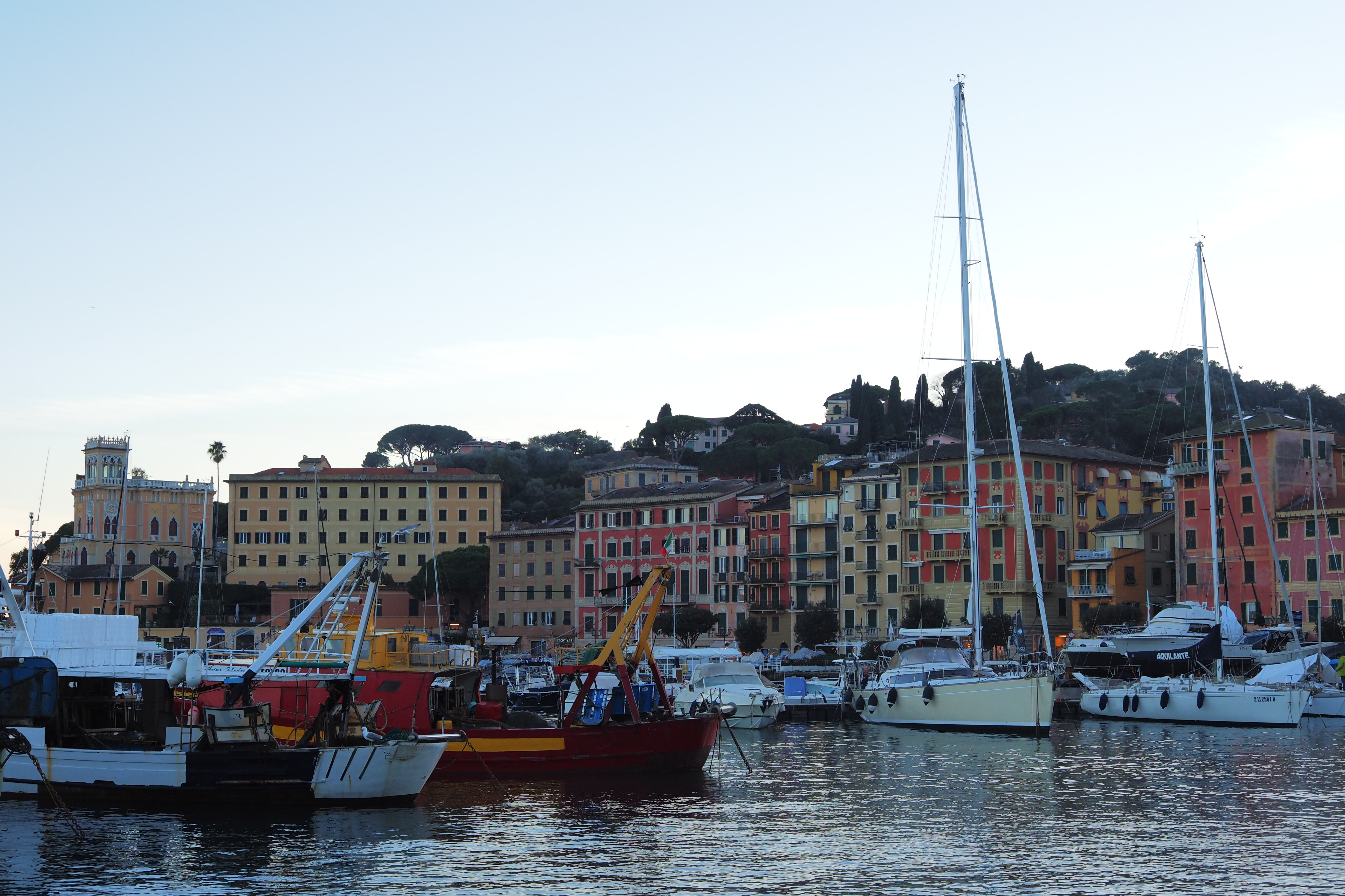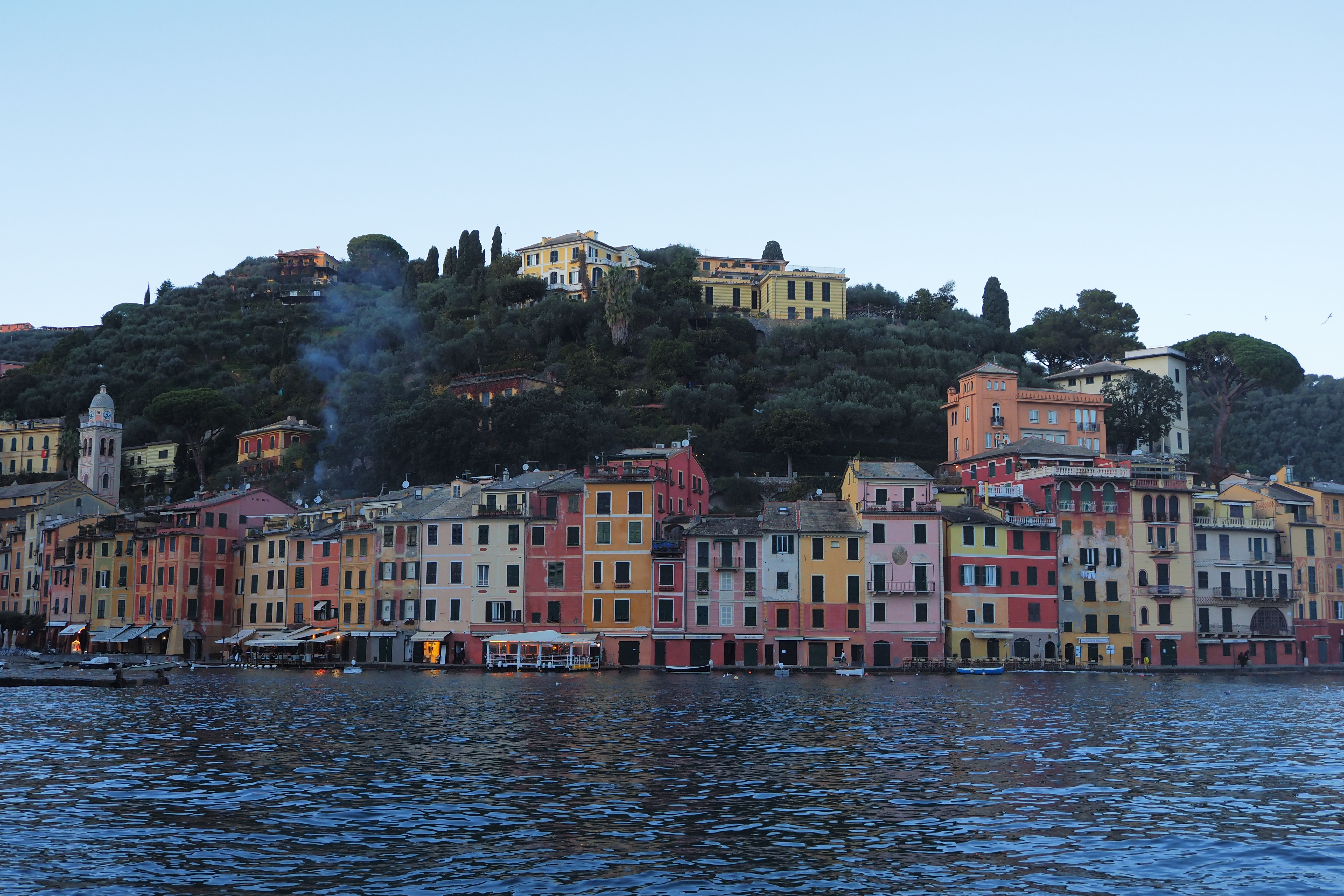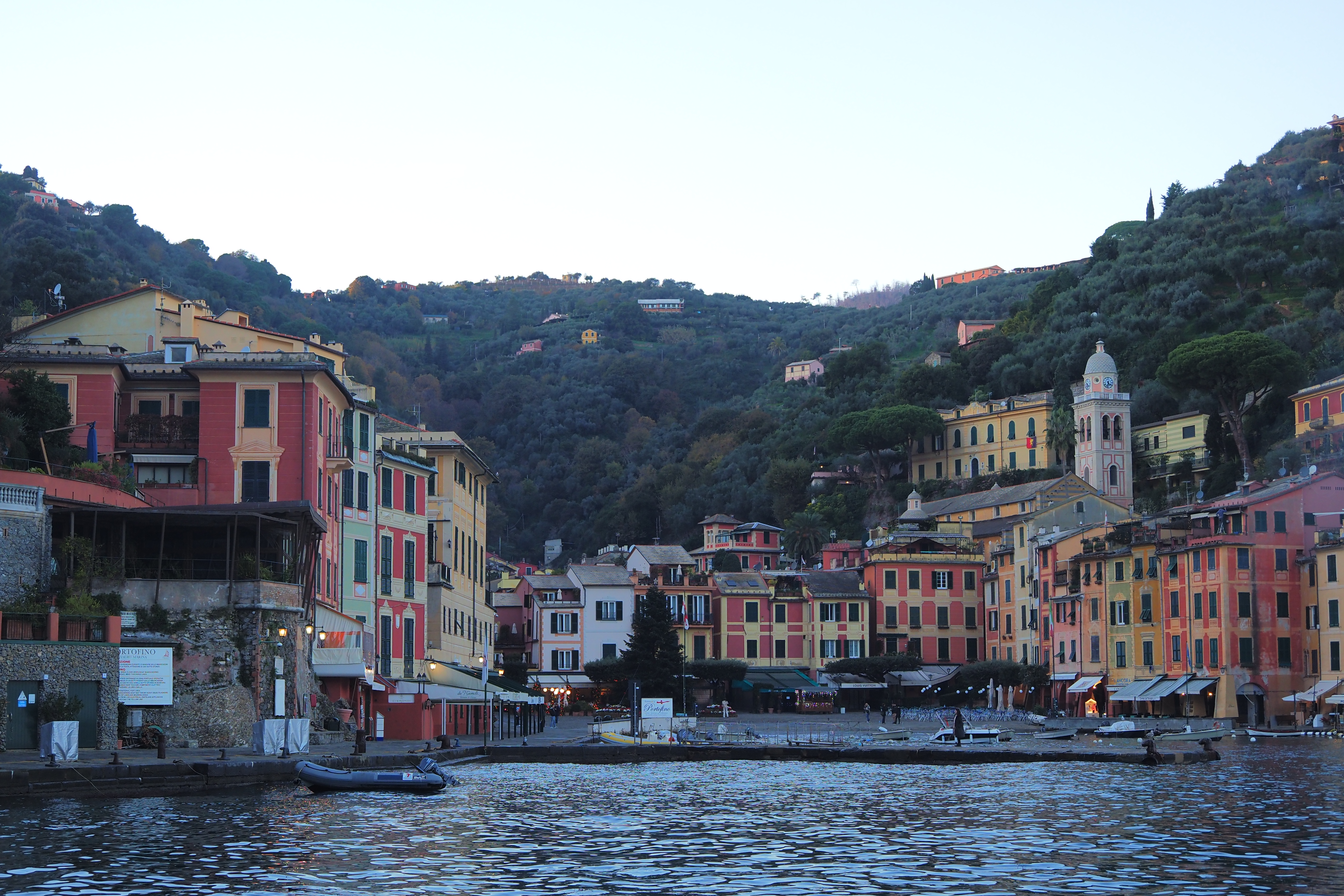 突き抜ける青空の下だともっとキラキラと輝くんだろうけど、ぎりぎり日の光があるうちに黄昏時のポルトフィーノを堪能できたのも これはこれでよかった。