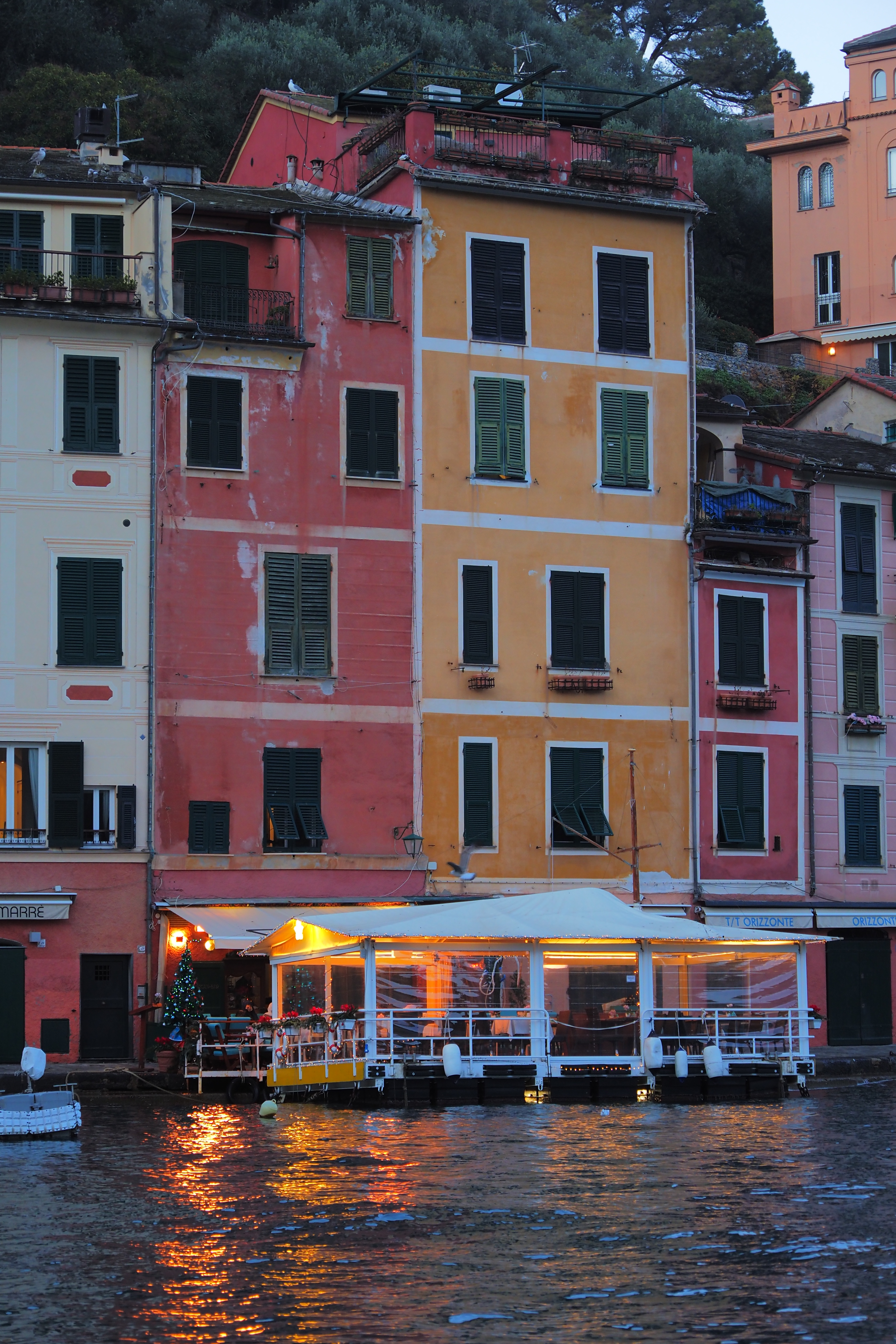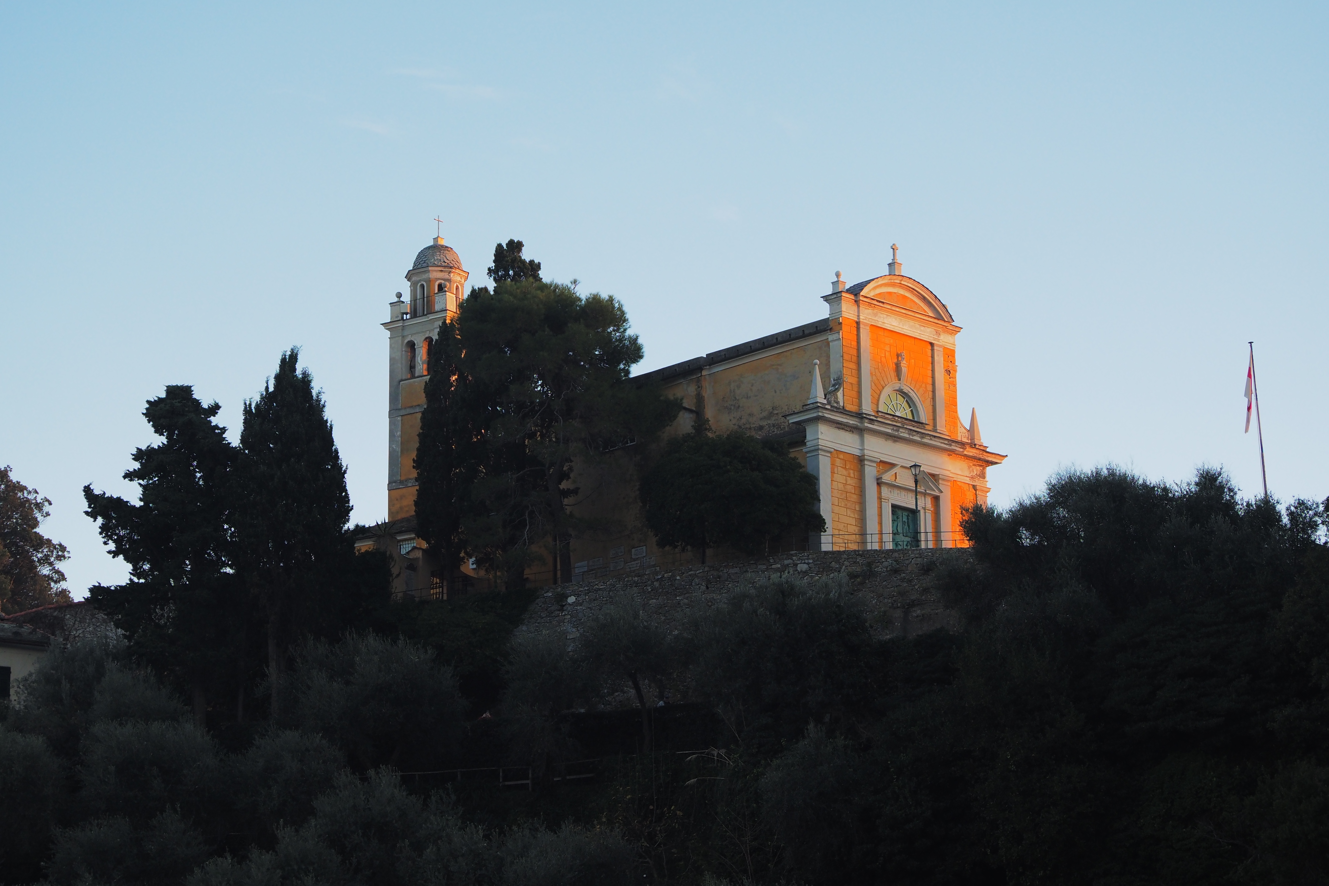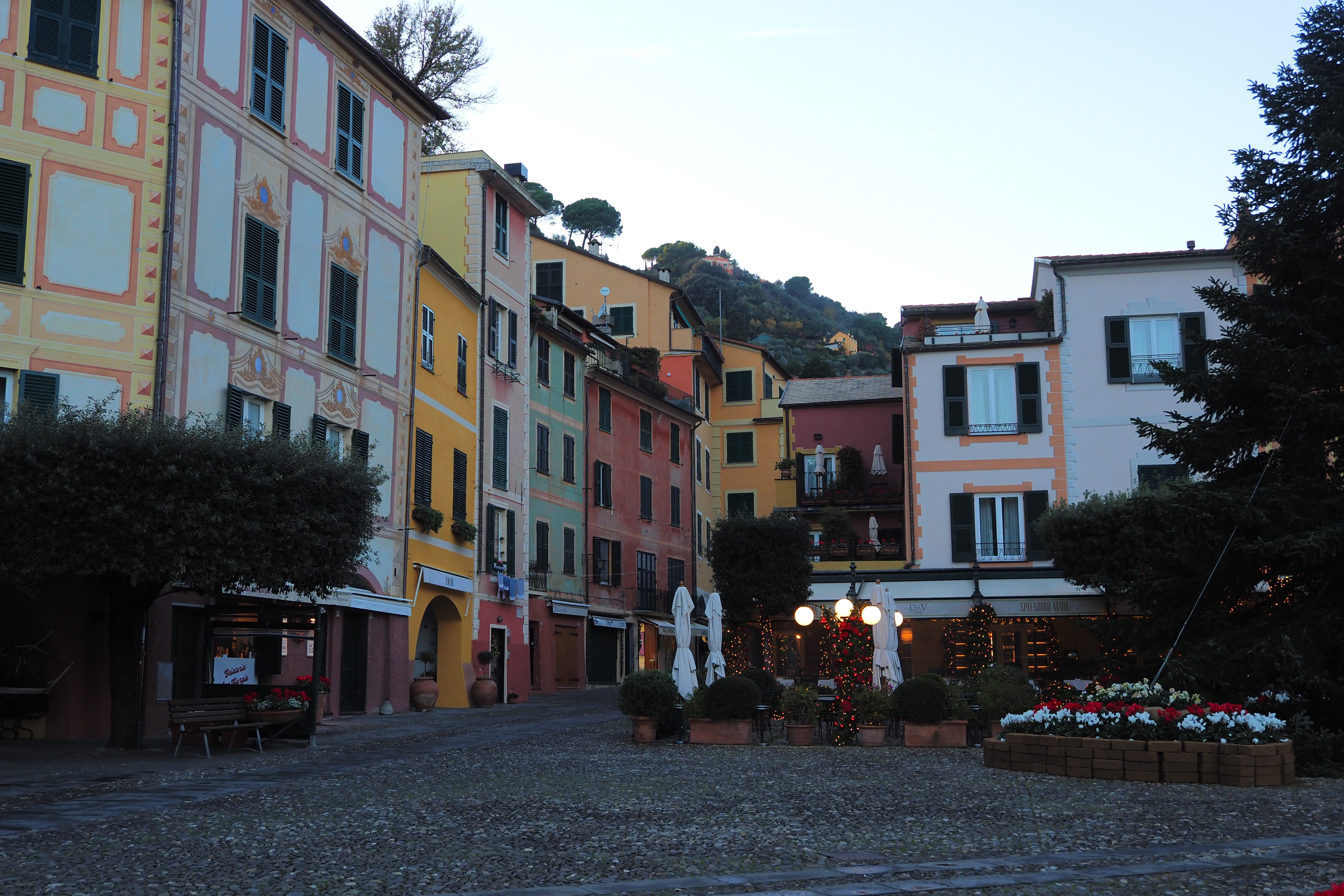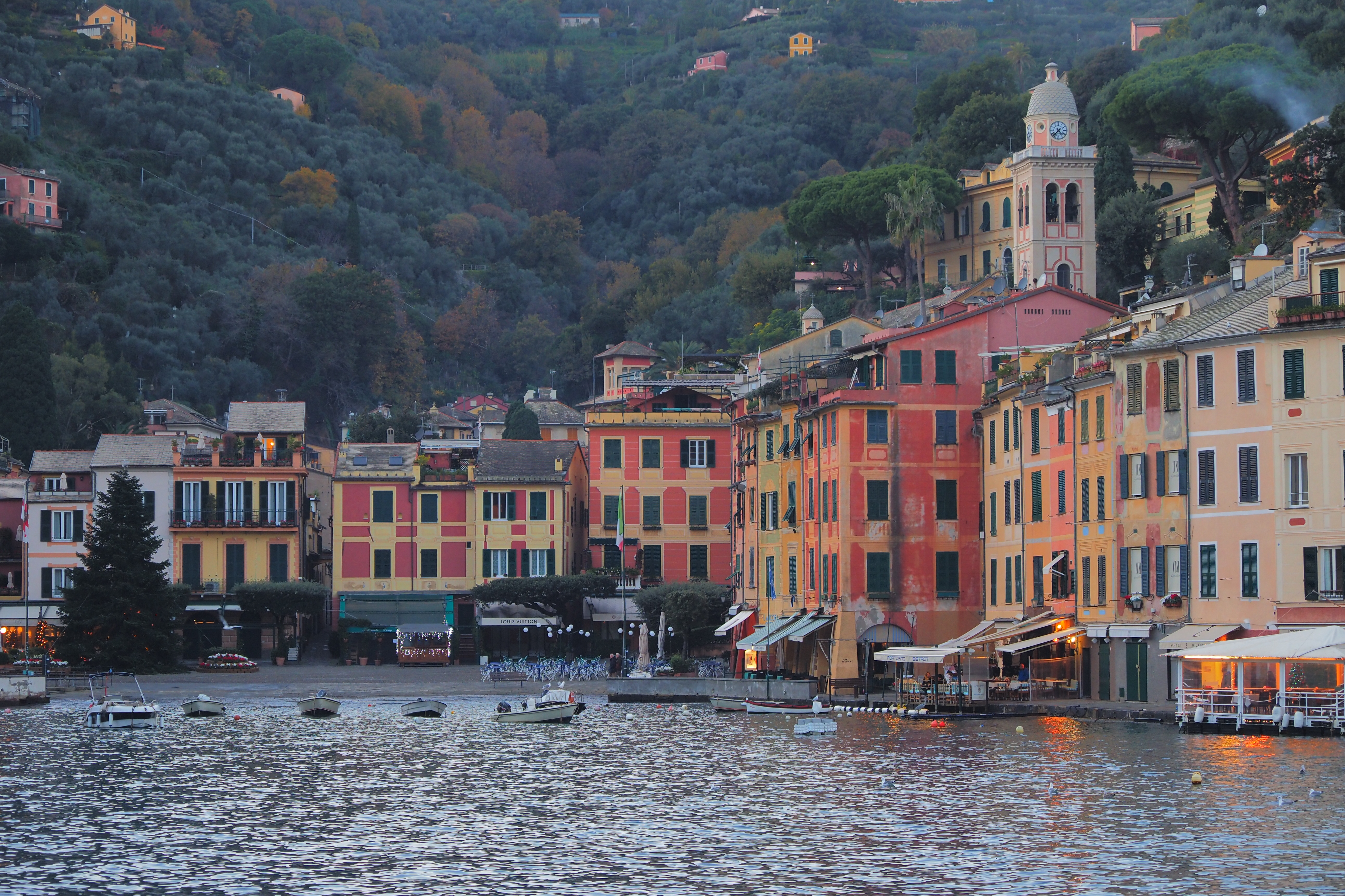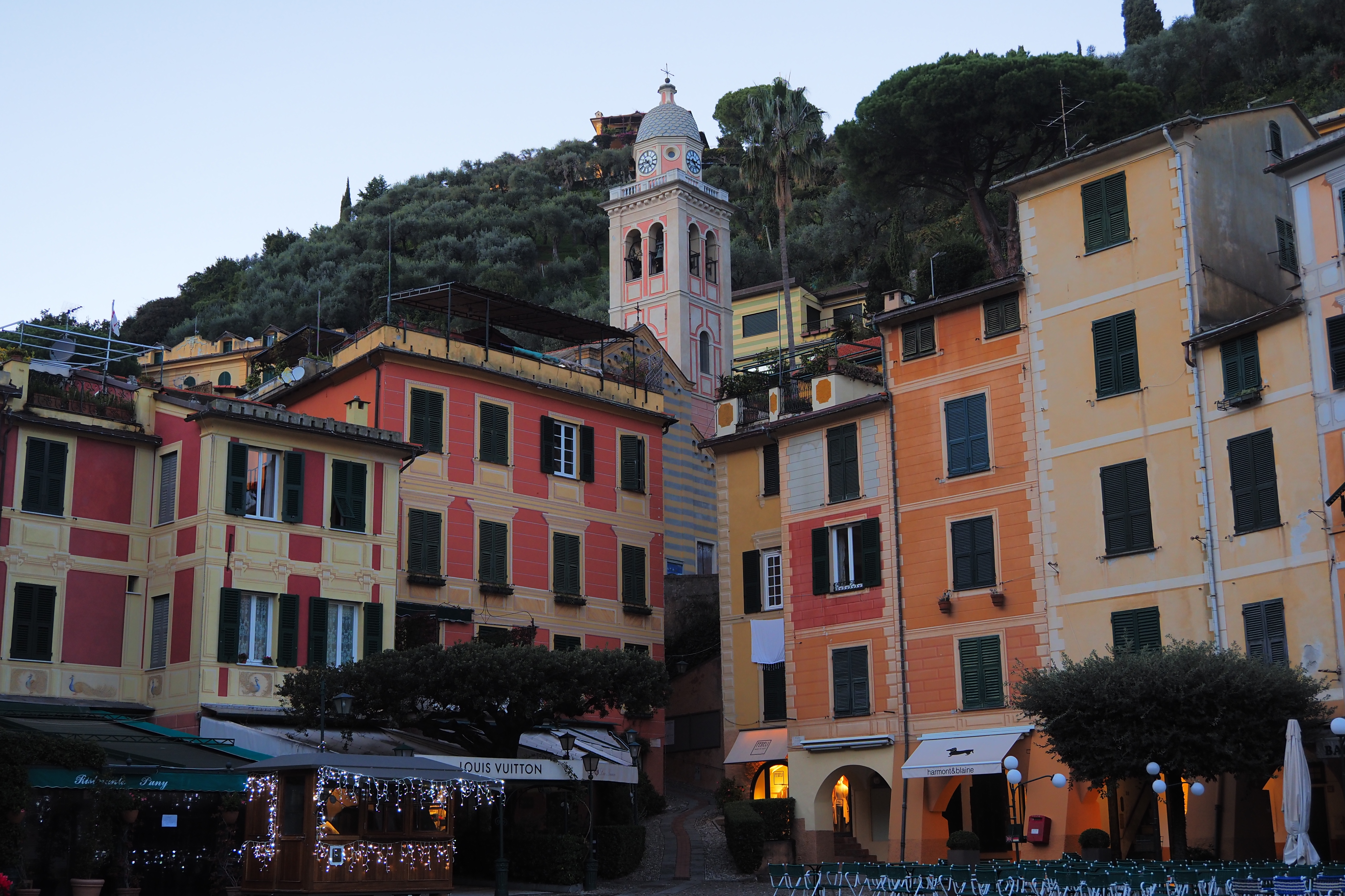 突き抜ける青空の下だともっとキラキラと輝くんだろうけど、ぎりぎり日の光があるうちに黄昏時のポルトフィーノを堪能できたのも これはこれでよかった。
