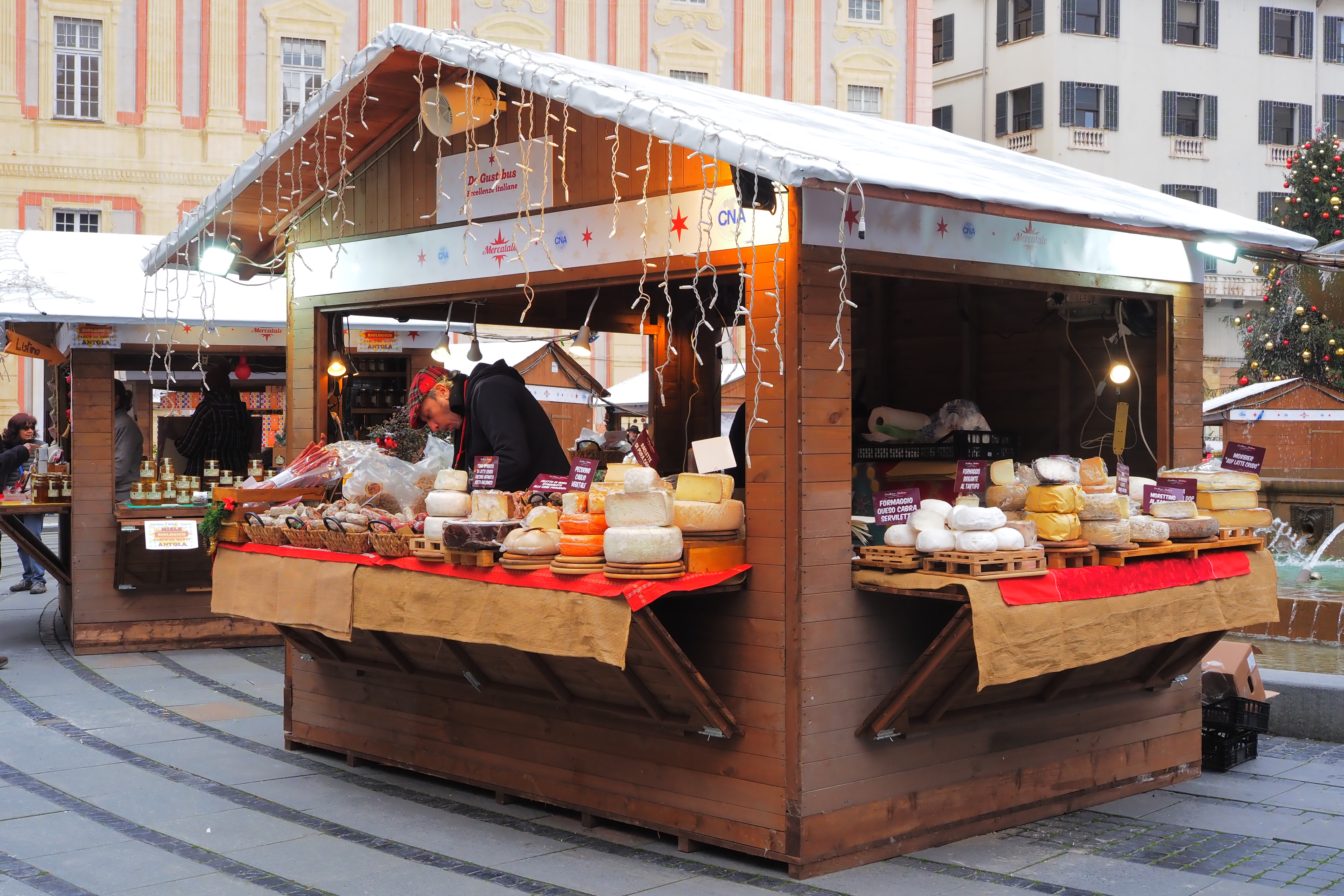 ツリーに飾るオーナメントとか、巨大なチーズケーキとかがかわいらしい小屋で売られてる。