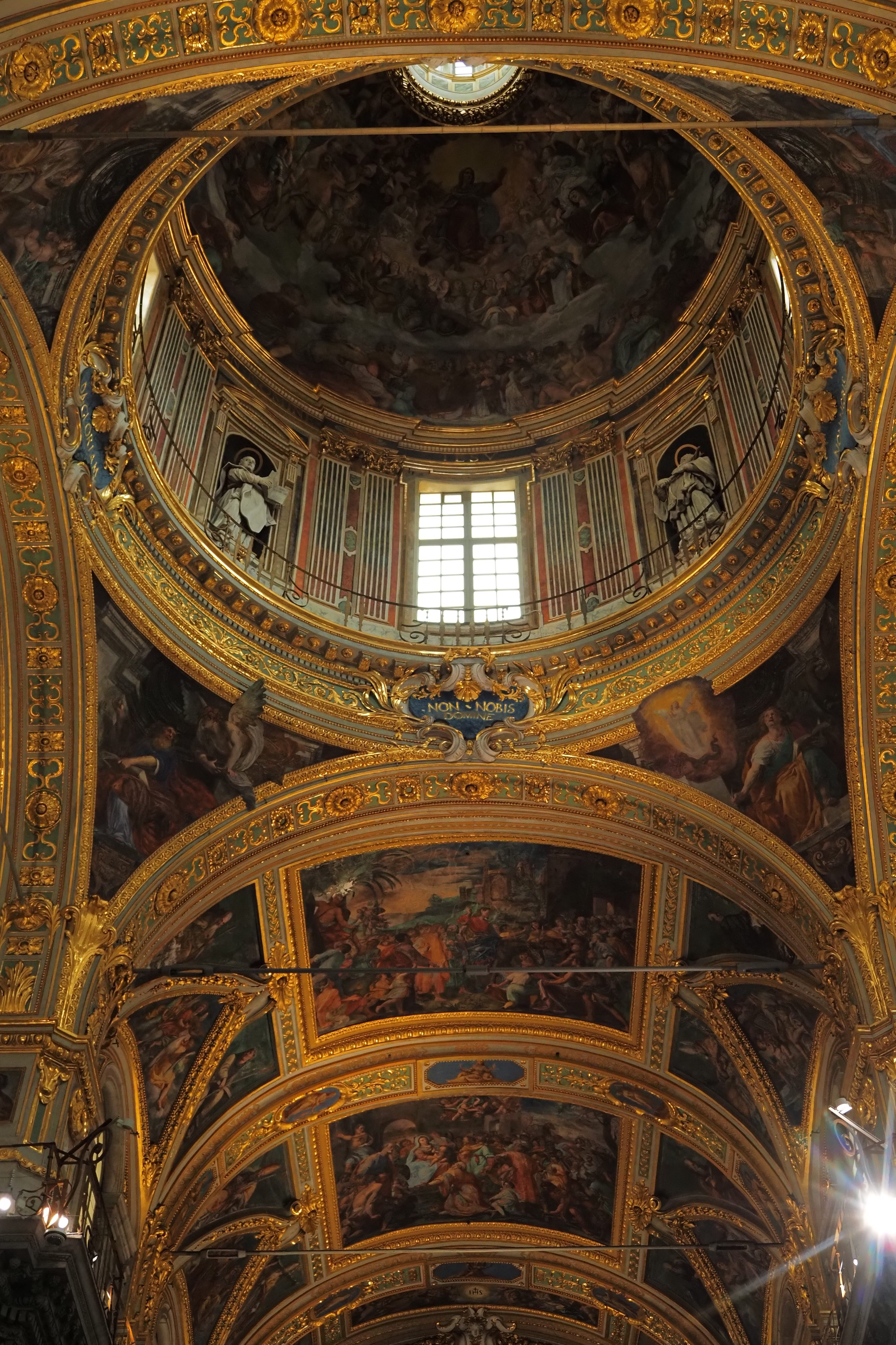 単身廊の内部。主祭壇の上にみえるメインドーム基部の八角形と 後陣の半円蓋に施された彫刻。