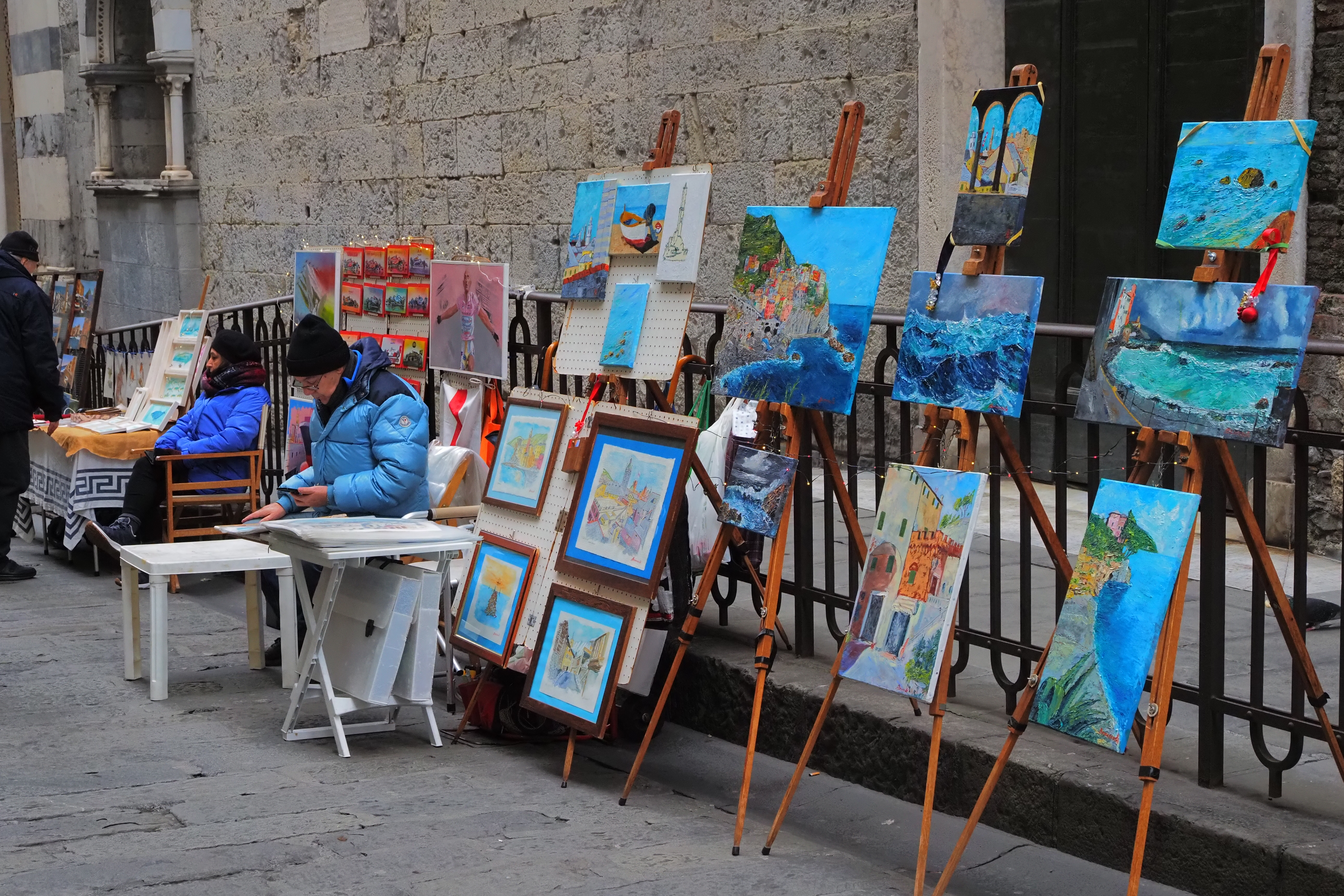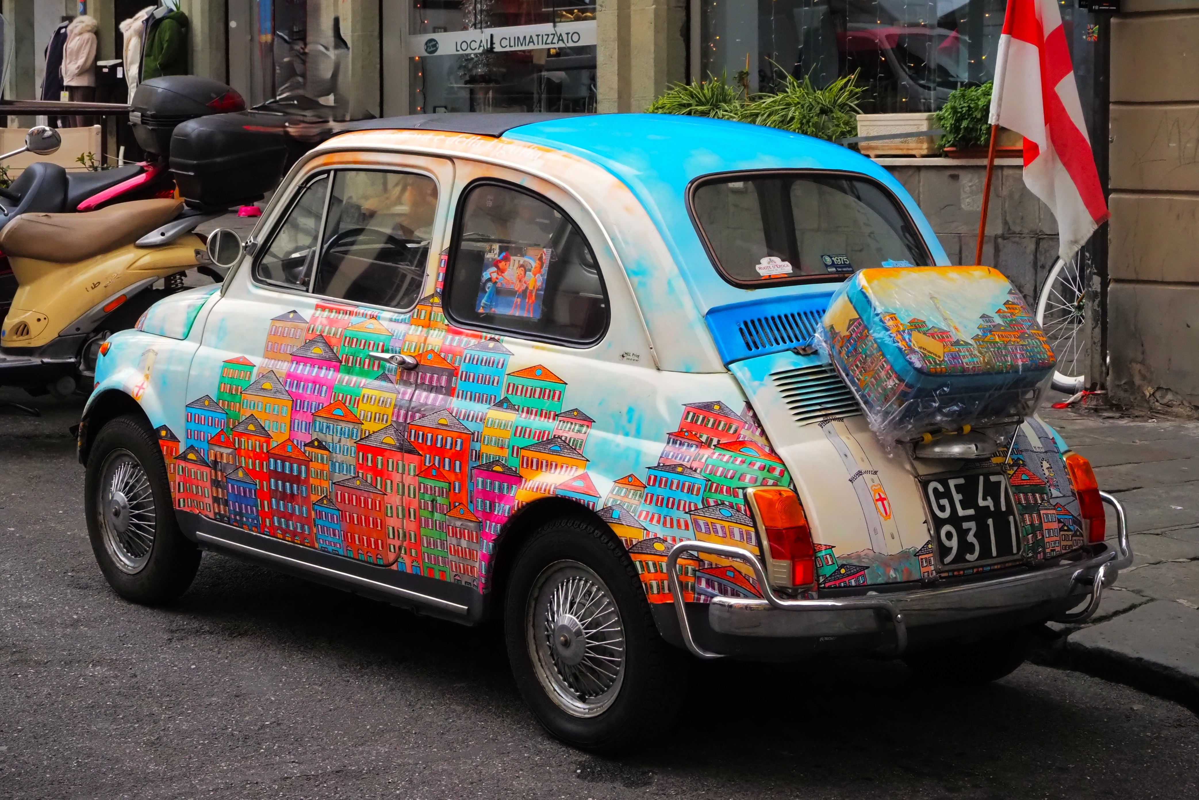 リグーリア海岸のカラフルな建物を描いたのかな? というかわいいチンクエチェントがこんなとこにも。