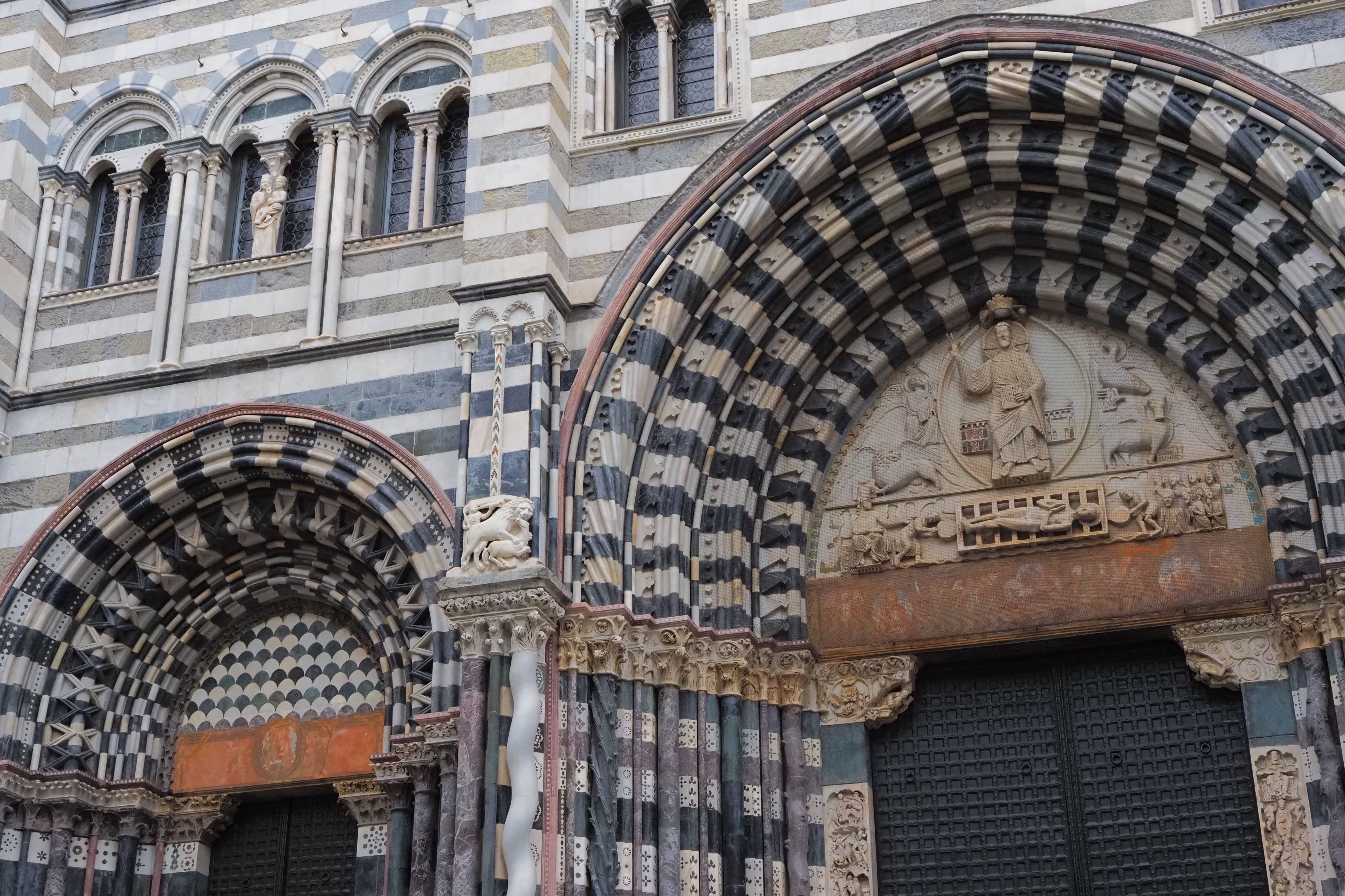 白大理石とプロモントリオの黒い石灰岩でデザインされた縞模様のファサードは14世紀初頭に西側拡張の一環としてつくられたもので、尖頭アーチにゴシック様式がみられる。