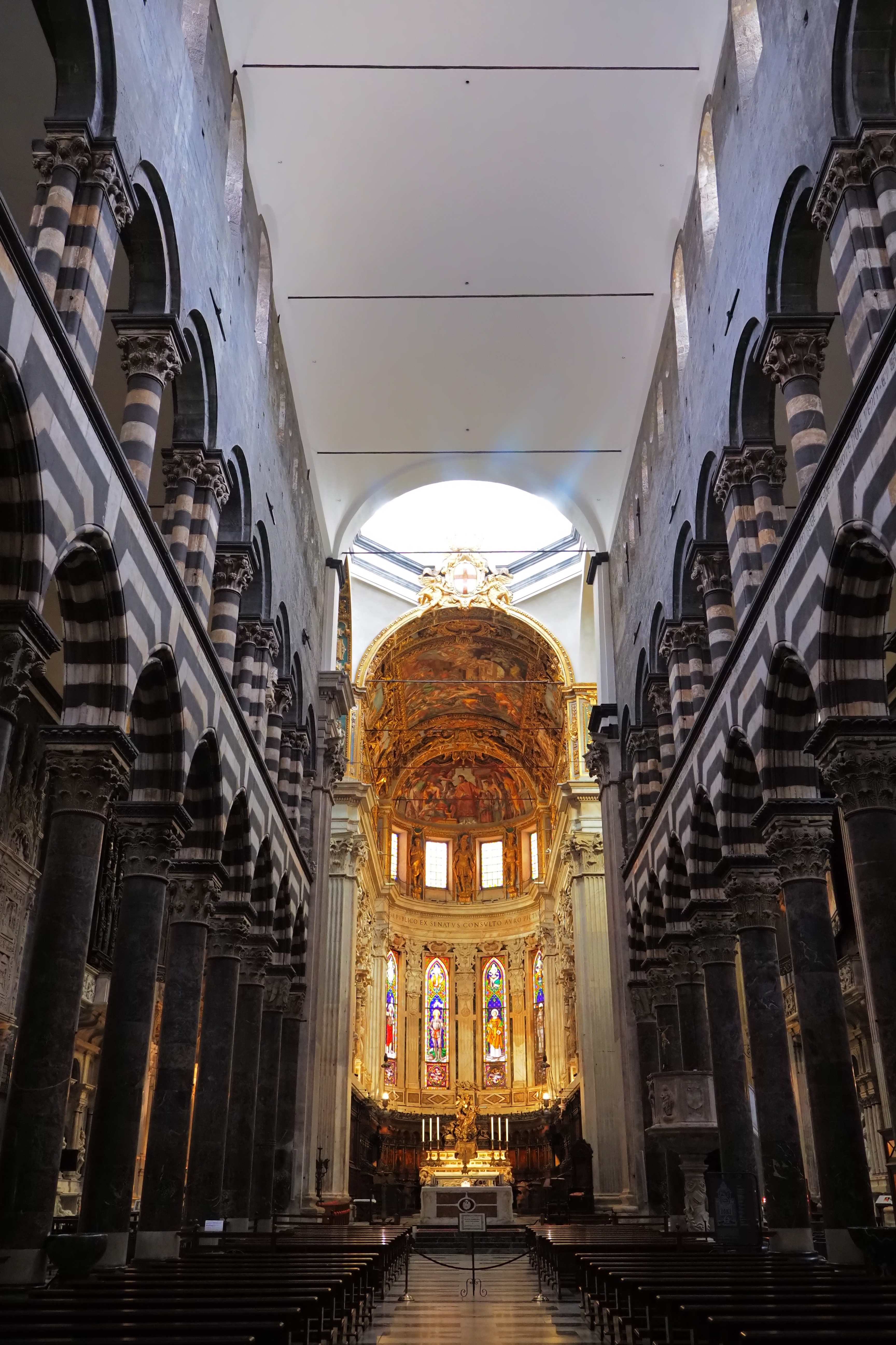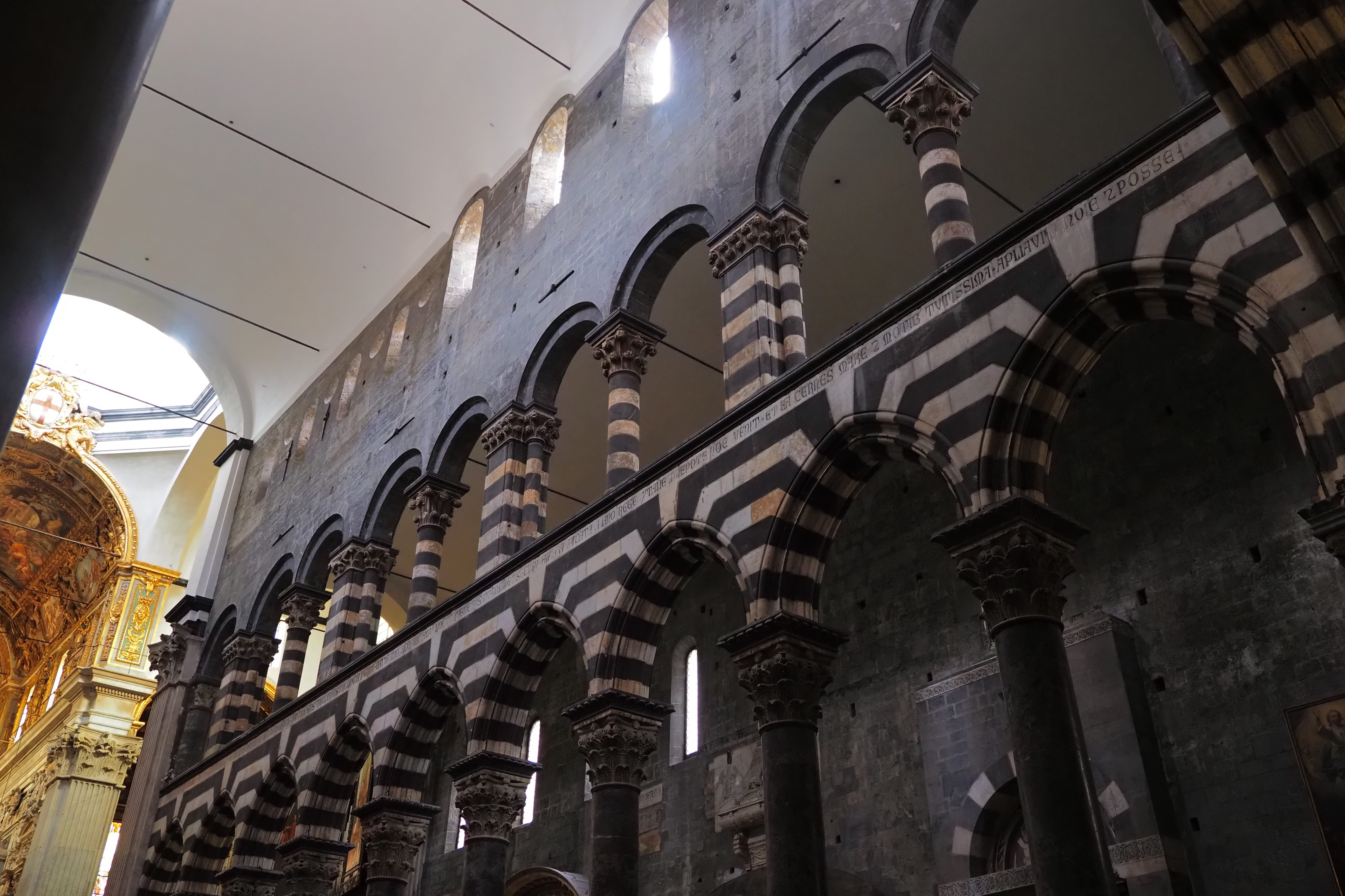 アマルフィ大聖堂やピサ大聖堂と同様、身廊を隔てる2階構造の列柱はアブラーク工法の白黒縞模様があしらわれている。