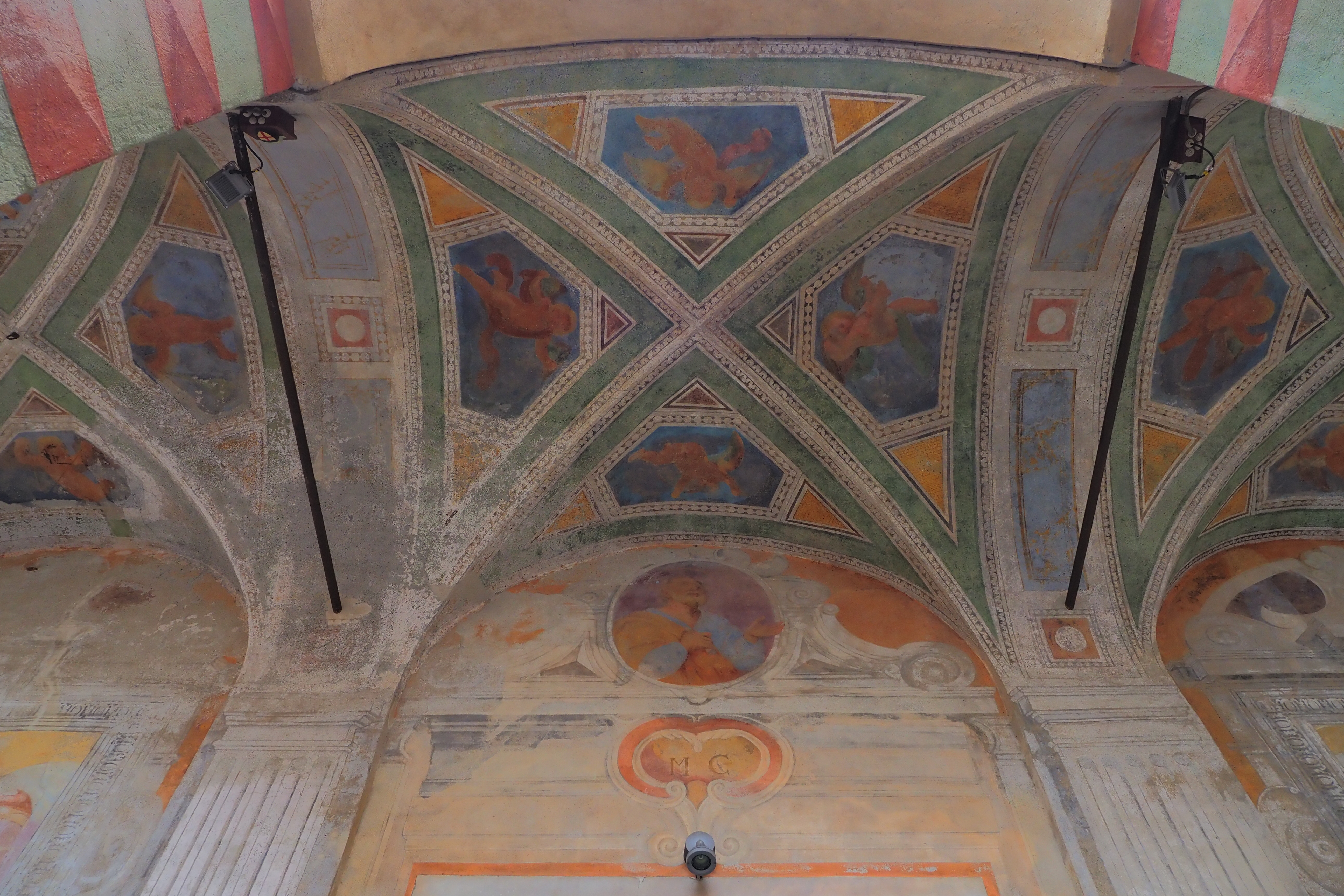 カラフルに装飾されたポルチコの天井と、交差ヴォールト。