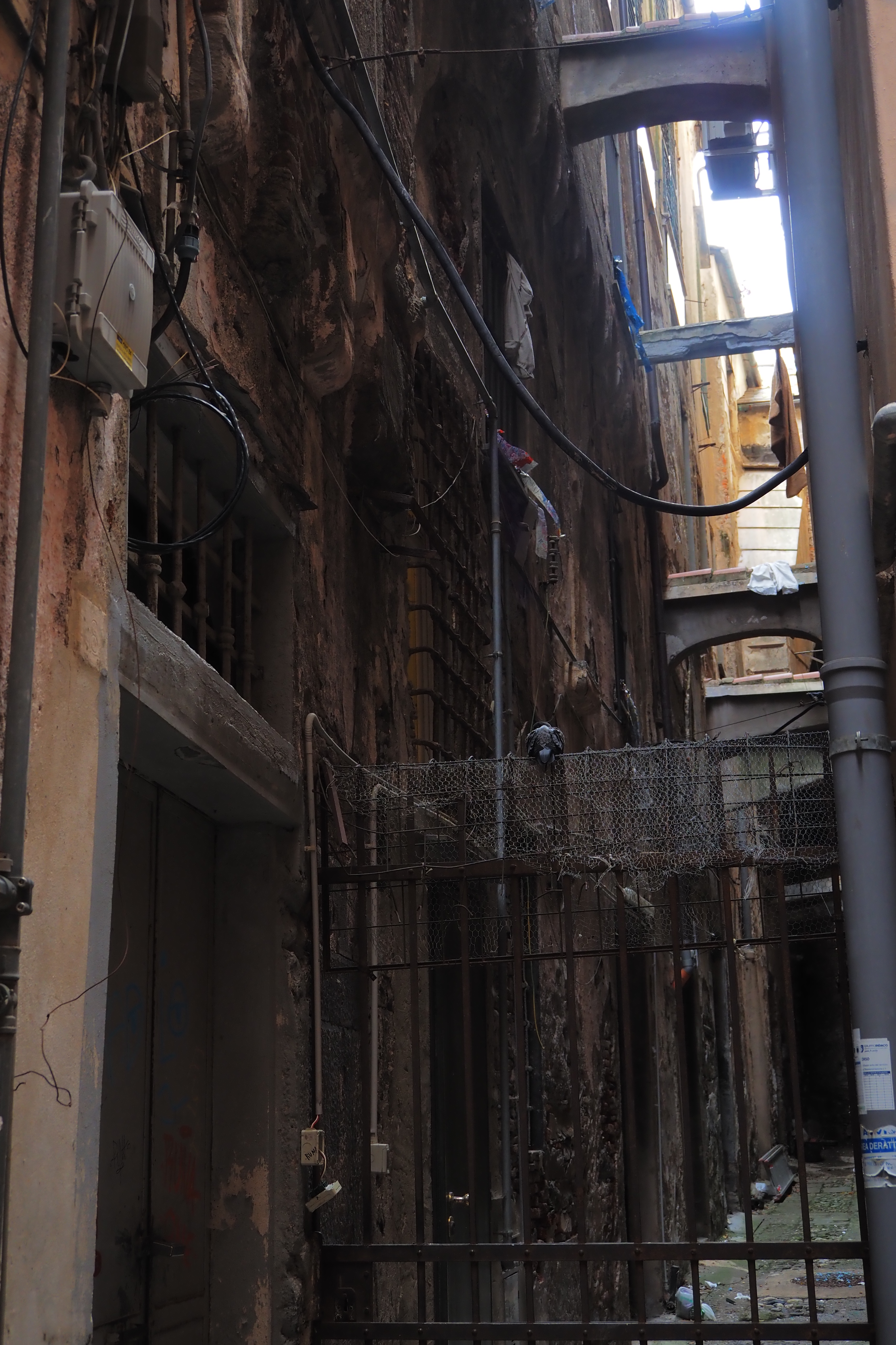 天気がよければ海の岬先まで歩いて行っていろいろ写真撮りたいところだけど、そんな気分にもならず、海に面した建物群の1階部分につづくポルチコの下に潜る。