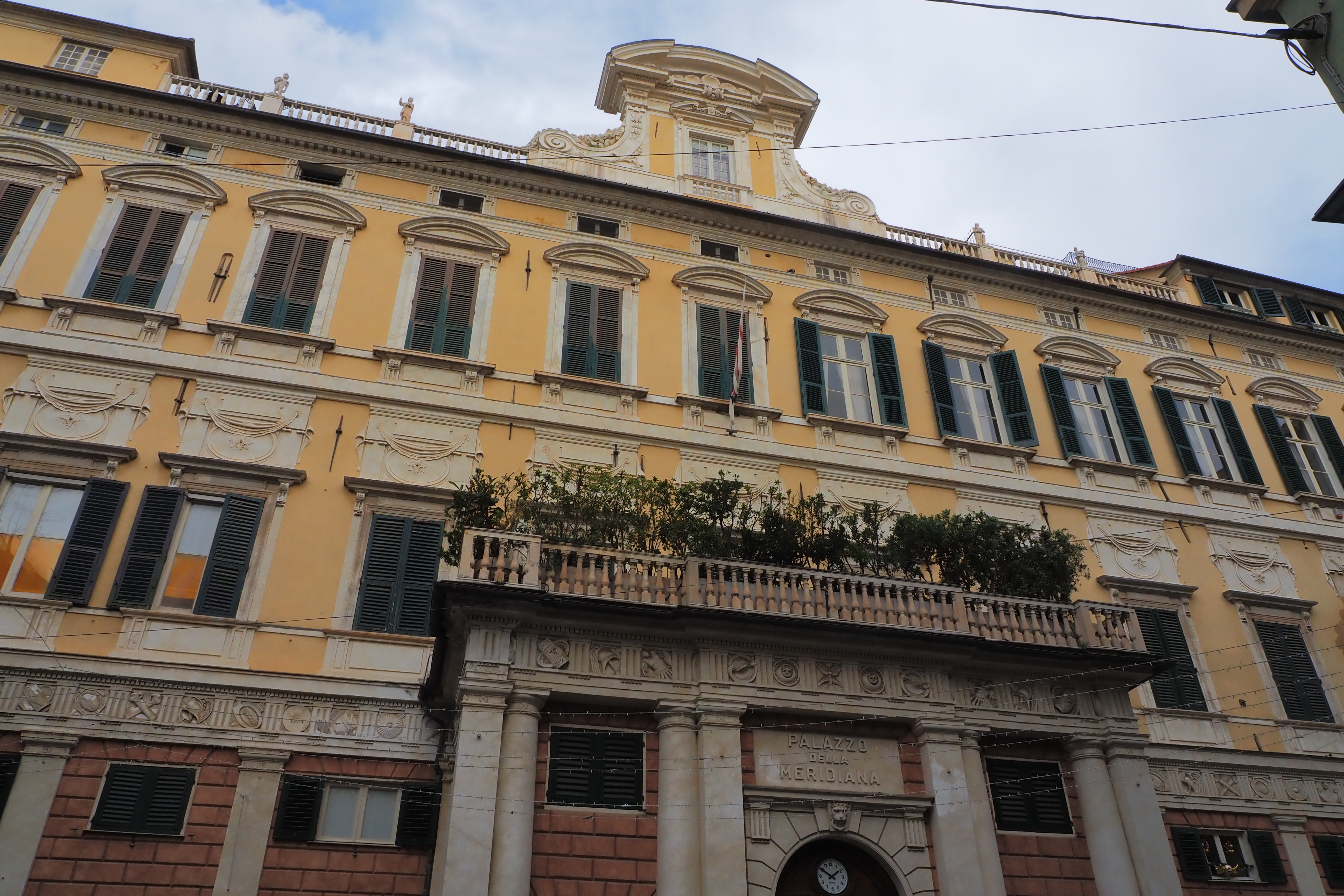 Palazzo della Meridiana; メリディアーナ宮や Palazzo Gio Carlo Brignole; ジオ・カルロ・ブリニョーレ宮 が建ち並ぶ Piazza della Meridiana; メリディアーナ広場に出る。前者は1544年 銀行家 Gerolamo Girmaldi によって建てられたもの、後者は ジェノヴァ貴族 Giovanni Battista Brignole; ジョバンニ・バティスタ・ブリニョーレによって 1628年に建てられた個人の邸宅でいずれもここから北西~南東にかけて密集する [Le Strade Nuove e il sistema dei palazzi dei Rolli; 新街路群とロッリ制度] の一部として世界遺産となってる。