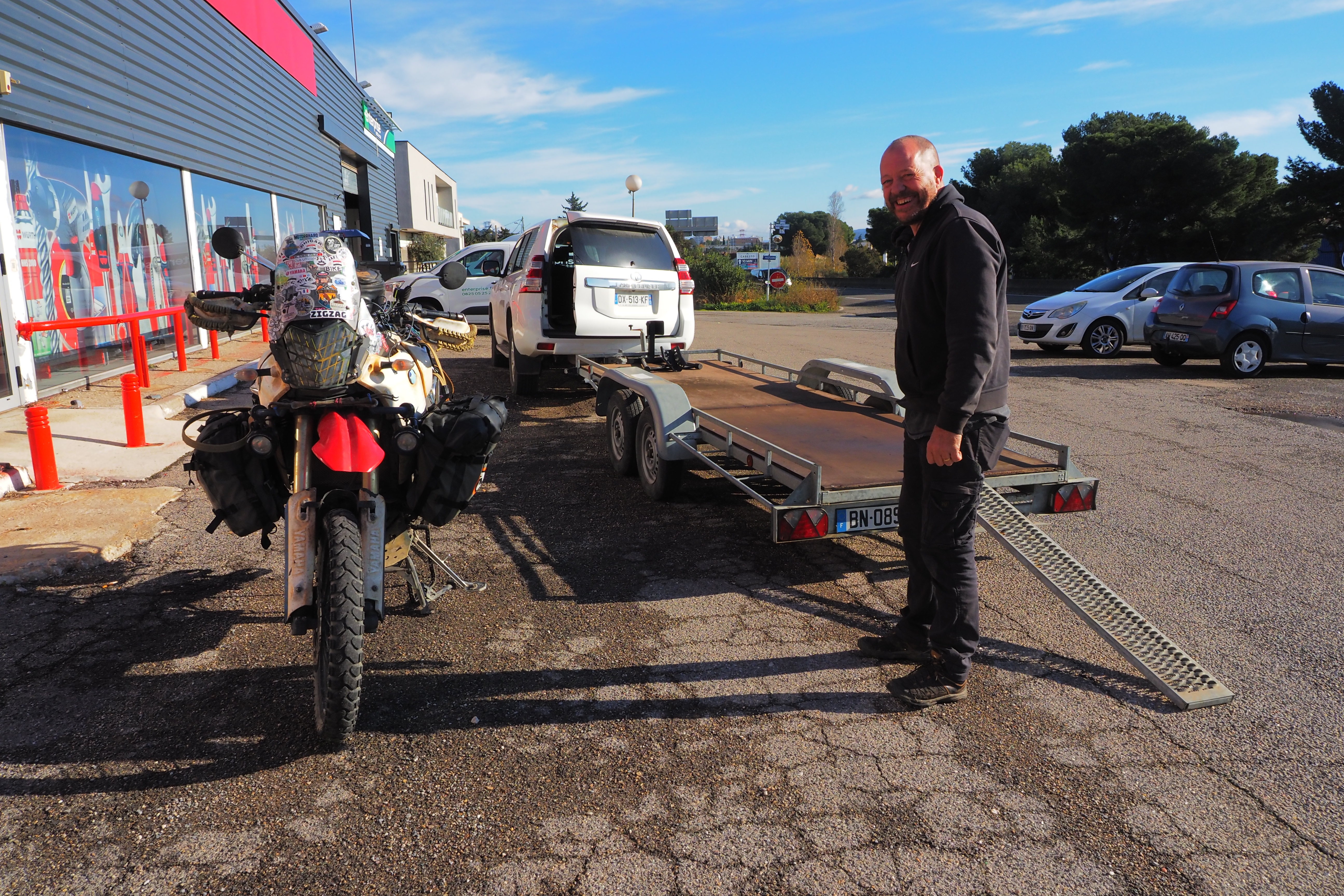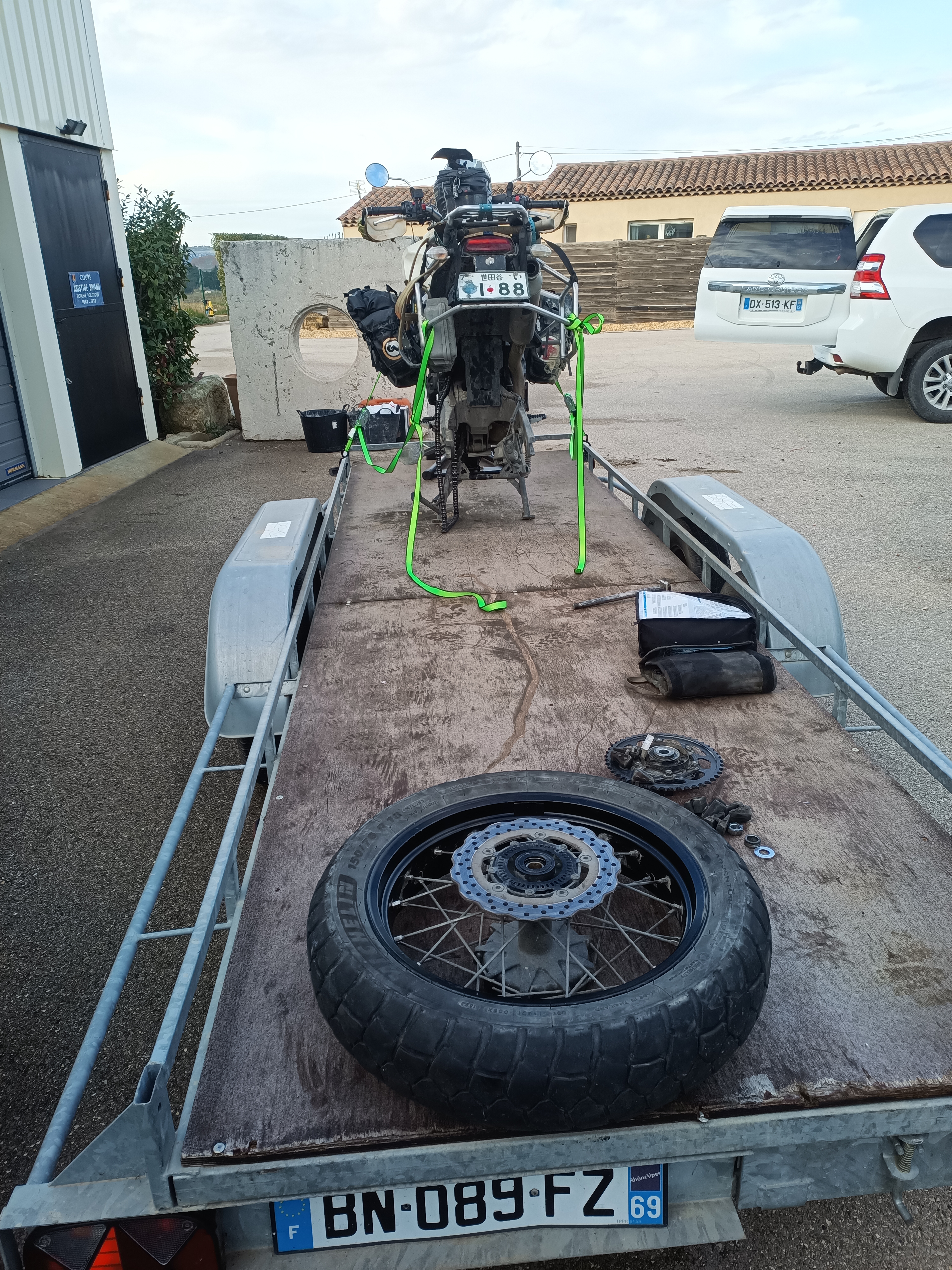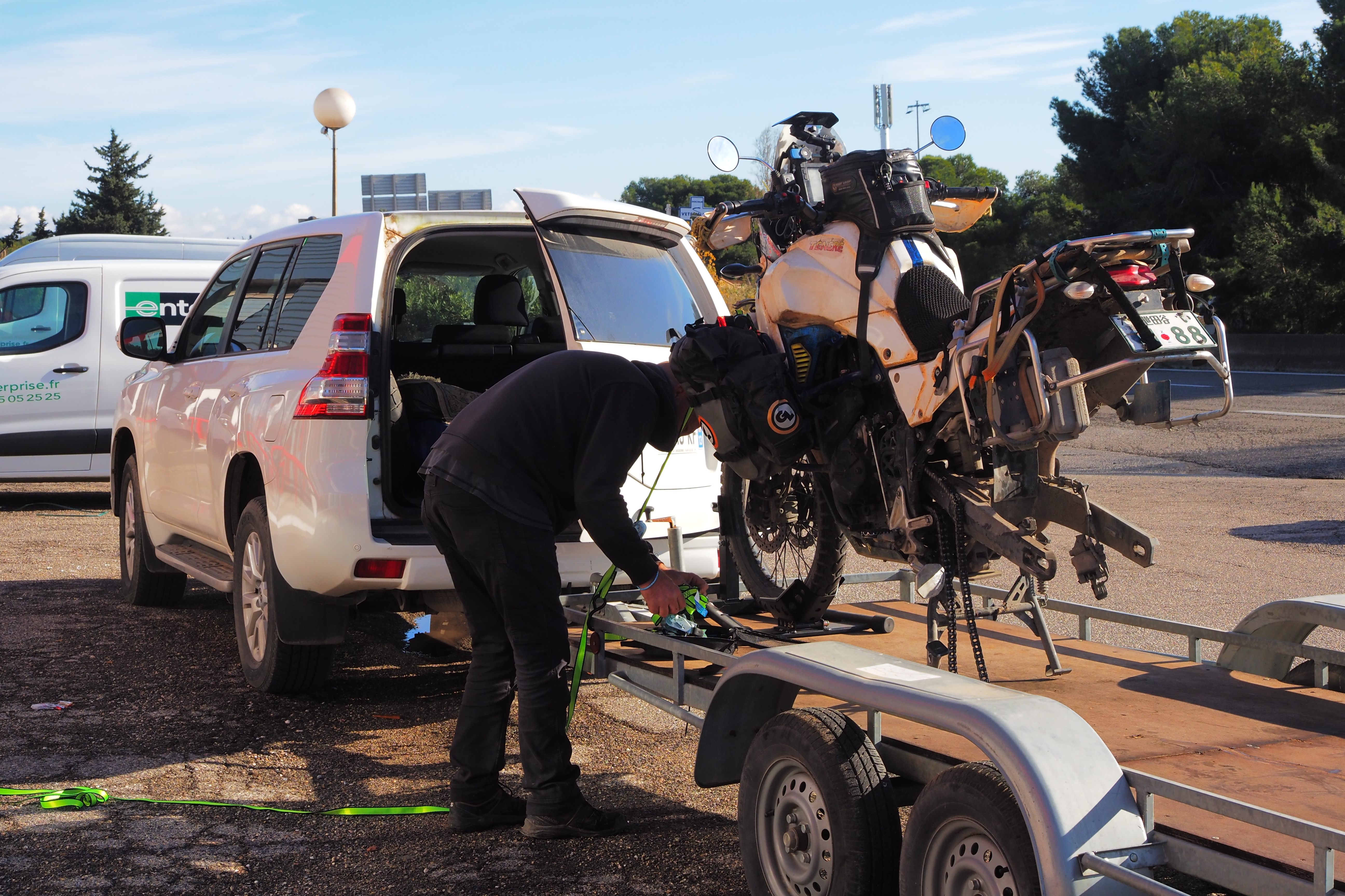 言われた通り待ってると、荷台を牽引してきてくれたので Arnaud と後輪の外れたテネレを台の上に乗せてラッシングベルトで固定。