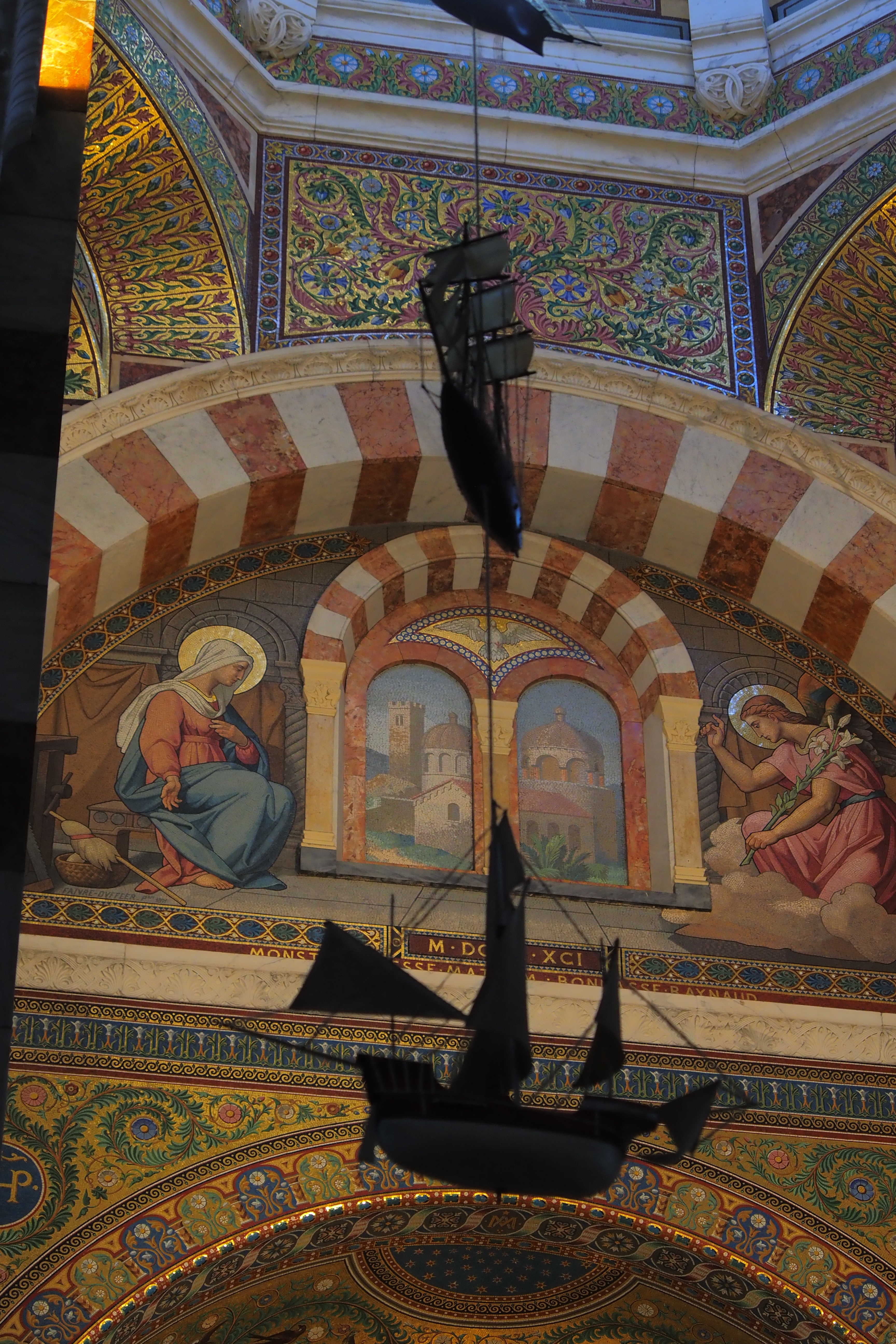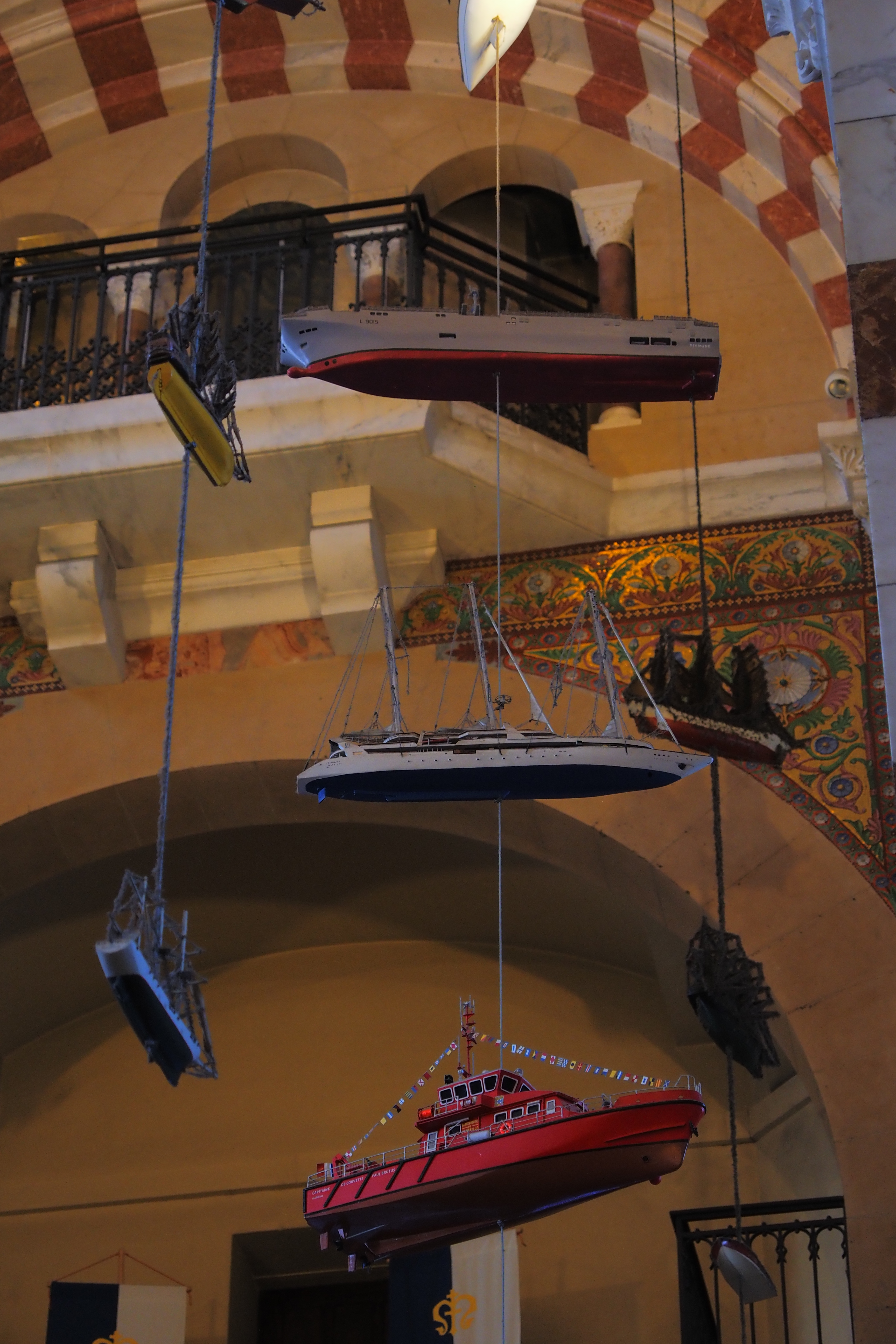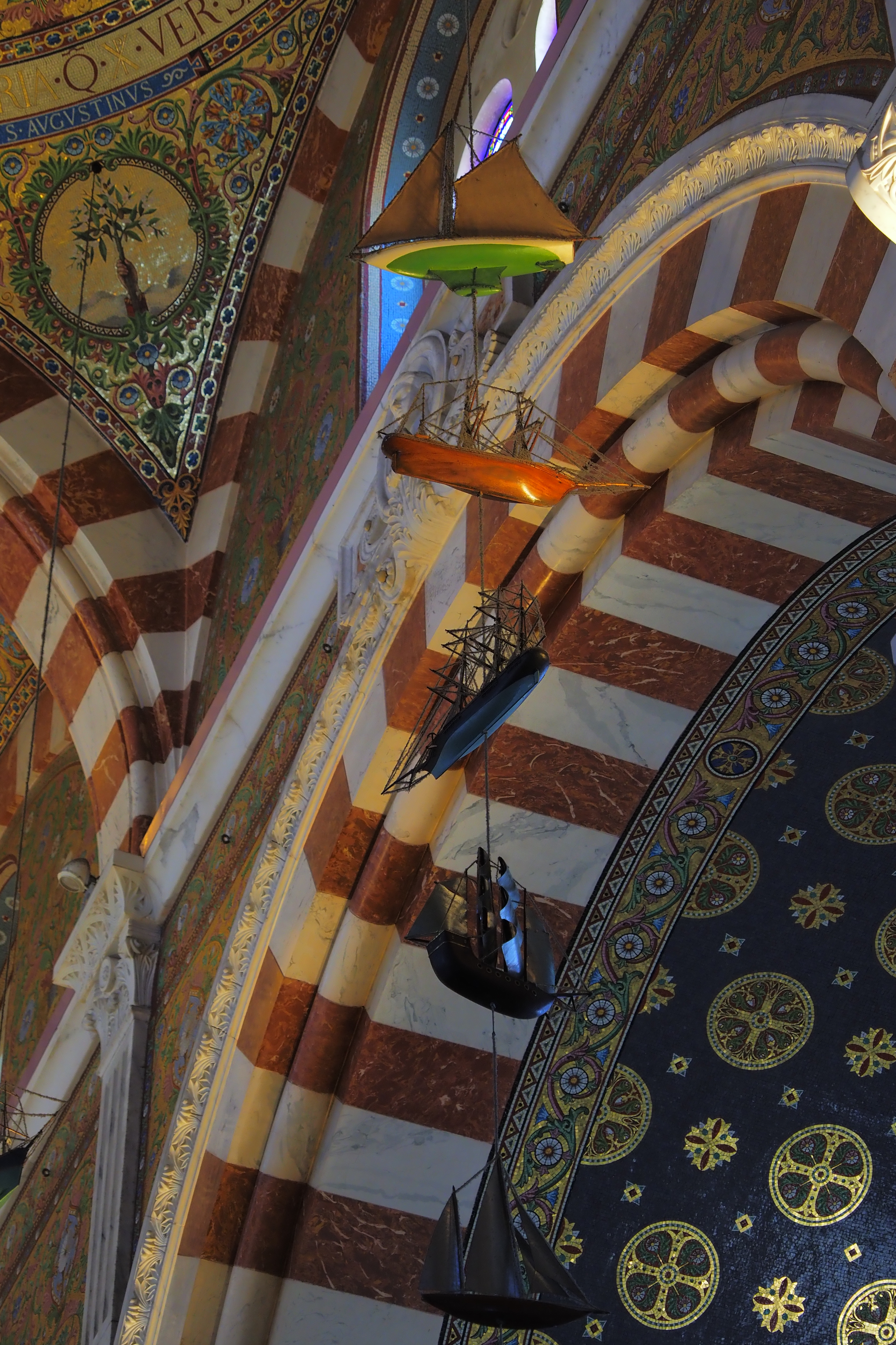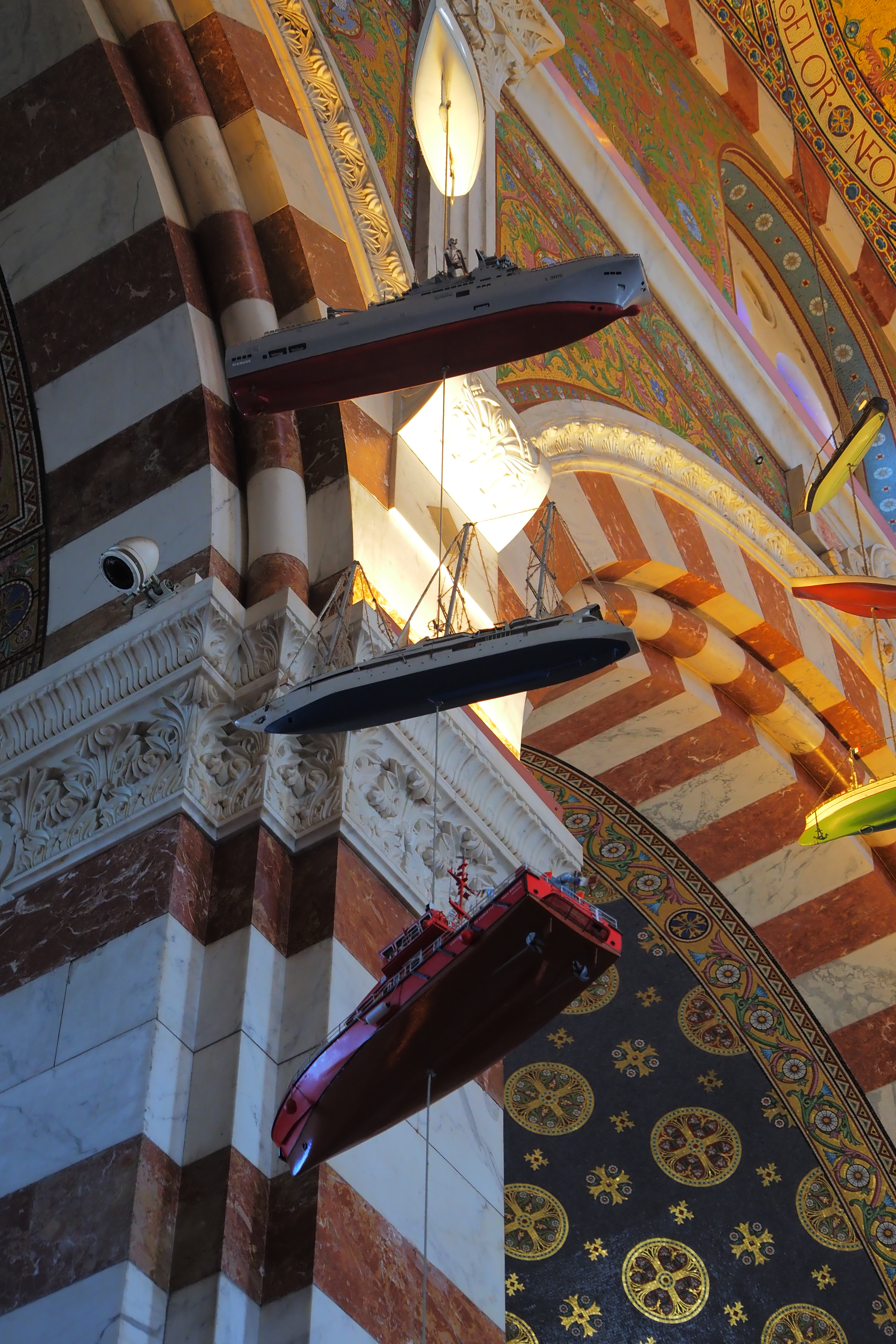 これはこの教会ならではの Ex-Voto; 感謝の奉納品 で、航海から無事に帰還した船乗りたちが教会に寄進していったものらしい。海と深い結びつきのあるマルセイユならではといったかんじだろうか。