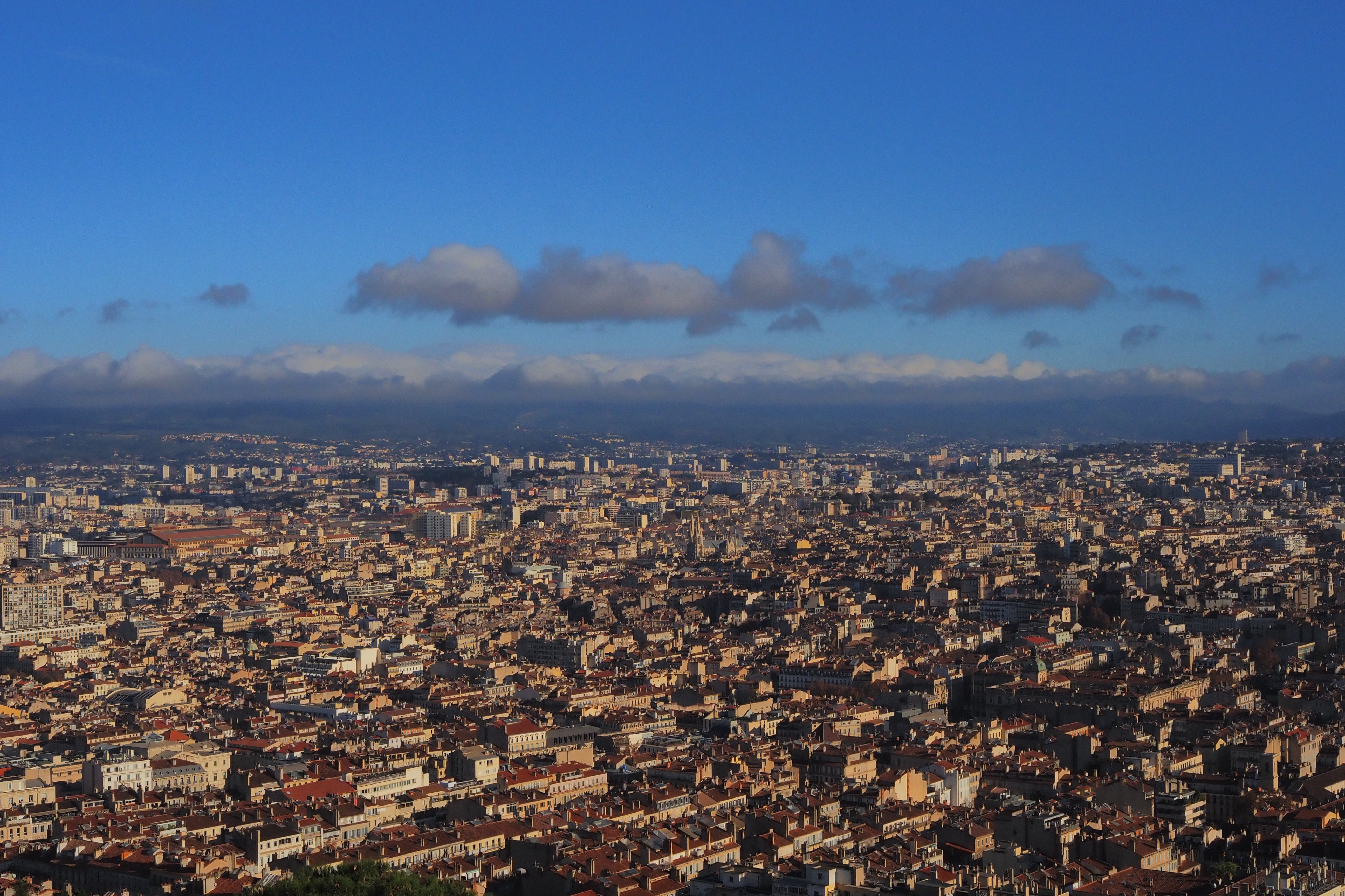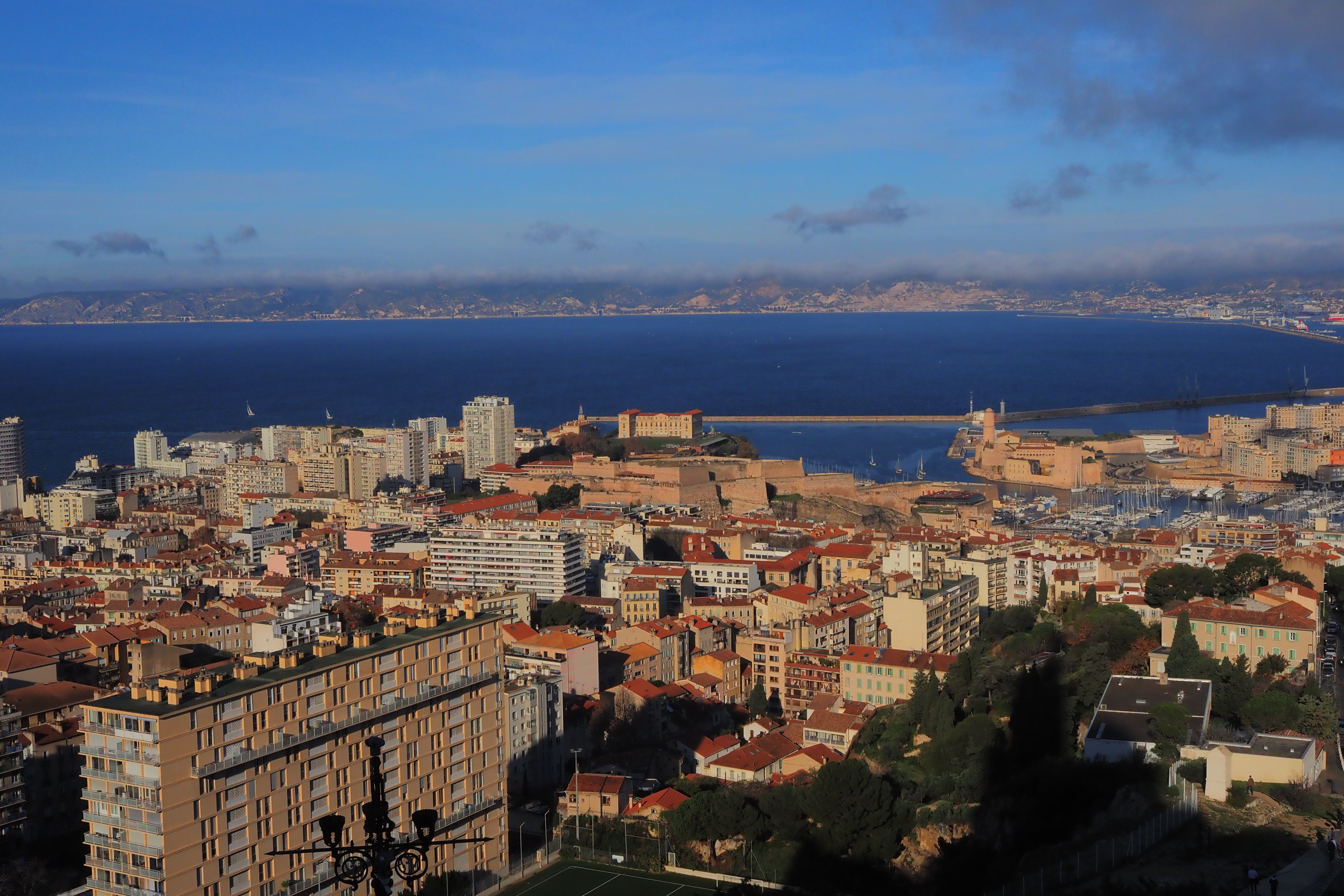 教会の建つ旧要塞上のテラスから、マルセイユの街を一望する。