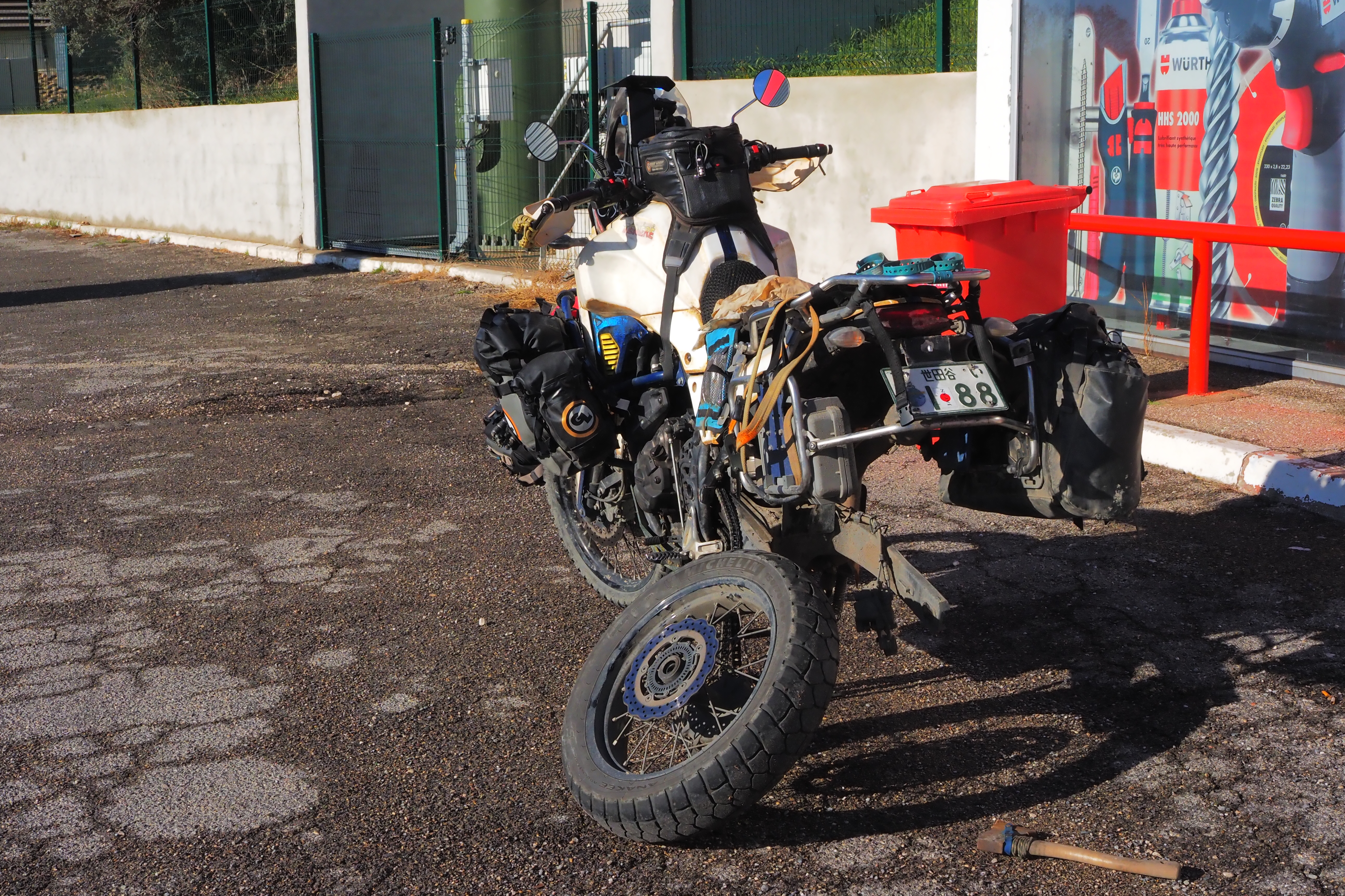 車から下りて来た男性は、ホイールを一目見て状況を察してくれたようで 一度近くあるという家に荷台を取に戻るからここで待ってろ、と言う。彼の名は Arnaud. 彼もバイク乗りのようで、通り過ぎる時に道脇で明らかに困ってる管理人を見て、戻ってきてくれたのだ😭
