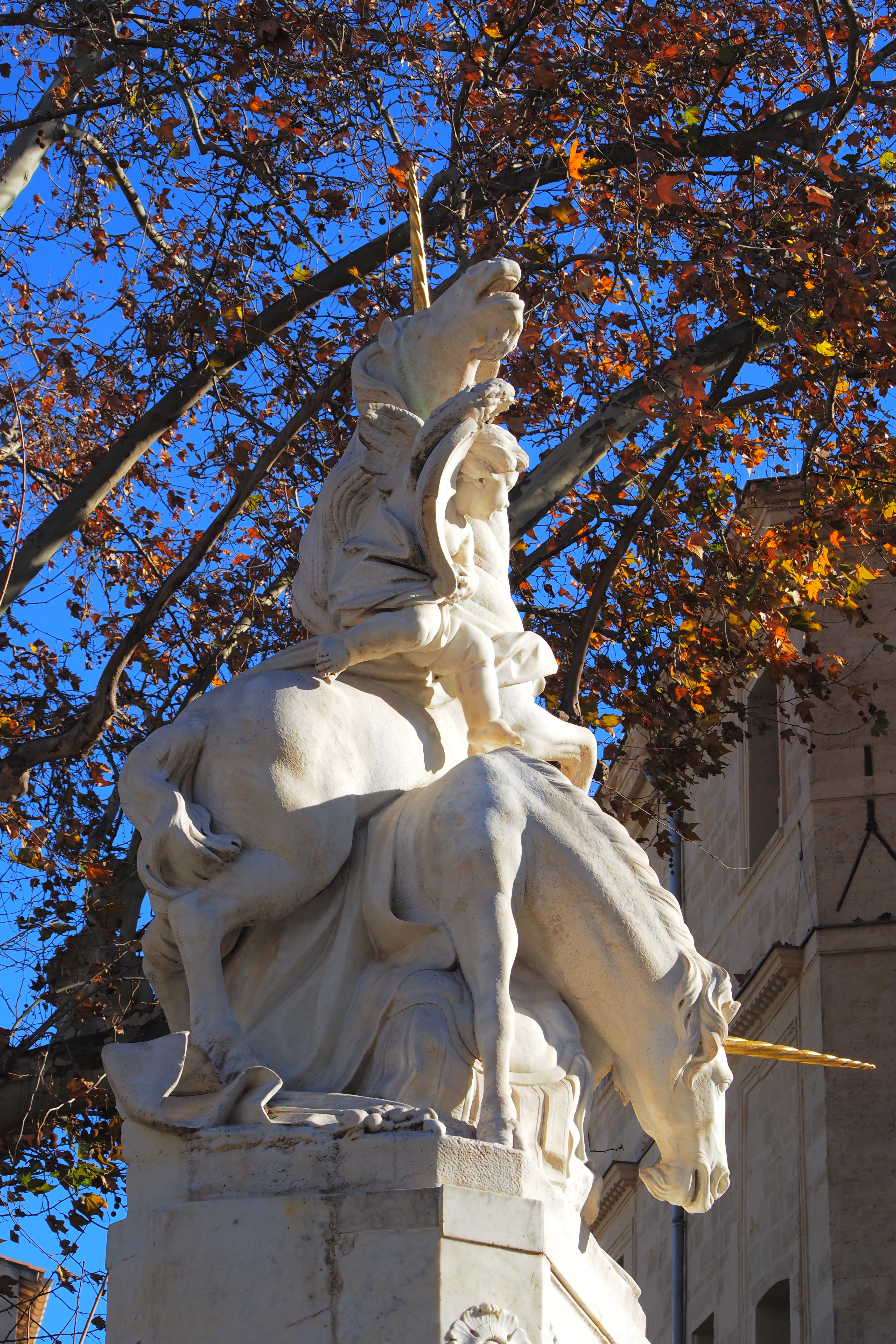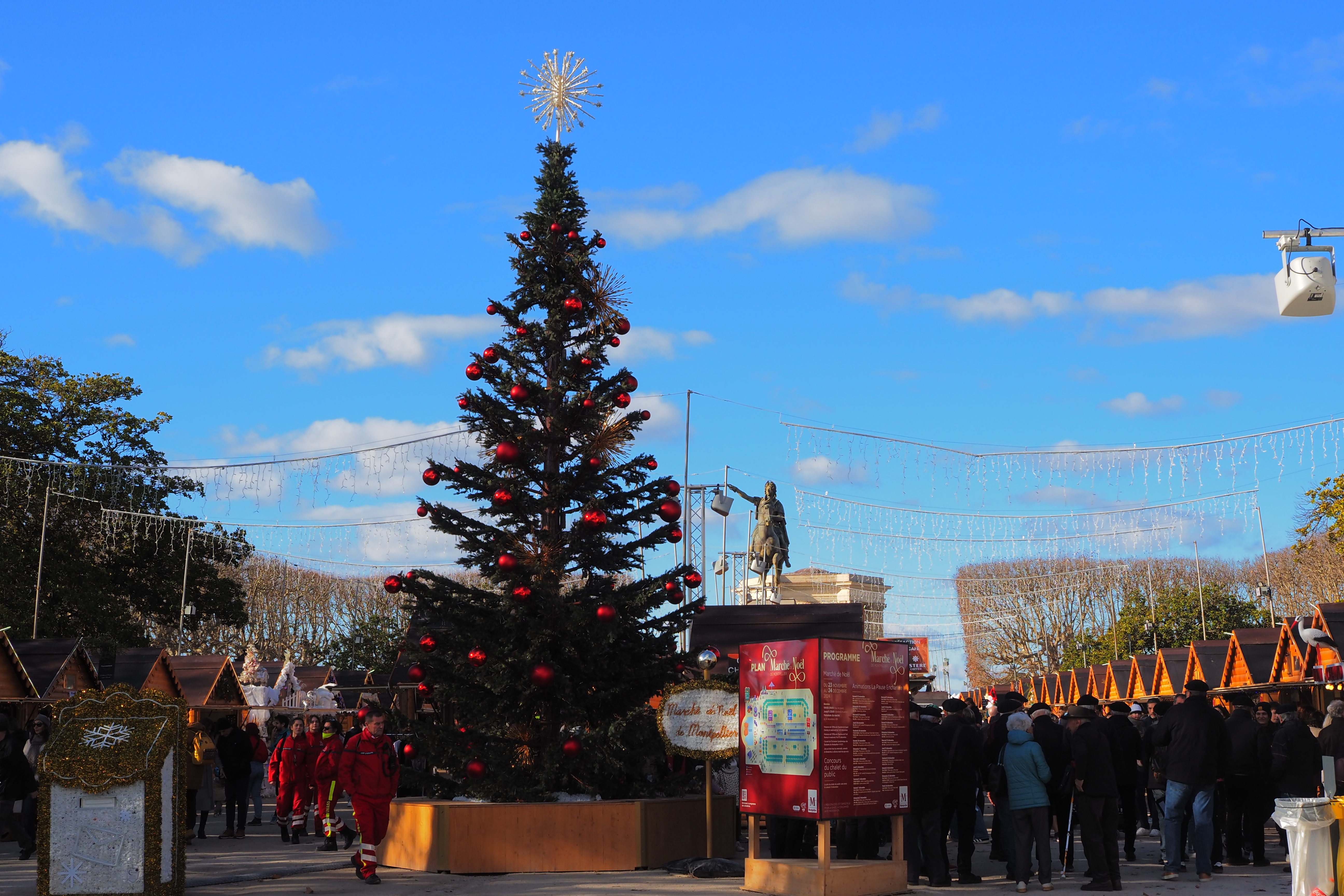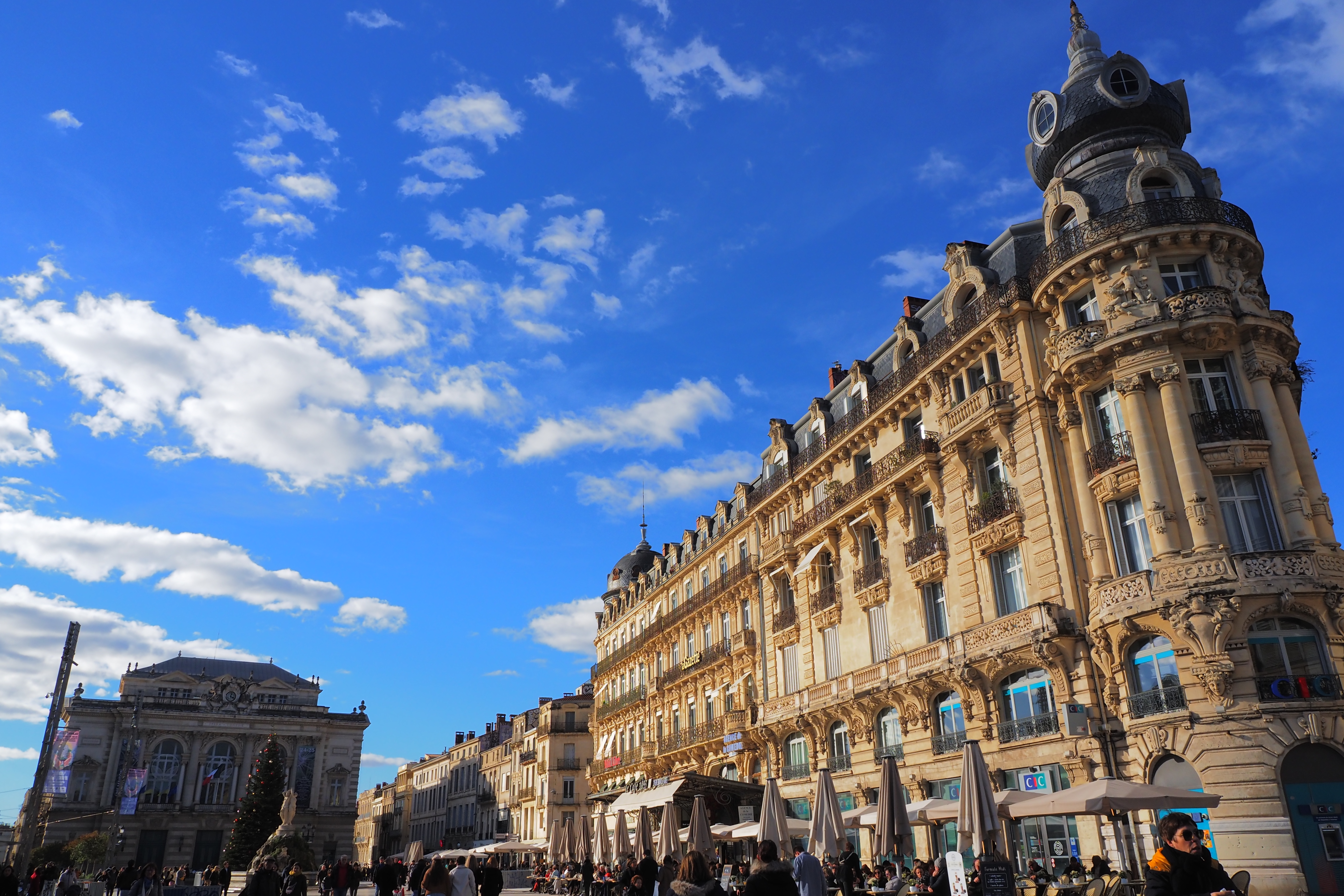 奥に見えるのが1888年落成の Opéra Orchestre national Montpellier Occitanie; モンペリエ国立歌劇場 で、まるで古い潜水スーツみたいなドームと豪奢な装飾が映える建物がズドンと建ってる。青空とブルジョワ建築の外壁がなんともいえないコントラストで👍