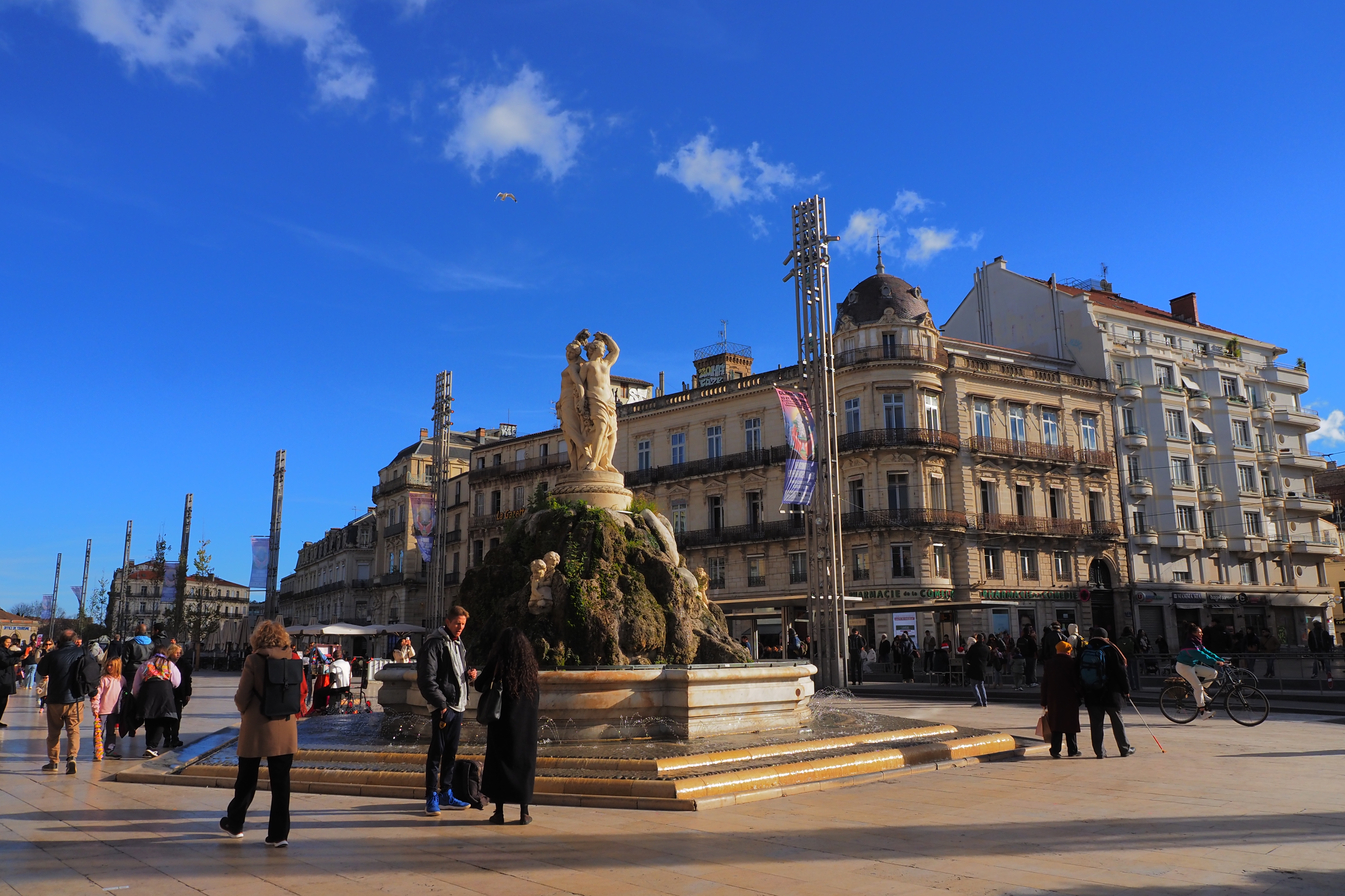 Fontaine des Trois Grâces; 三美神の噴水を中心に長楕円に広がる広場で 沢山の人で賑わってる。