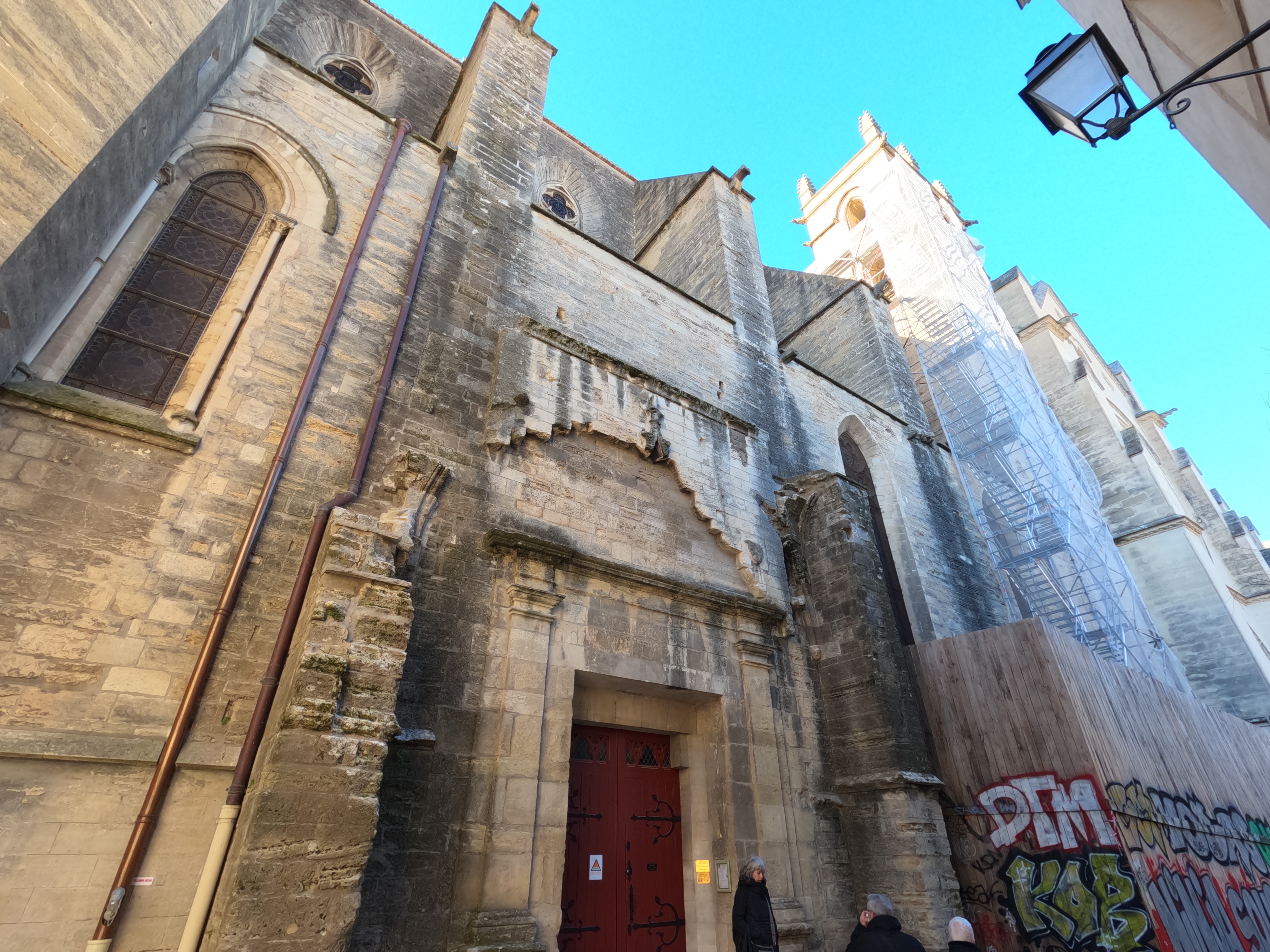 Cathédrale Saint-Pierre de Montpellier; サン・ピエール大聖堂にやってきた。14世紀にあったずっと小規模な礼拝堂が1536年に大聖堂へと昇格、その後の戦争による破壊と17,19世紀の大規模な改修や拡張を経て 現在みられる要塞のような姿になった。現在もモンペリエ大司教区の司教座がある。