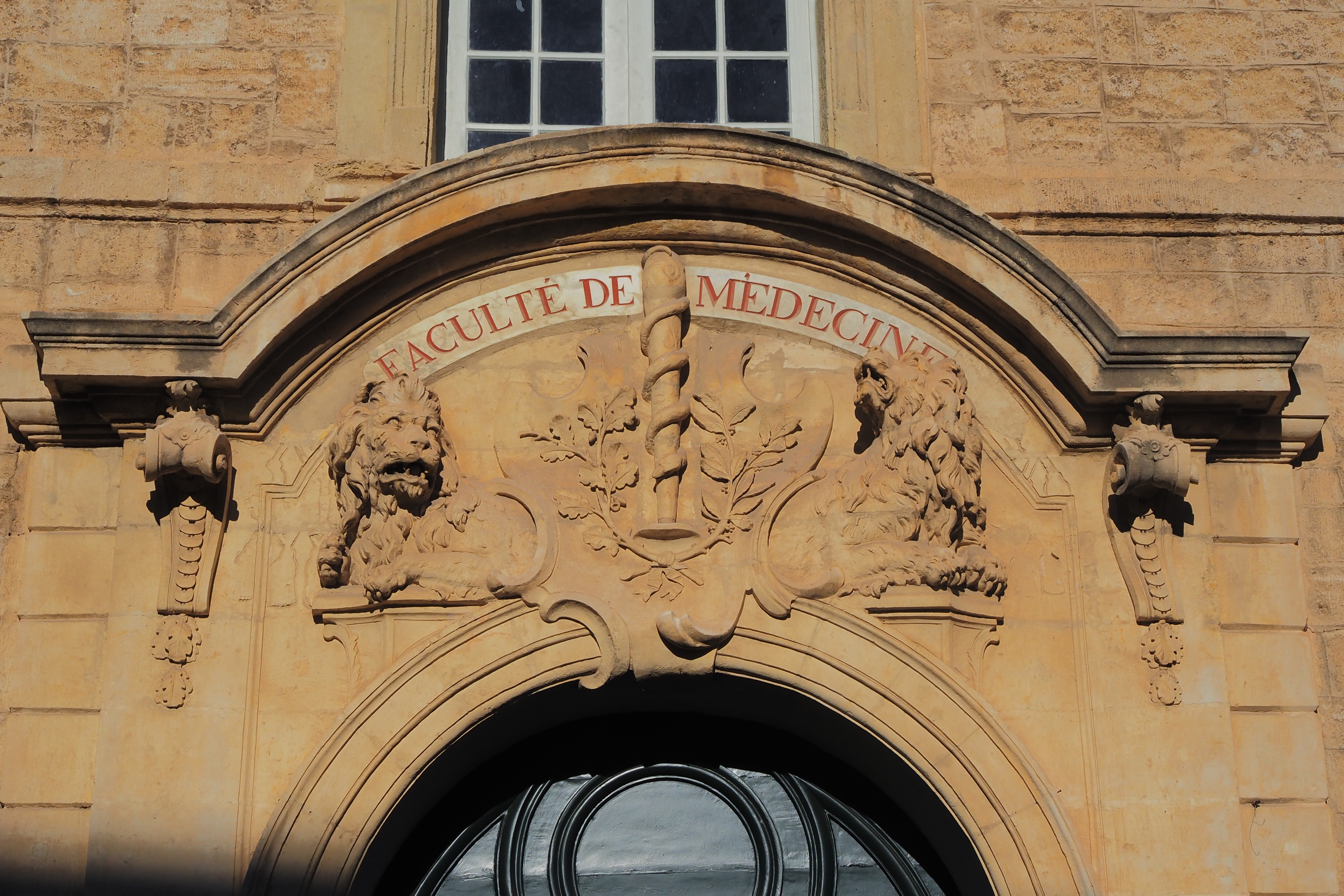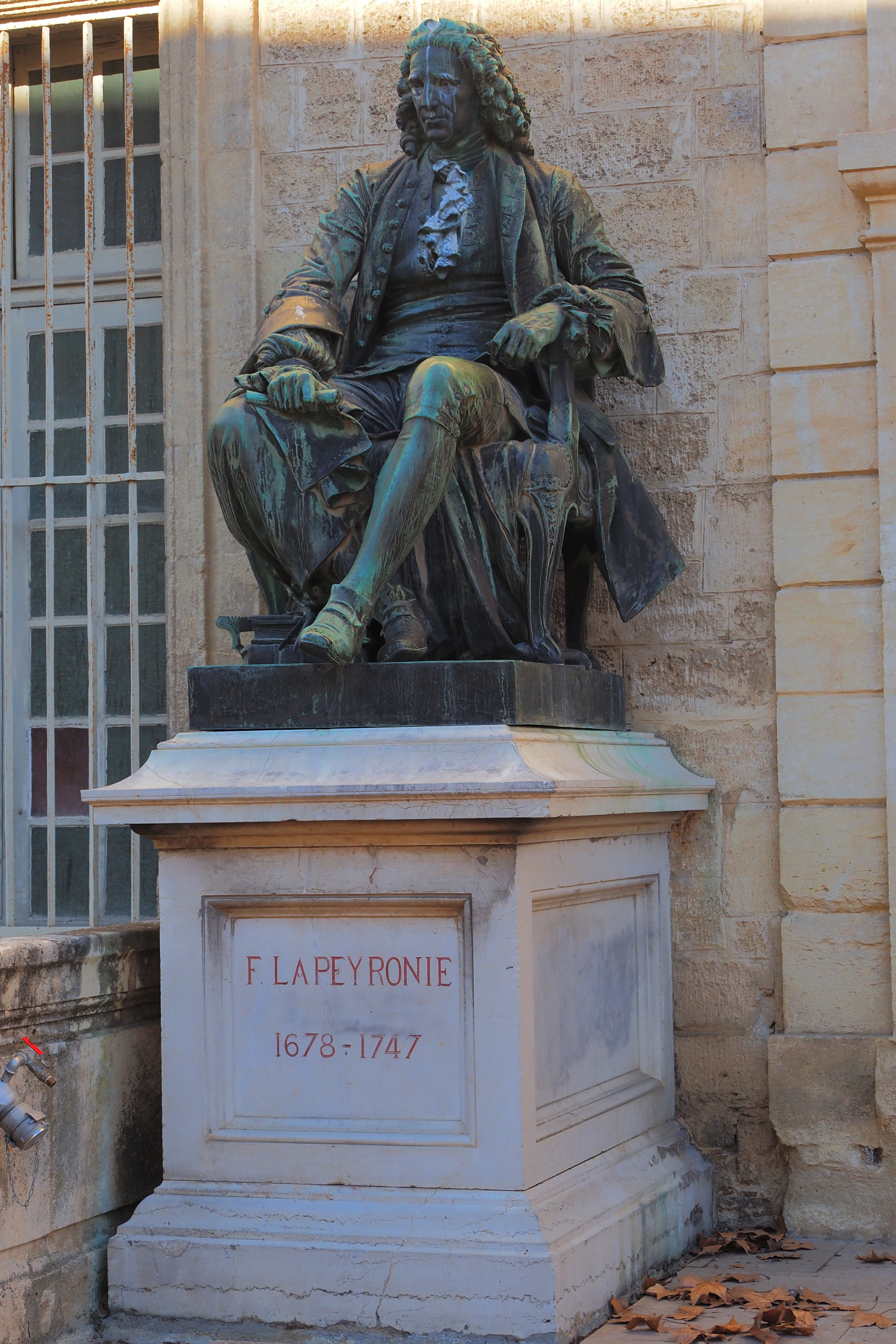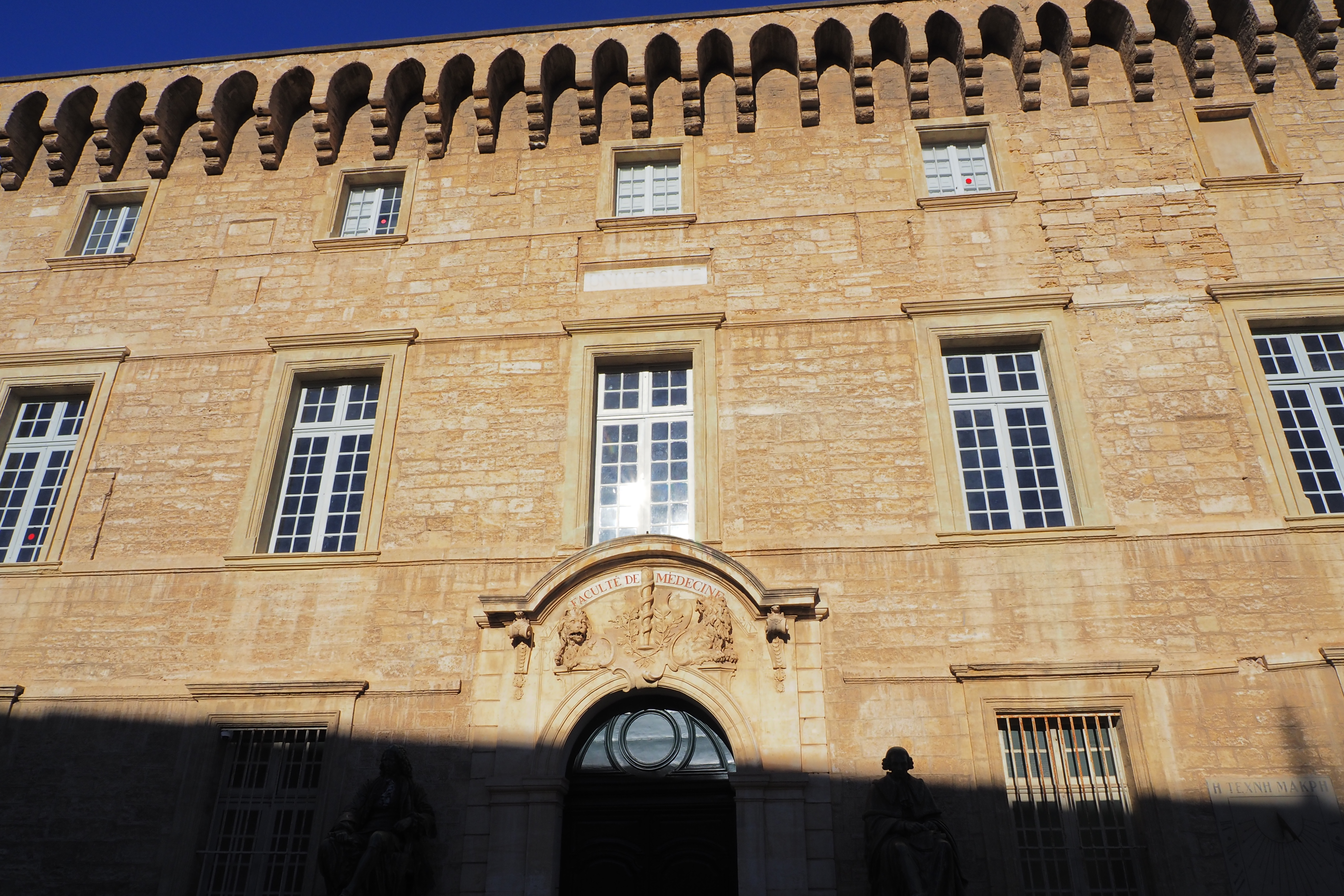 入口前には、モンペリエ大医学部卒の偉大な外科医 François de Lapeyronie と、生理学者 Paul-Joseph Barthez の像が並ぶ。