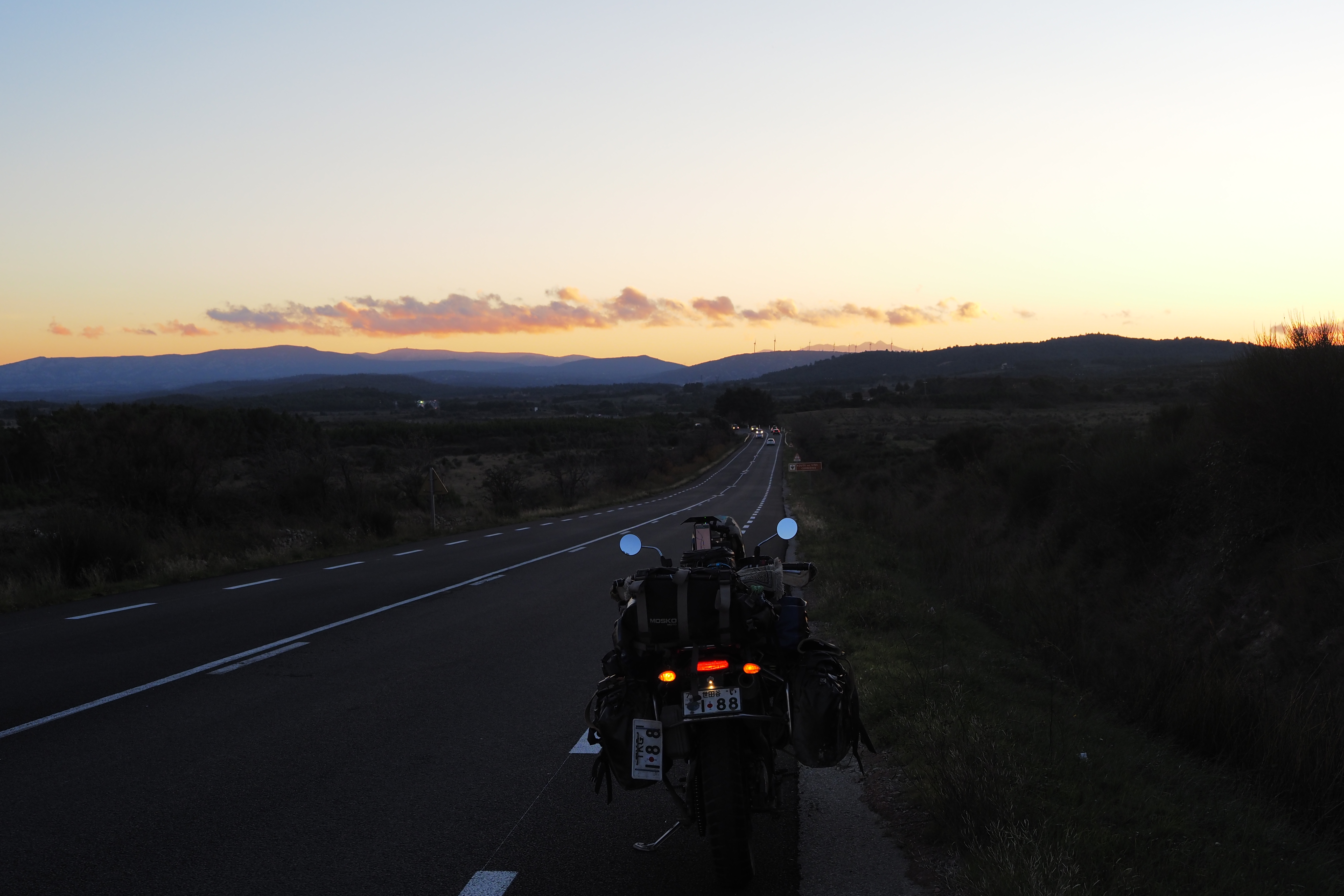 国境手前にて暗くなってきたから、近くで野営地を探すも さすがに南仏海岸付近だと 誰にも発見されないで済みそうな場所が絶望的に見つからない。キャンプ場に行ってみても人がおらず、はたはた困り果てて、最終的に小さな工場町のような場所で 超絶狭いワンルームをとることができた。
