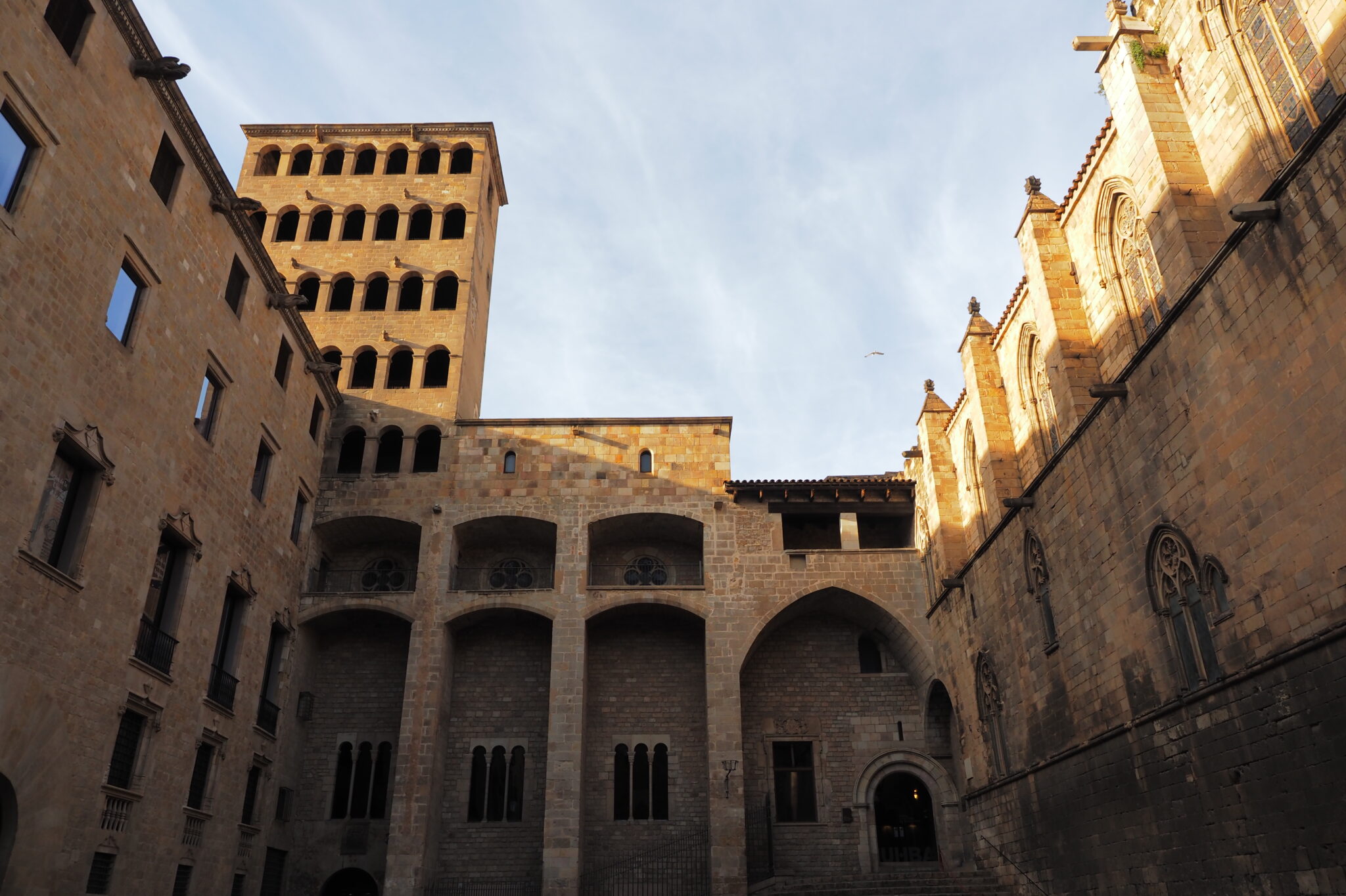 大聖堂のすぐ東側に隣接する Plaça del Rei; 王の広場。正面はかつての王宮 Palau Reial Major で、東側には王室専用の礼拝堂 Capella de Santa Àgueda; 聖アガタ礼拝堂と Torre del palau reial; 王宮の塔が聳える。