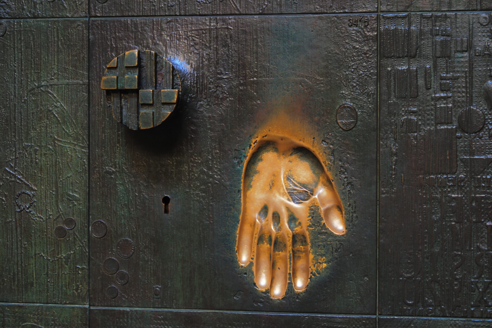 「訪れた人々が歴史に触れる」、体験的なアートを取り入れたらしい。思惑どおり、多くの人が触れることで、手形の部分だけ真鍮の黄金色が露出してる。