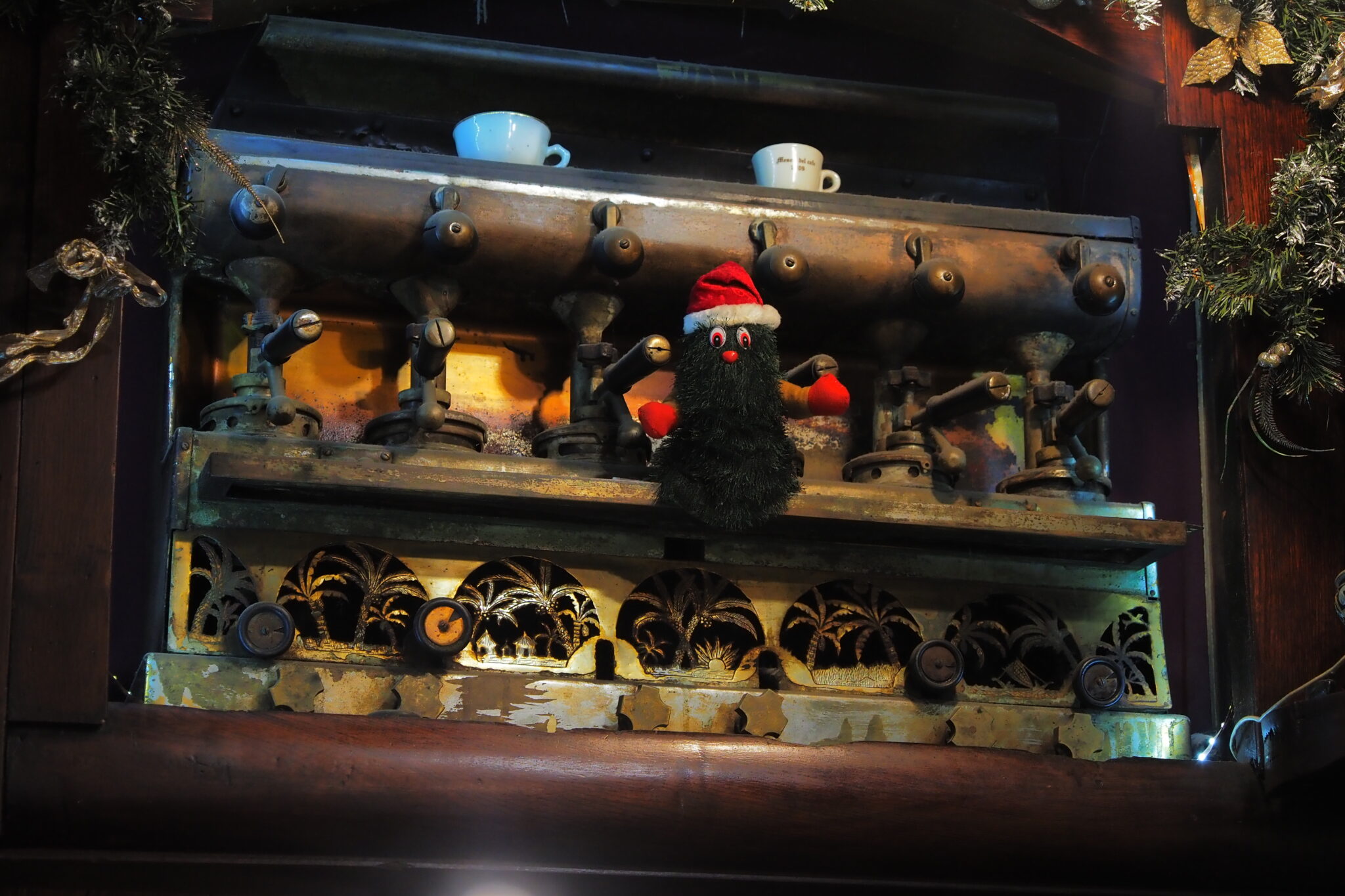 暗めな照明、木造の調度品、カウンターにならんだやれたラベルのボトルたち、、、そして頭上に鎮座する100歳越えのコーヒーマシン・・・全てが調和して最高な雰囲気を醸し出していた。