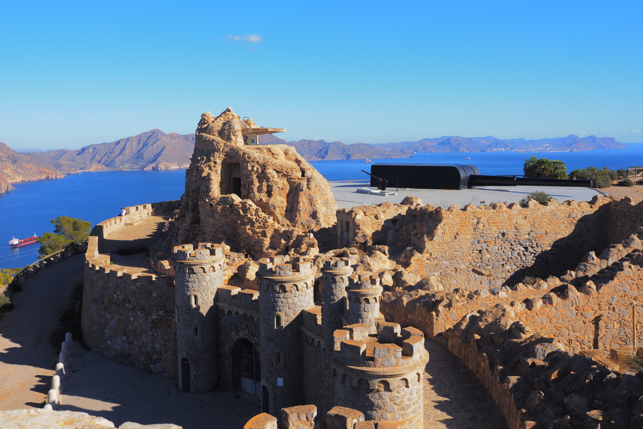 城郭の頂上部分に今でも安座する ビッカース砲 381/45。1 t の砲弾を35km まで砲撃する威力を持っていたらしい。