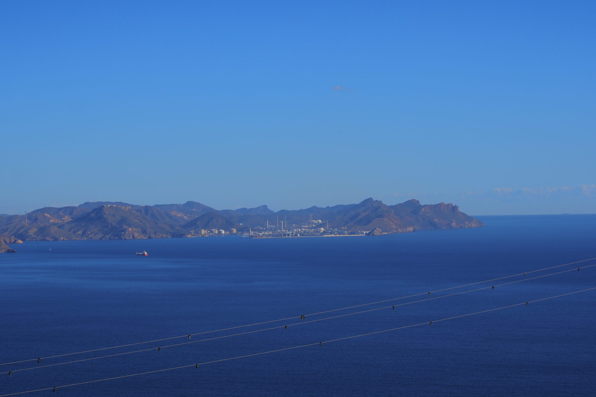 北側の岬の先端には Repsol が運営する Cartagena Refinery という石油精製プラントがみえる。