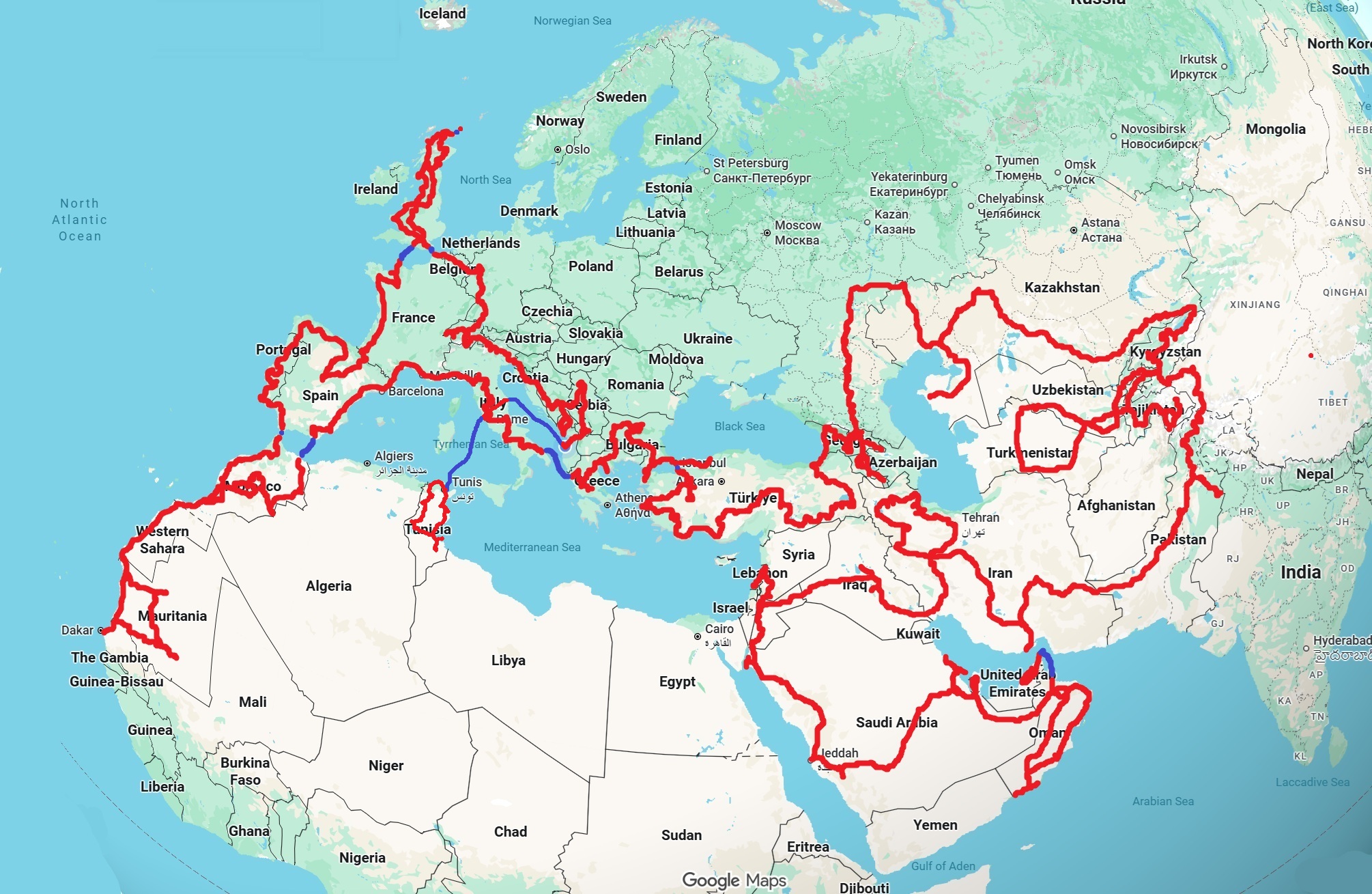 “Blog” は現在更新12カ月遅れのため、出発から現在に至る最新のルート図をここに載せます。